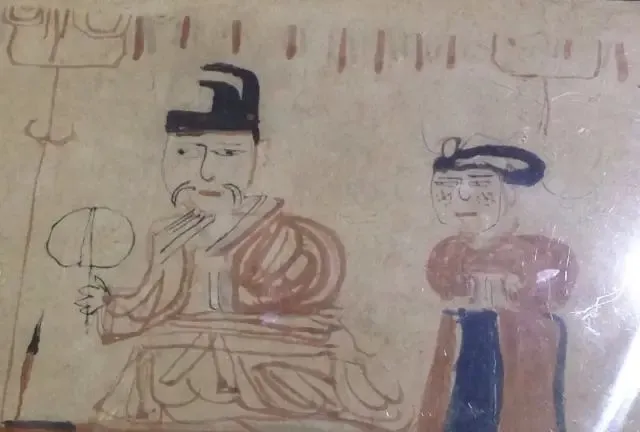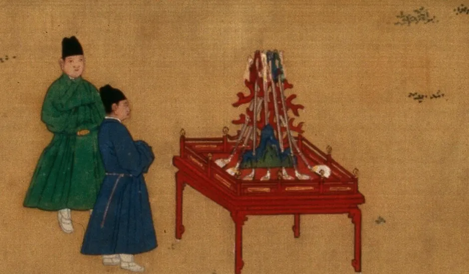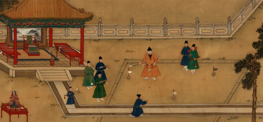 这幅明宣宗行乐图中,明宣宗正拿着一根小棍瞄准地上一枚弹子