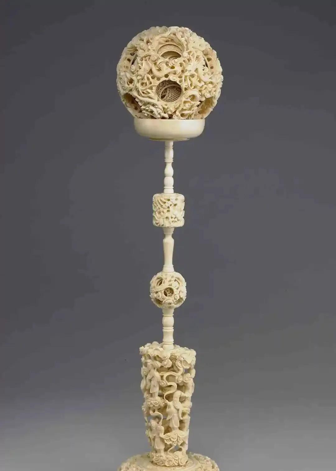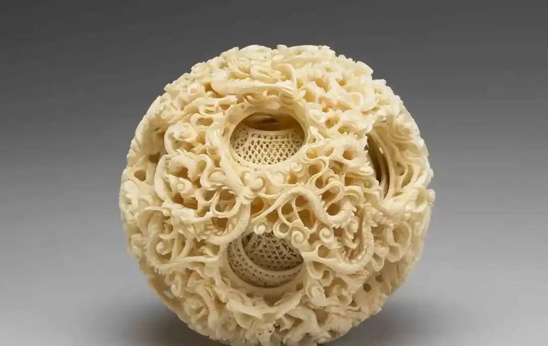 这件在台北故宫展出的清代云龙人物转心象牙球具有17层,每一层都活动自如,上面雕刻着人物和龙纹图案。