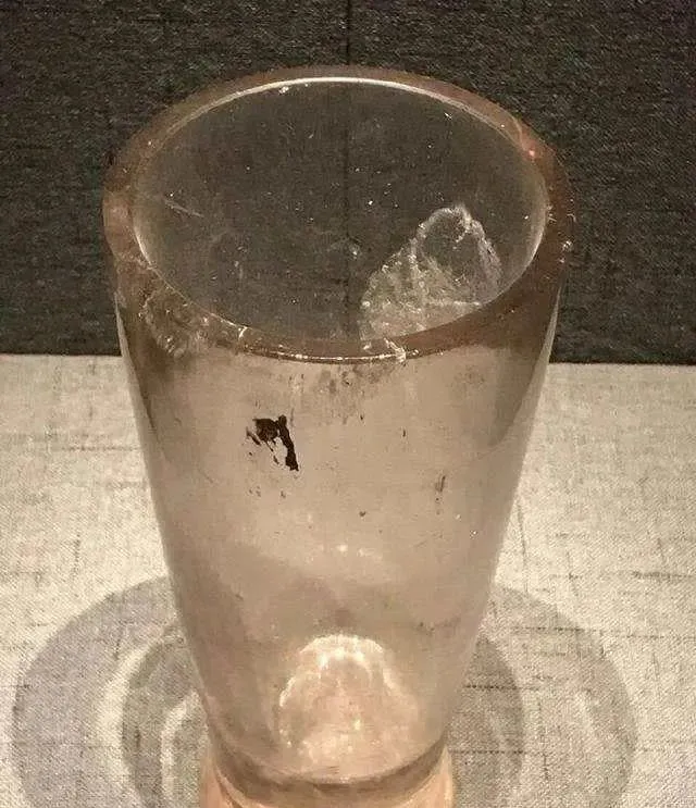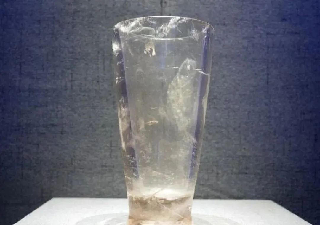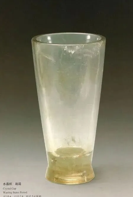这件战国水晶杯收藏于杭州博物馆,水晶杯高15.4cm,口径7.8cm,底径5.4cm,外表简洁,在杯底部有棉絮状自然结晶。
