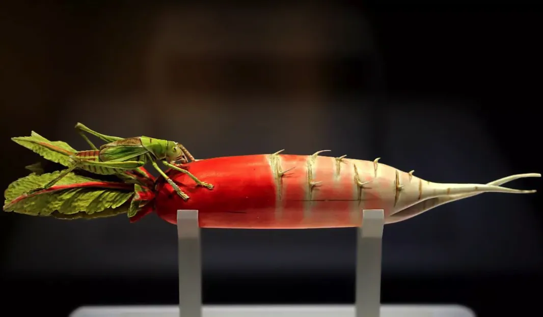 这两件清朝雕刻的萝卜和白菜,色泽鲜艳,经久不褪,使人难以置信。