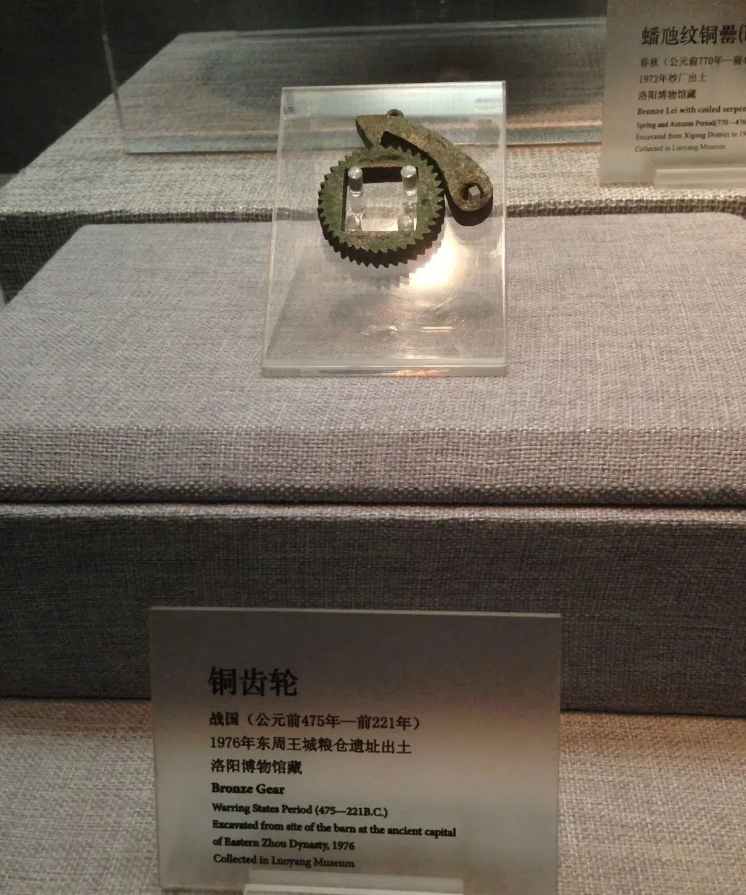 这是洛阳博物馆收藏的战国齿轮与西周车配件