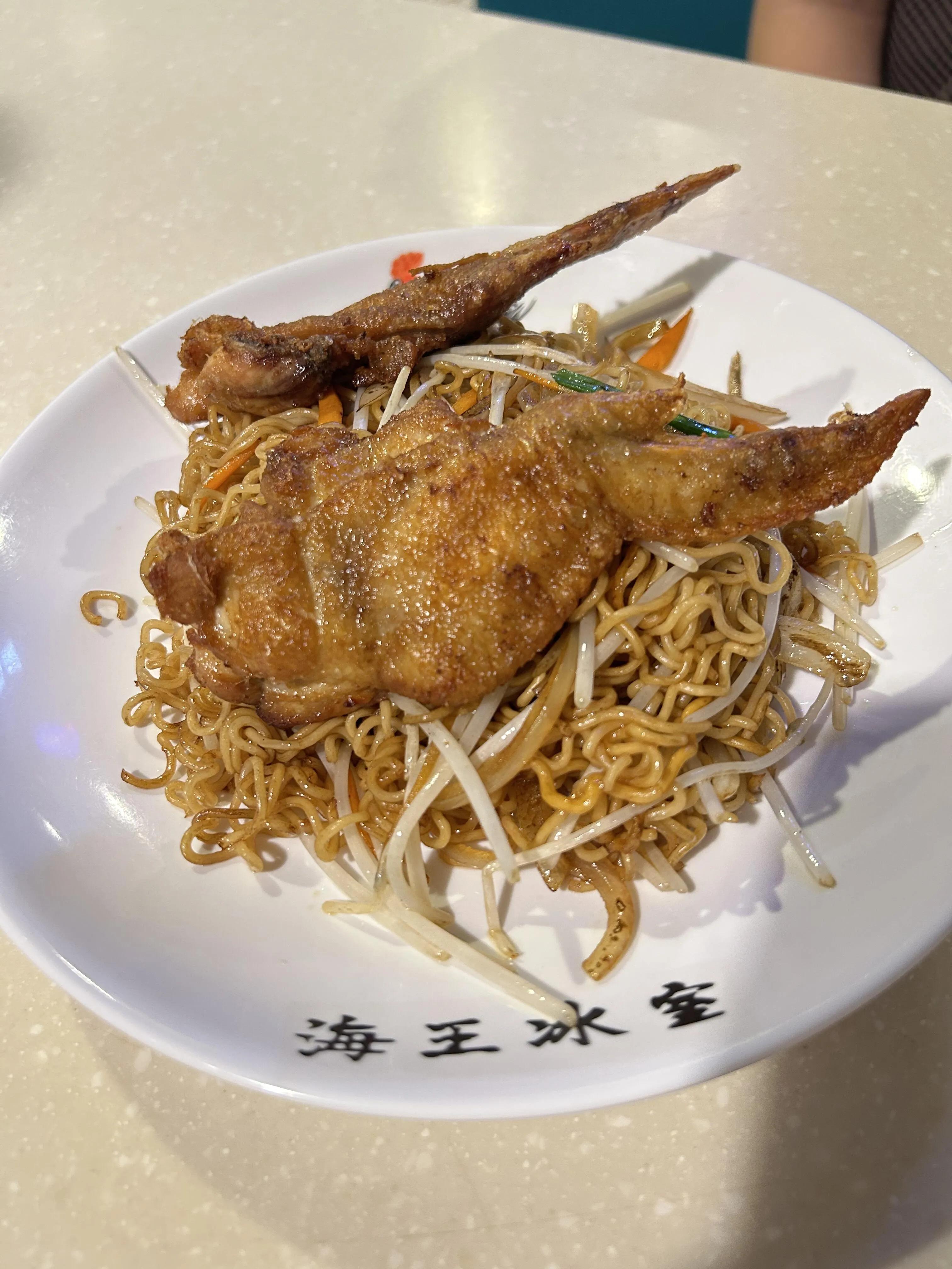 海王冰室的菠萝猪扒包令人惊喜 。面包新鲜,猪扒煎制恰到好处,整体品质远超广州大部分预制包。招牌无骨鸡翅炒面味道不错,但略显油腻。