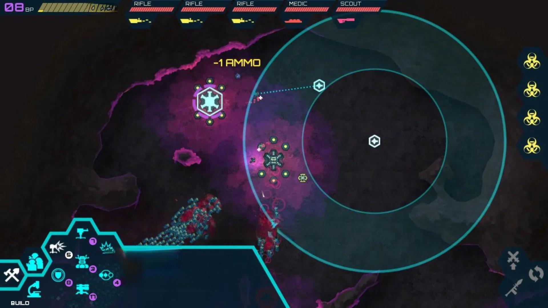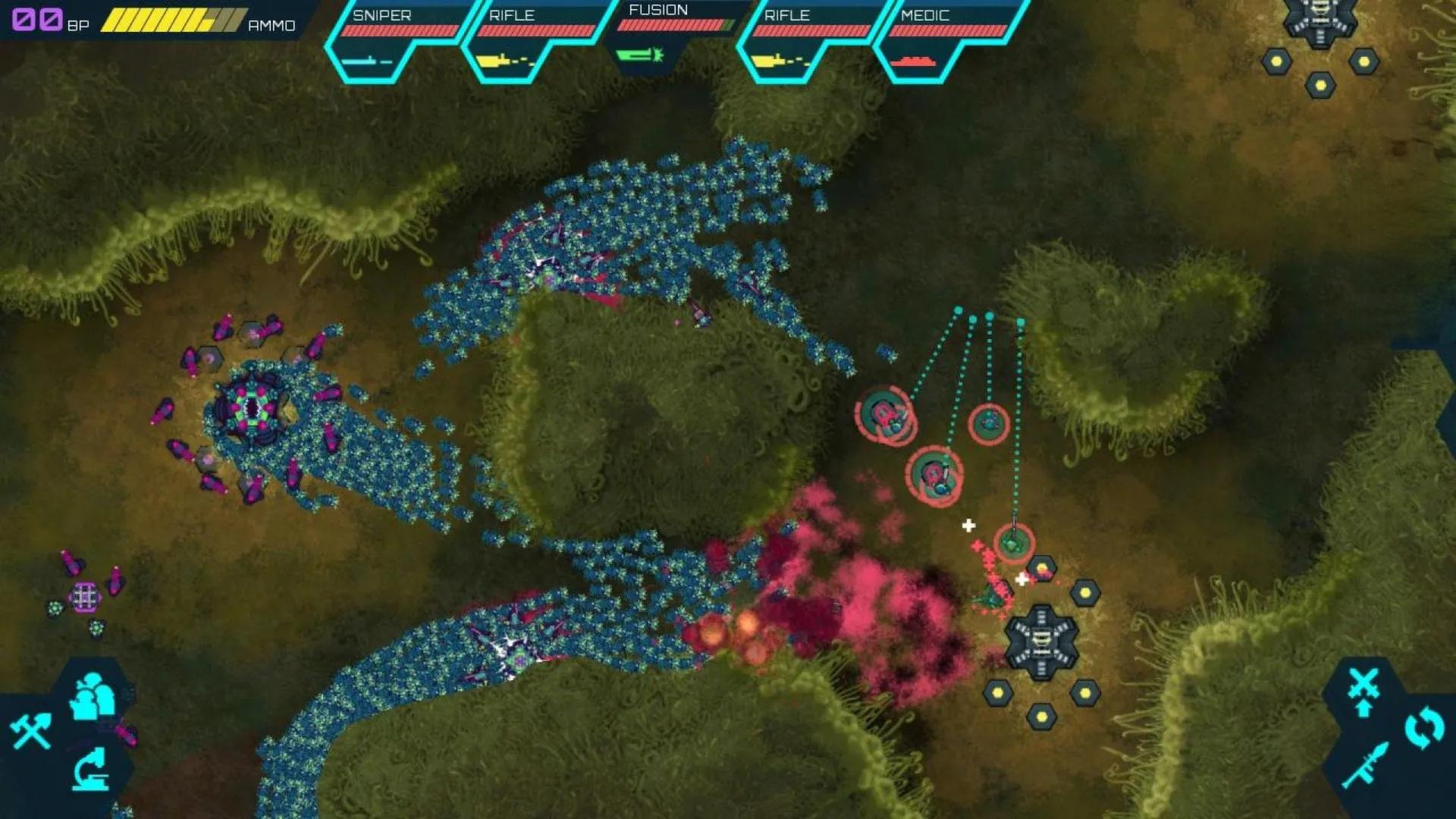 《虫群围攻》的策略深度体现在多个方面。首先,玩家需要在有限的资源下做出选择:是建造更多的士兵,还是升级现有士兵的能力?其次,游戏中的地形和战略点的位置都会影响战斗的走向,玩家需要灵活运用这些因素来制定战术。此外,游戏还引入了“变异”机制,敌人会根据玩家的行为进行适应性进化,如进化出抵御火焰攻击的能力。这要求玩家不断调整策略,保持游戏的新鲜感。