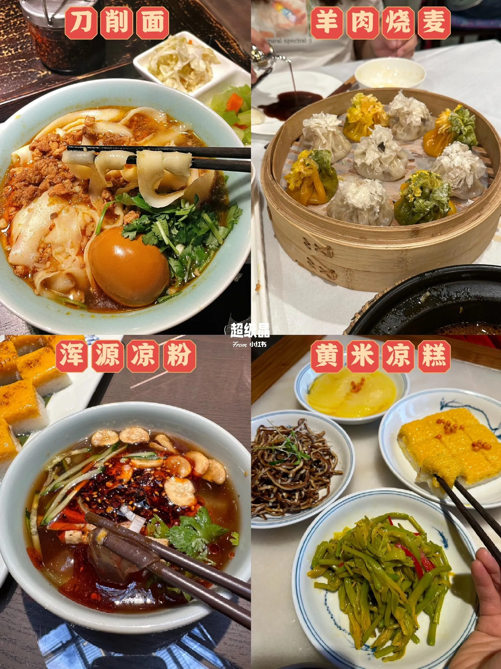 烧麦、凉粉、豆面、刀削面、粉羊杂、黄花菜、黄米凉糕、沙棘面包……问问路边的人,他们会热心地告诉你哪里好吃。