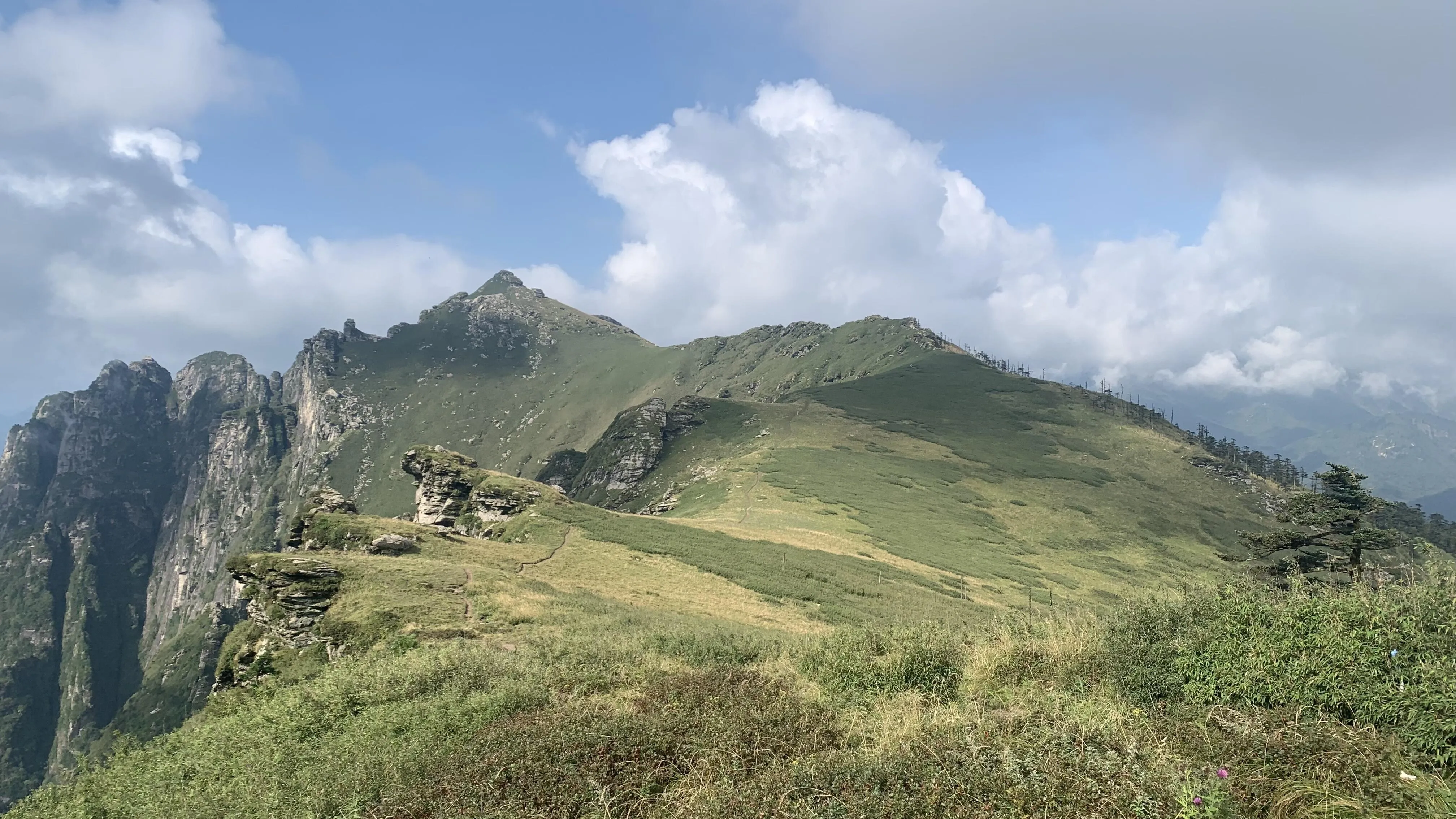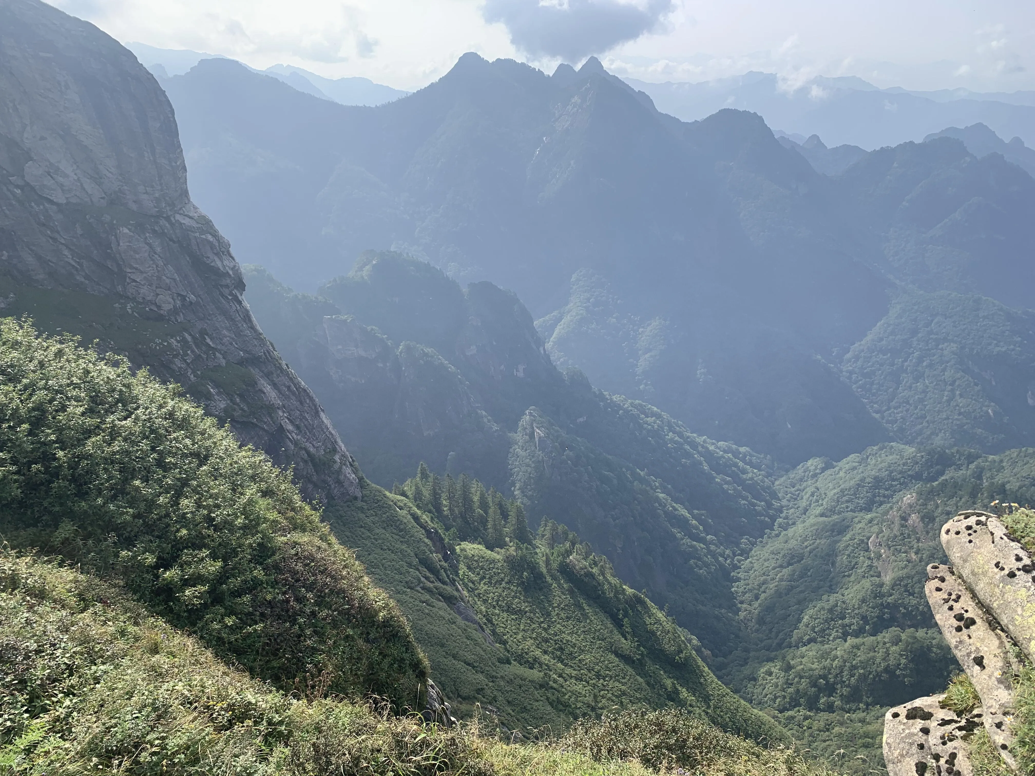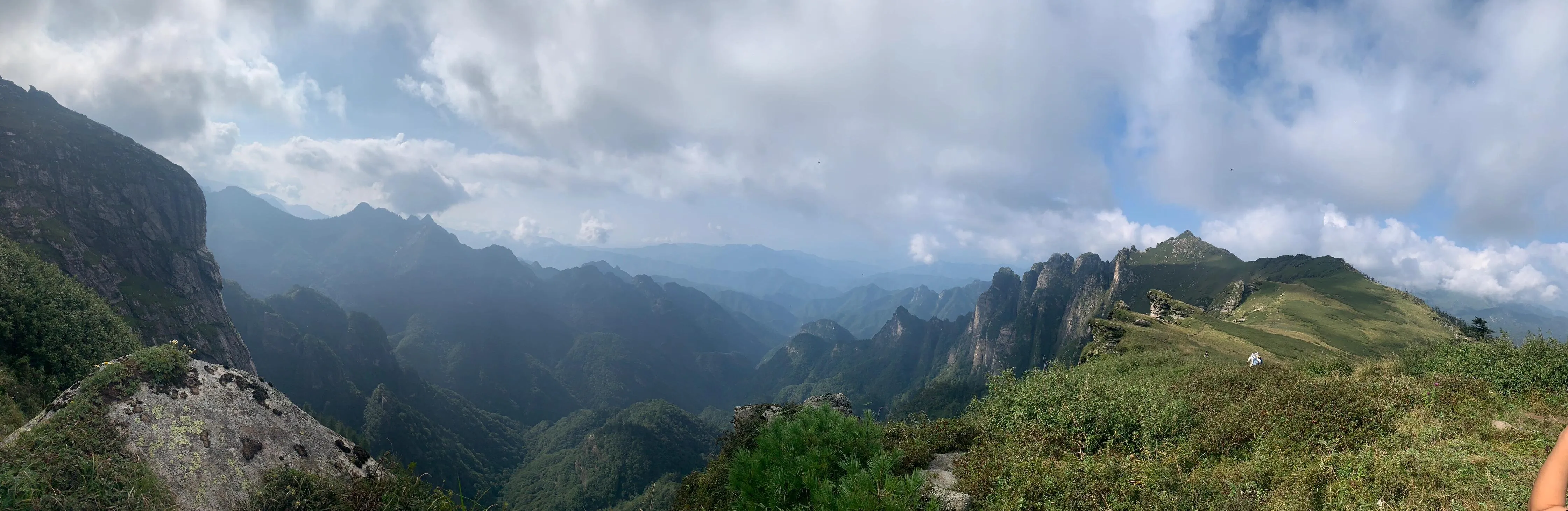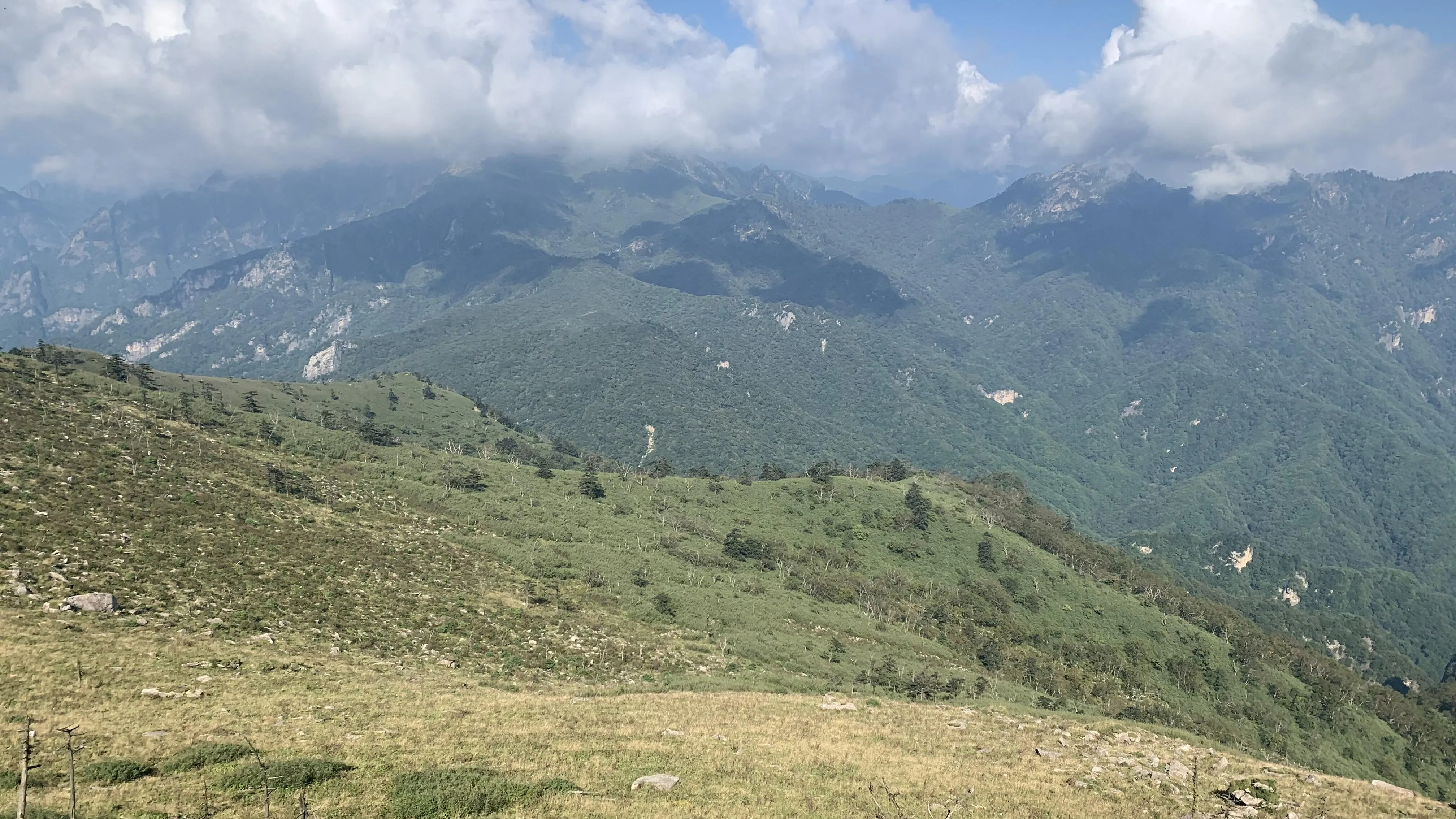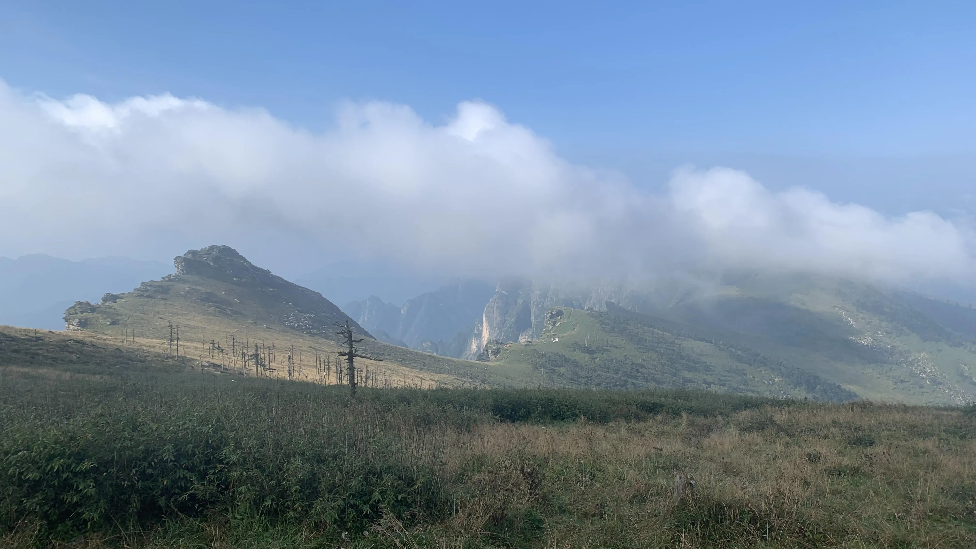当雾气散去,眼前的景色令人惊叹。 巍峨的秦岭山脉中竟然藏着这样一片美丽的草甸 。草甸平铺山野,一路延伸至云霄,又或是在悬崖边戛然而止,形成独特的地貌景观。