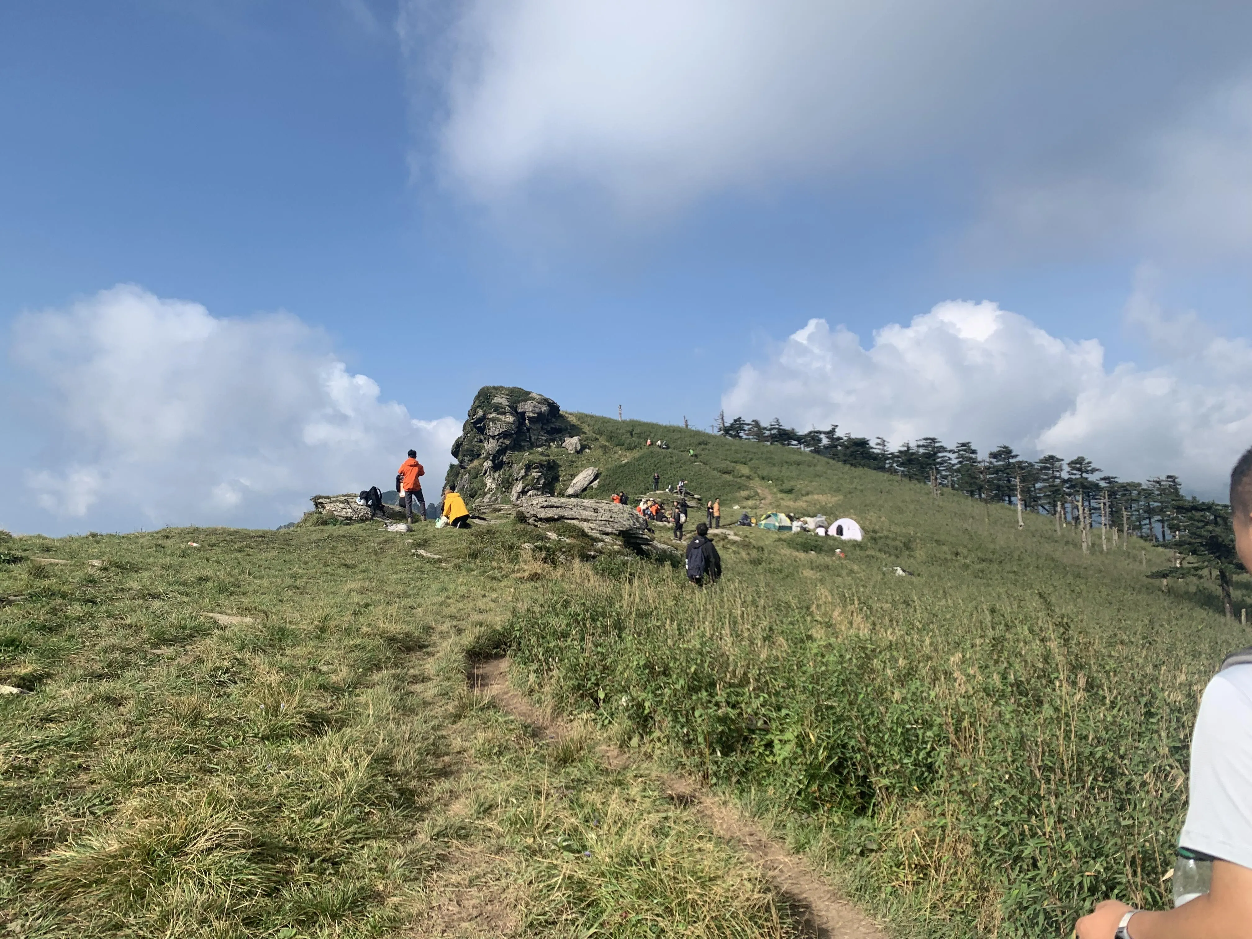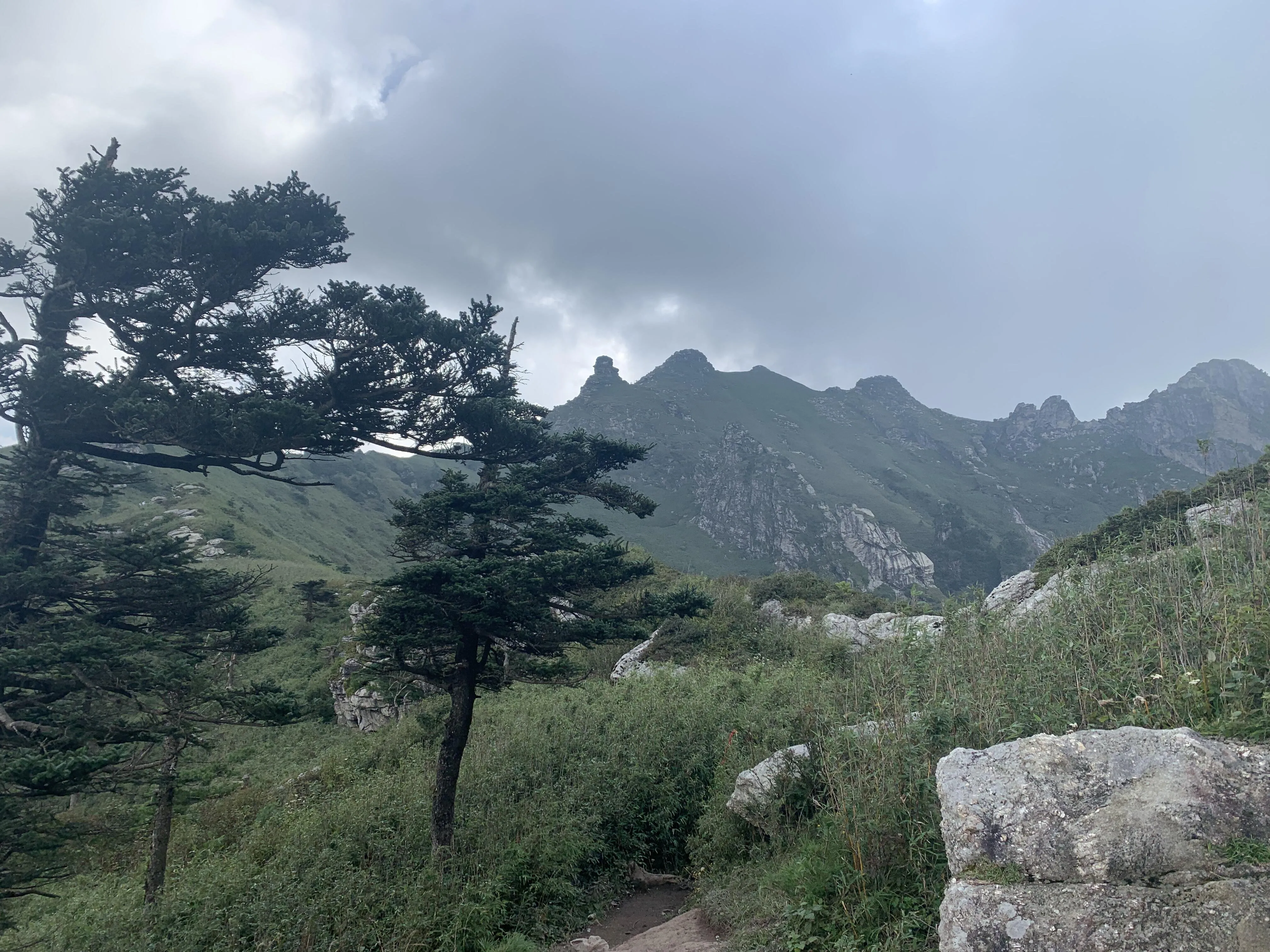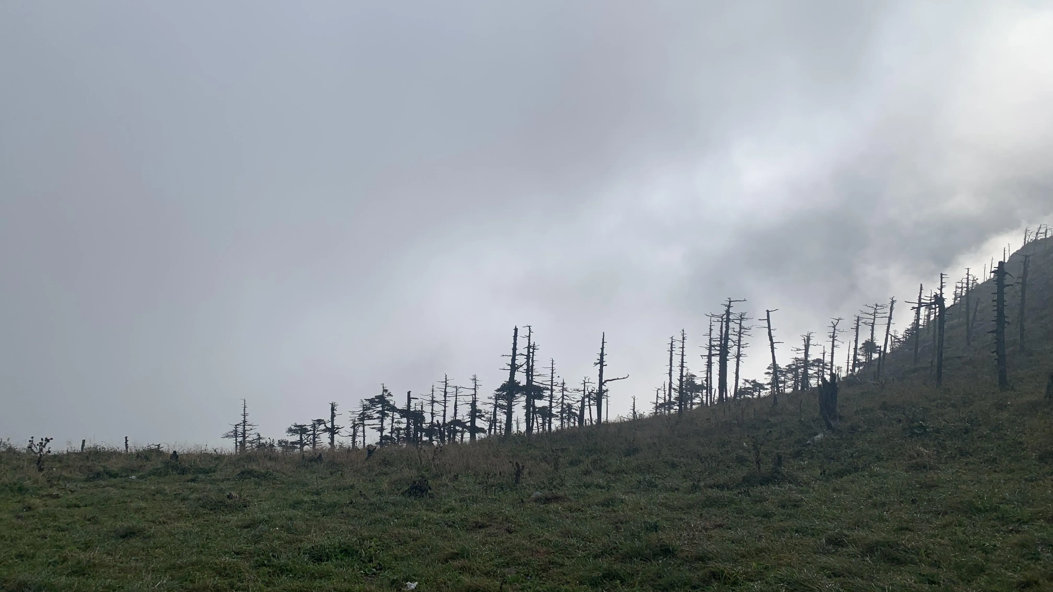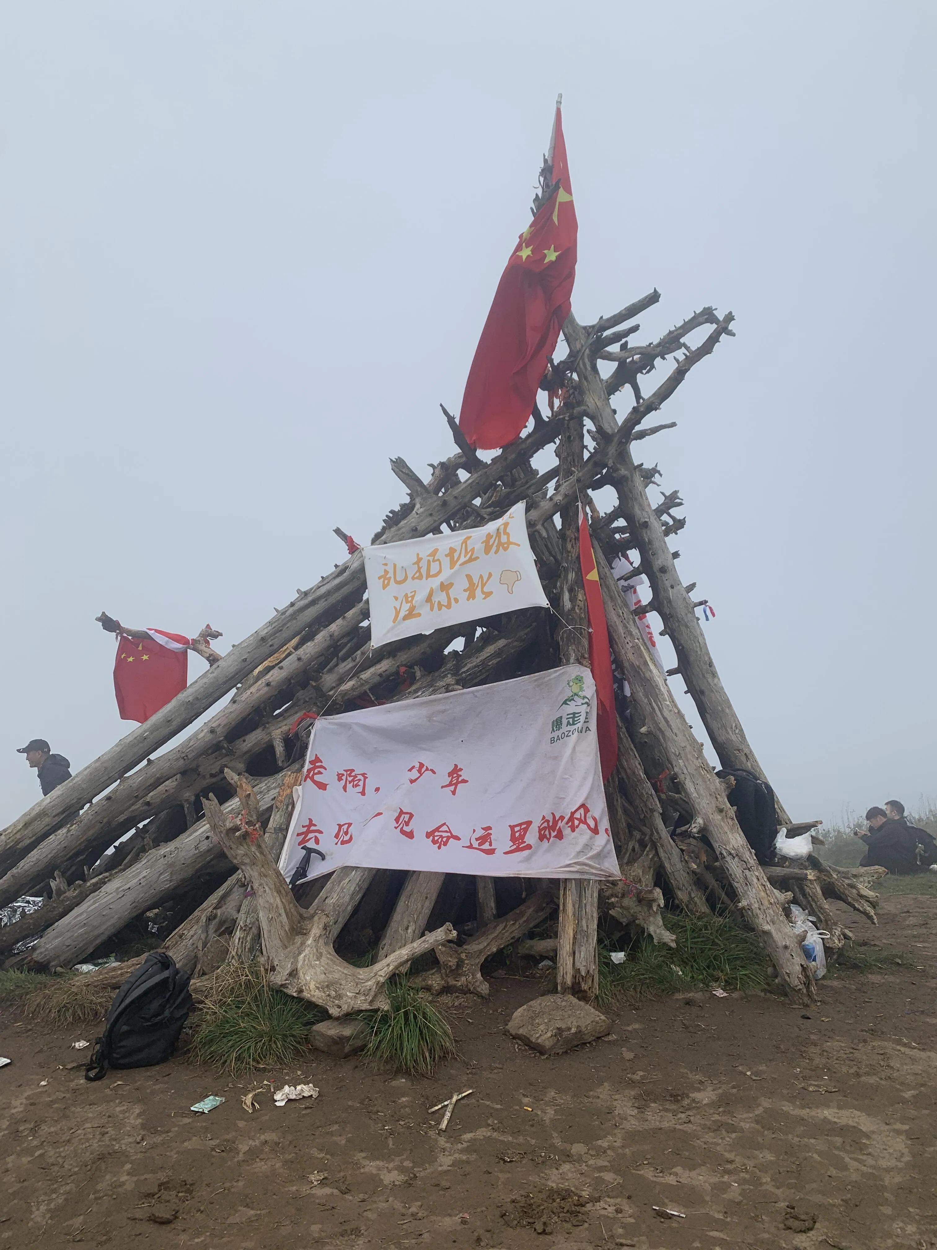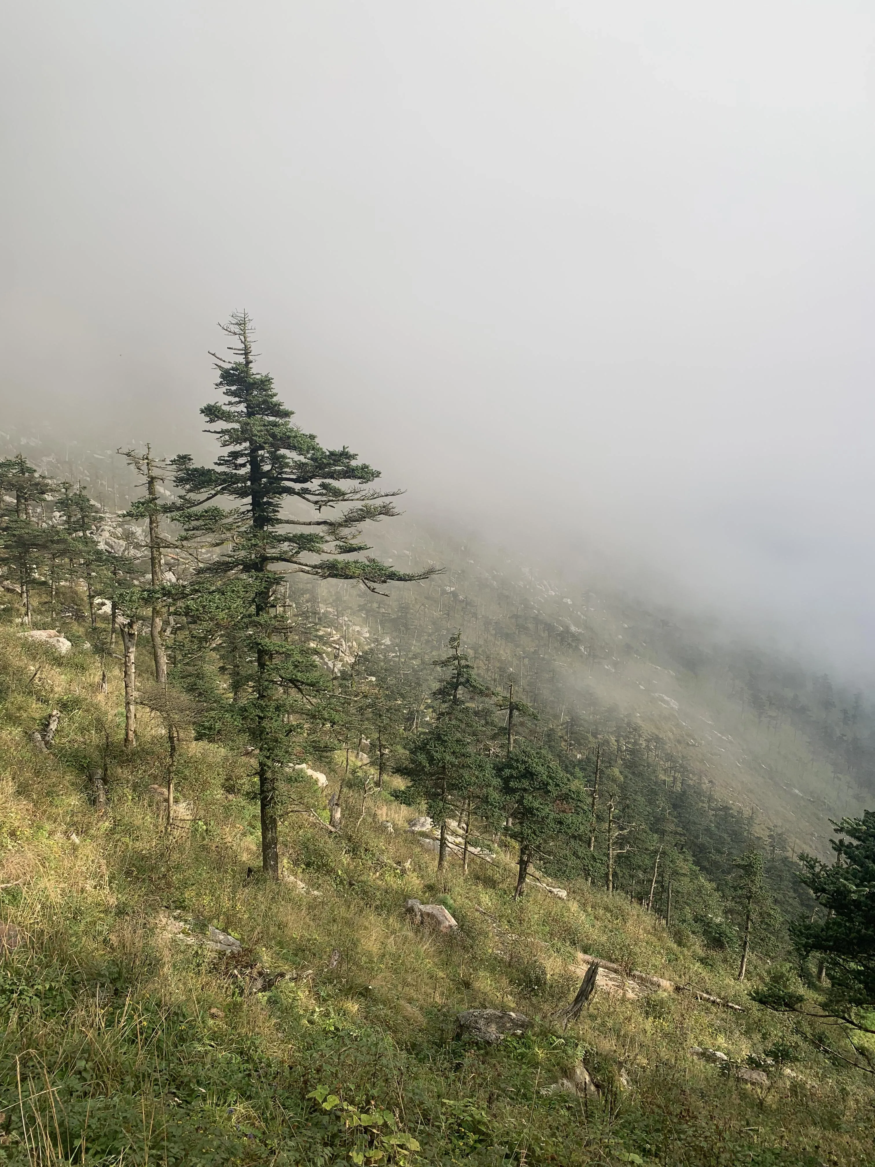 登顶光头山后,虽然初秋时节杜鹃花已经所剩无几,但松树依然傲然挺立。 夜幕下的光头山被雾气笼罩,呈现出一种神秘的美 。