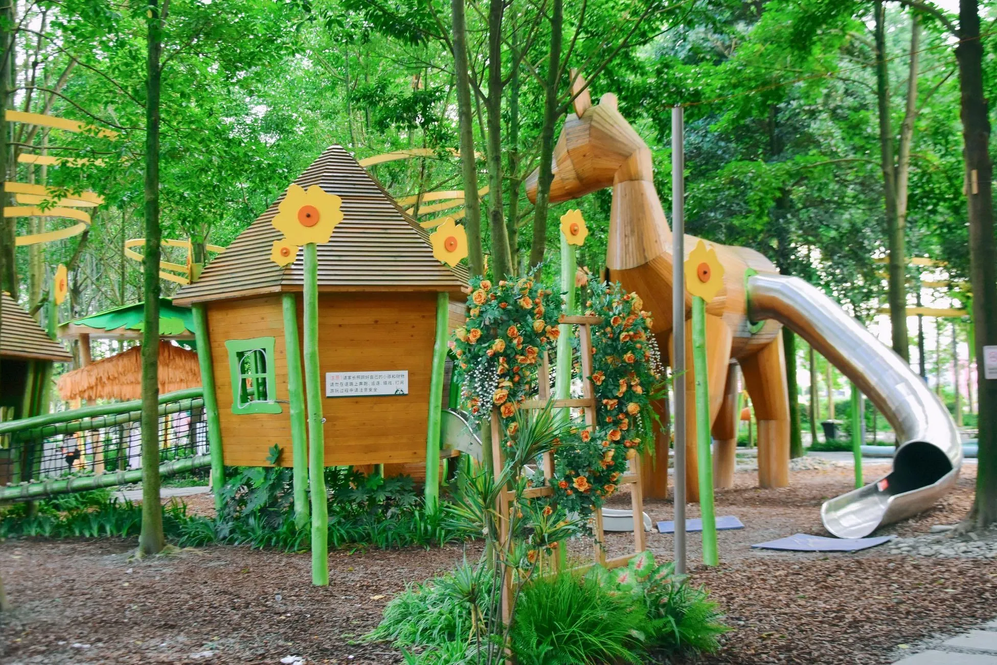 鹿尔花园的游乐设施丰富多样。园区内设有20多项高颜值的无动力设备,巧妙地隐藏在森林中,为儿童提供了充满乐趣的探索空间。成年人则可以享受多种娱乐选择,如打麻将、掼蛋、台球,或是在林下观看电影、唱K、品茶聊天。此外,园区还提供石膏娃娃彩绘和奶油胶制作等创意活动,让游客可以放松身心,尽情发挥创意。