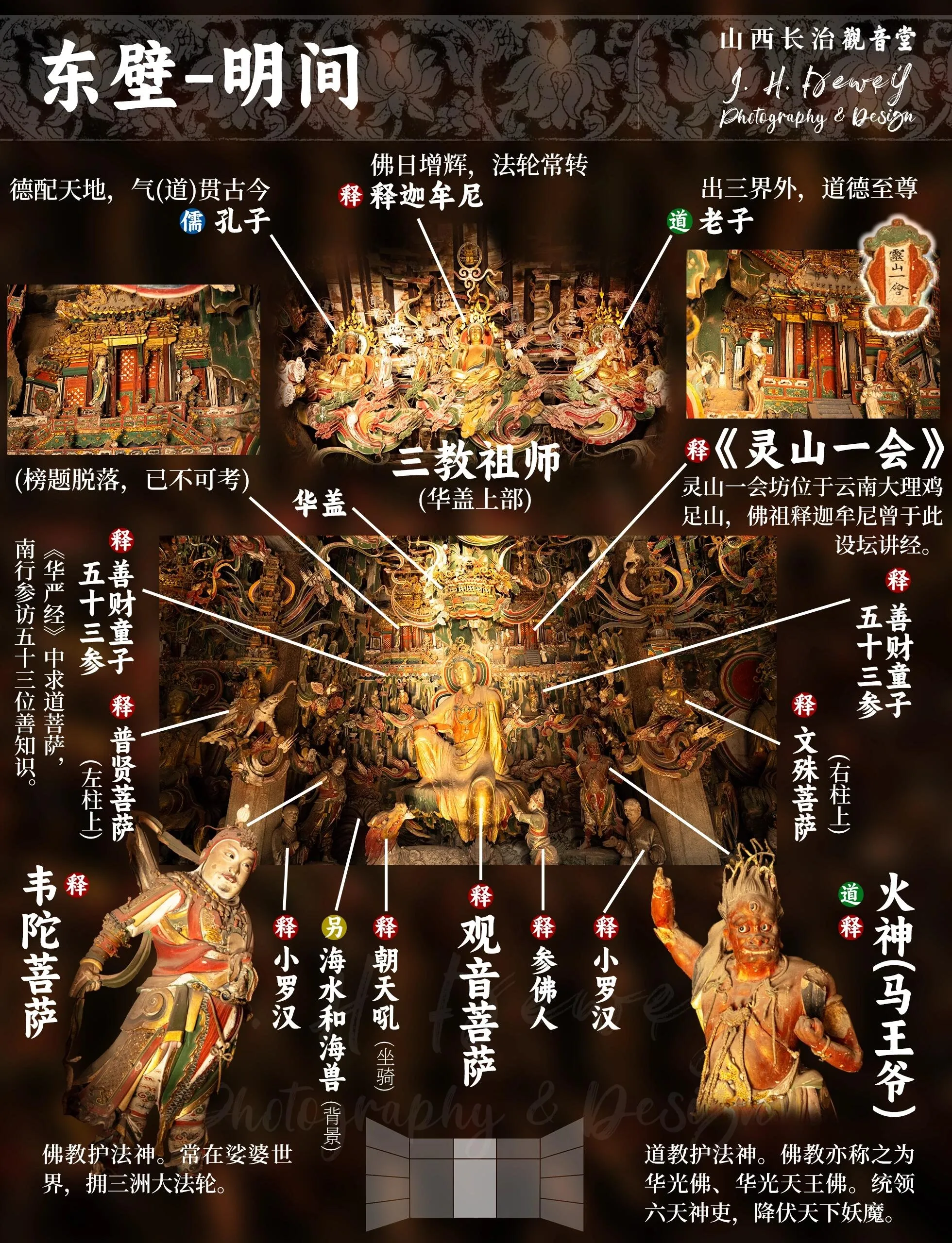 这份导览图包含了观音堂几乎所有主要塑像的名称和位置,并对大部分塑像提供了简短介绍。我的目标是帮助参观者能够方便、准确地了解每一尊塑像。即使无法亲临现场的朋友,也可以通过这份图大致了解观音堂雕塑艺术的全貌。我还用“儒”、“释”、“道”、“另”四种小圆圈,标注了不同塑像的宗教归属,其中“另”指的是儒释道之外的民间信仰和传说。
