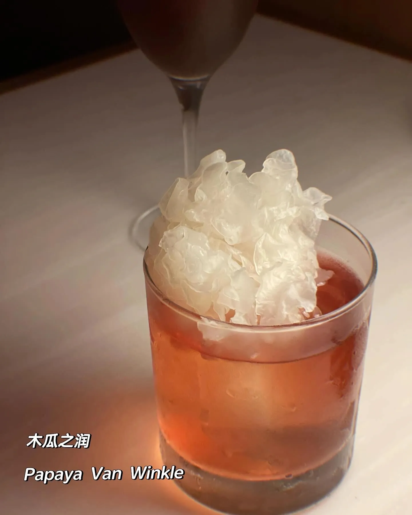 另一款我品尝的是Papaya Van Winkle木瓜之润(128港币)。这款酒包含木瓜酒、五味杂陈洛神花酒、N.I.P.氈酒、番茄和生姜。作为雪耳的忠实粉丝,看到图片就忍不住想尝试。入口后,木瓜雪耳糖水与鸡尾酒的碰撞,再搭配番茄糖浆,口感丰富多层,非常独特。