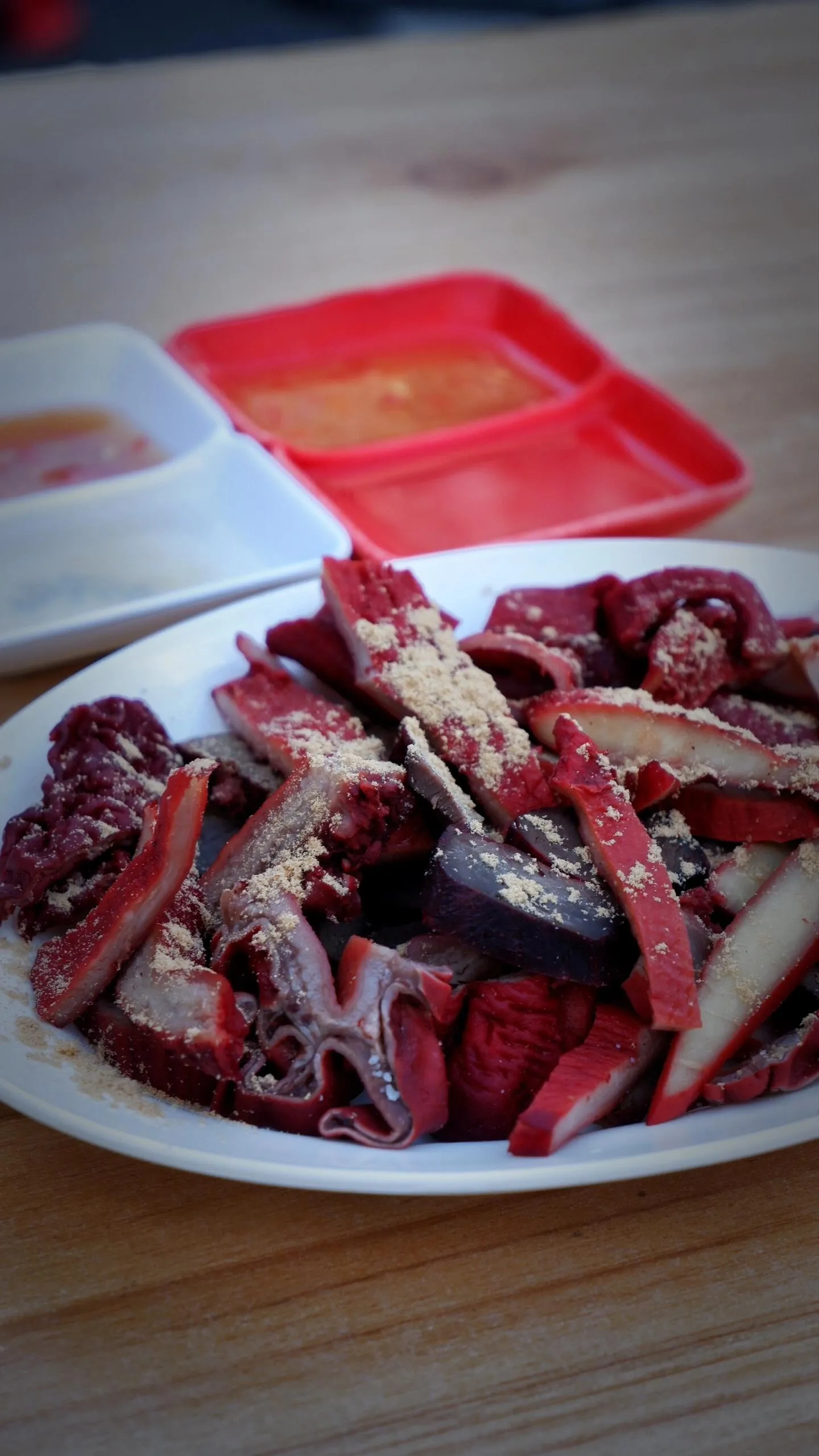这里的牛杂与广东其他地区不同,属于冷吃牛杂。表面的红色可能是加了红曲。牛杂口感偏硬,建议蘸蒜蓉酱食用,非常适合当下酒菜。