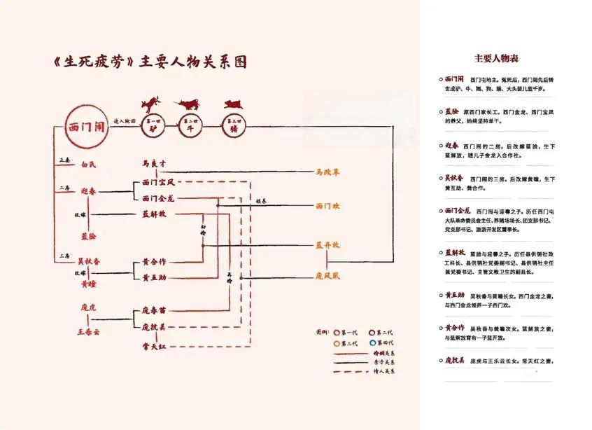 书中,主人公西门闹是一位乐善好施的地主,但因村民的冤屈而死于非命,心中满是怨恨。