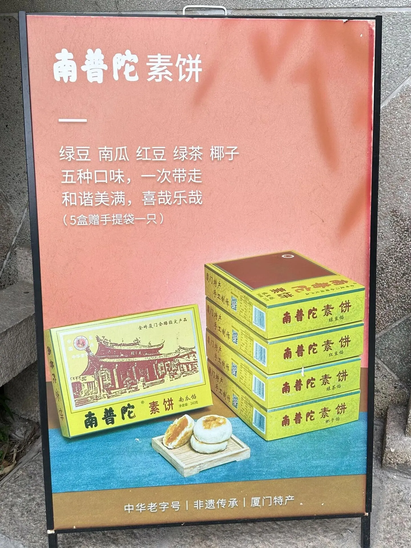 其中最受欢迎的是南普陀素饼,15元一盒,有不同馅料可选。如果购买数量较多,可以现场办理顺丰邮寄(运费自理)。