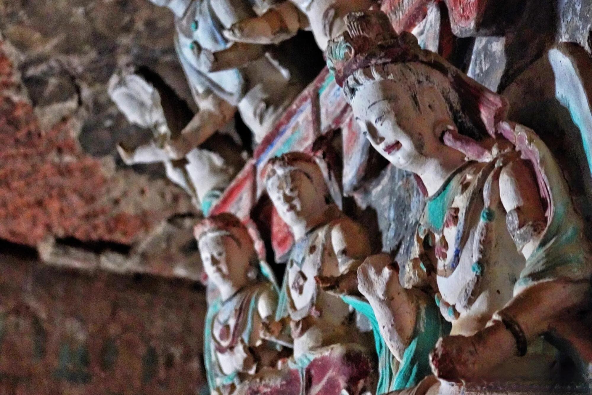 步入石窟,密密麻麻的雕像会让人瞬间震撼。 每个佛龛高约1.3米,龛楣两侧各有独特的肉身雕像。 石柱上的飞天雕像身姿轻盈,裙褶简洁自如,仿佛清风拂面。石柱四面龛顶楣拱两侧悬塑有3到4个飞天雕像,每一尊雕塑的神态各异,散发着神秘气息。