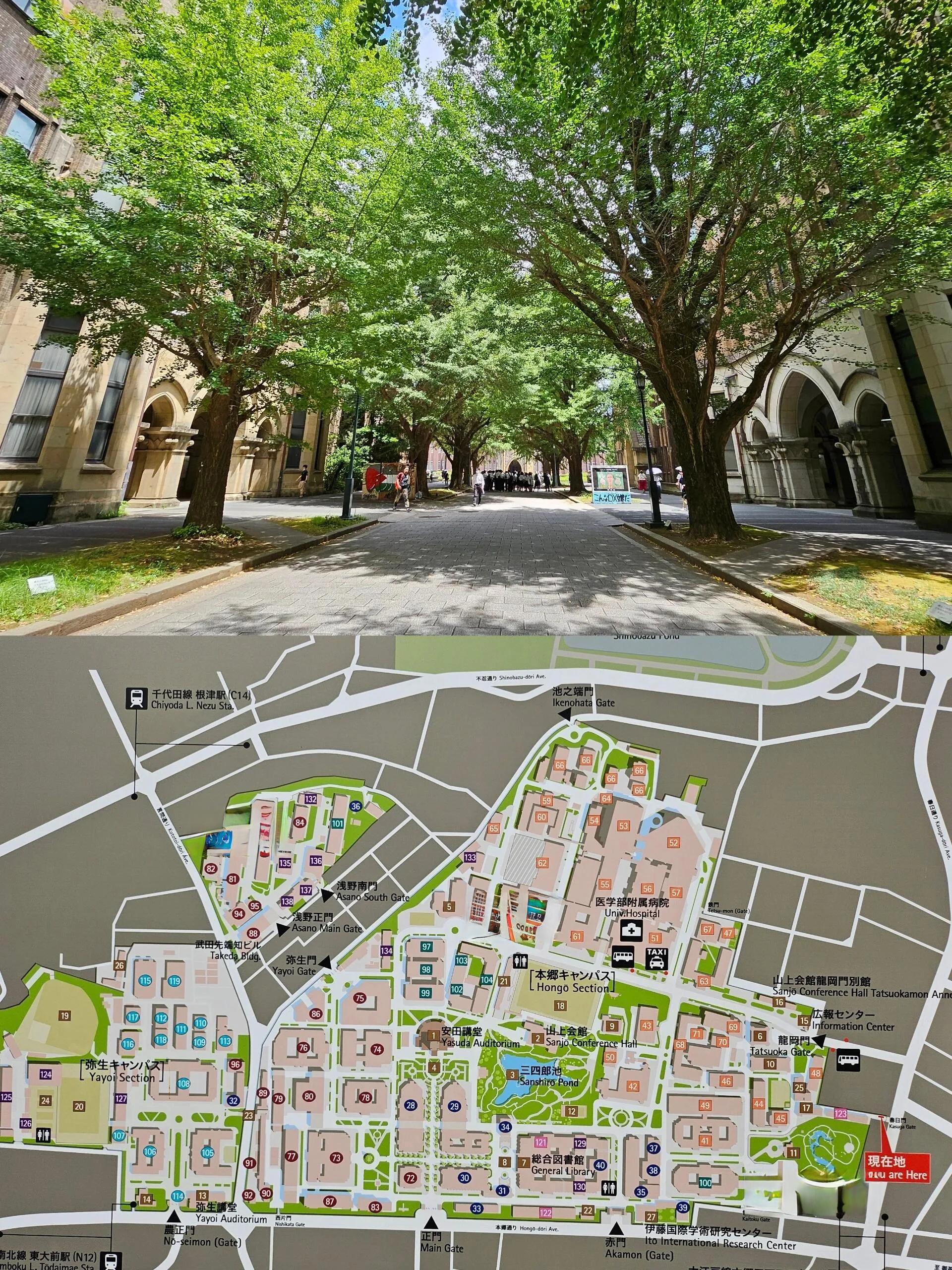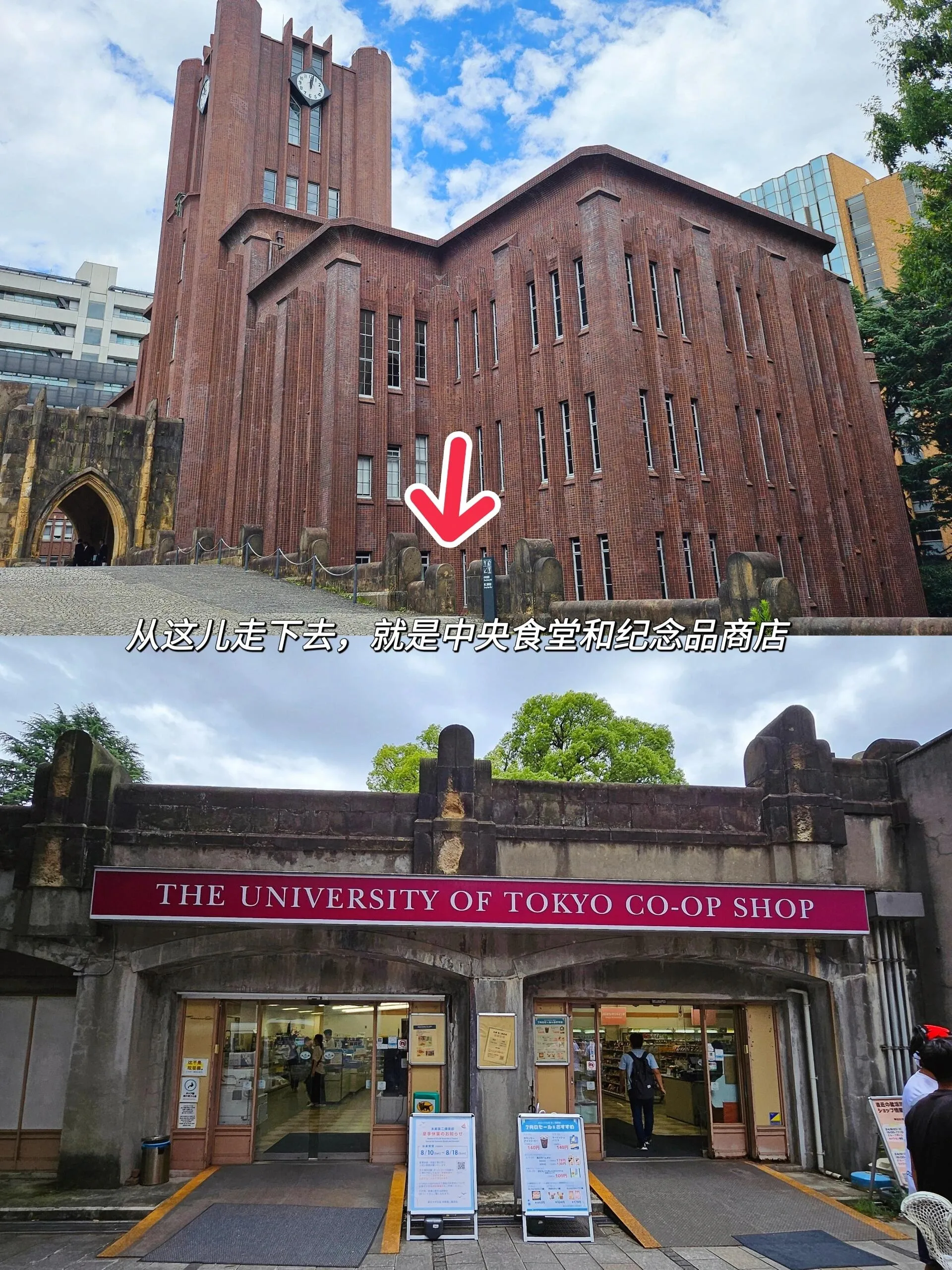 早上从地铁“本乡三丁目站”3号口出发,前往东京大学。出站后,向斜对面方向走,从春日门进入校园。校园内可以先去赤门打卡,然后前往圆形建筑安田讲堂。在安田讲堂附近有小楼梯,下去就是中央食堂和纪念品商店。