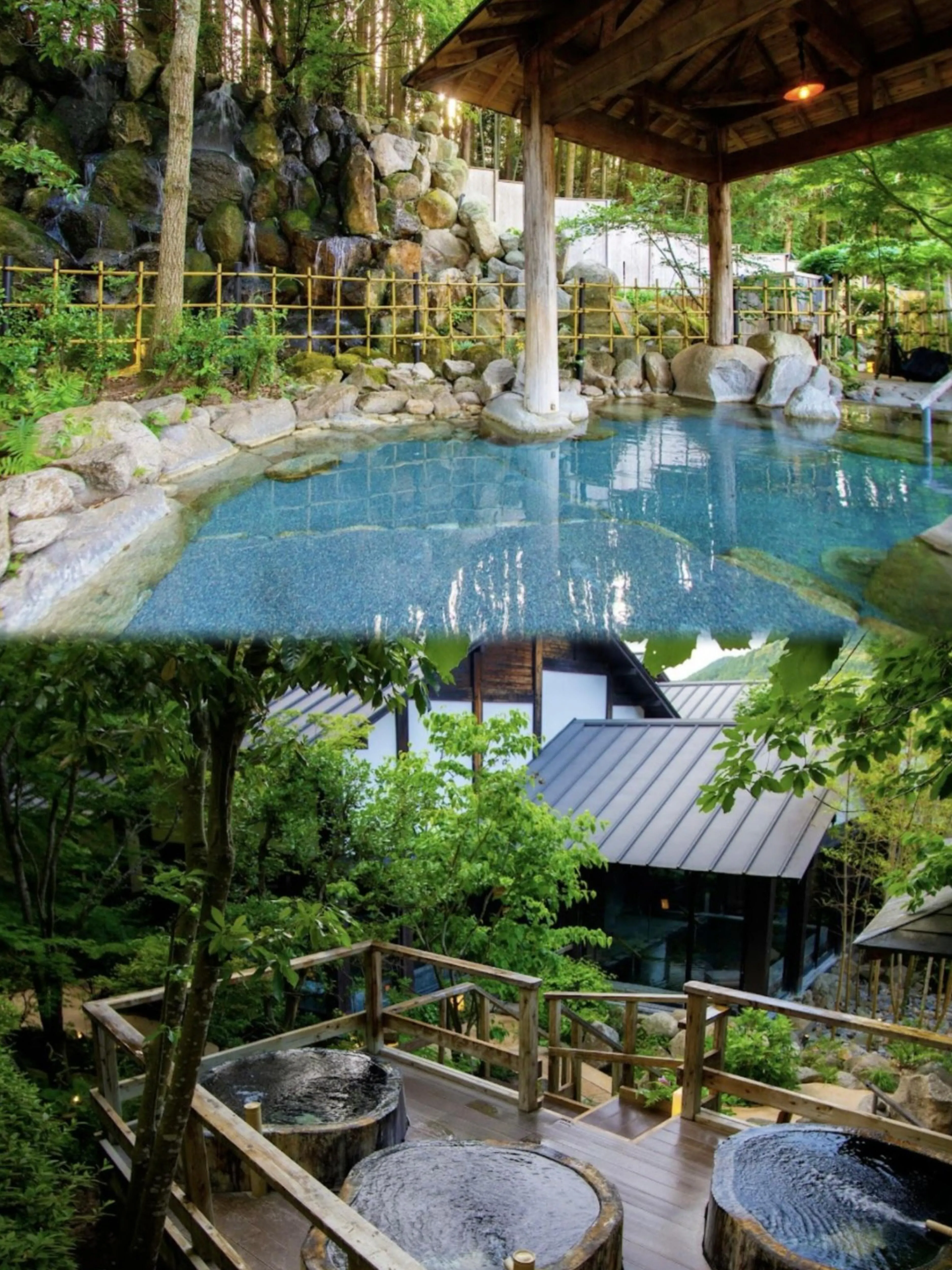 平日入浴料880日元。这里的温泉有两种风格:和式风和巴厘岛风,每周男女轮换。和风区的露天环境非常舒适,可以一边泡汤一边欣赏鱼池和小瀑布。巴厘岛风格的区域则完全被绿植包围,营造出异域风情,在日本也是比较少见的。这里同样提供私汤预约服务。