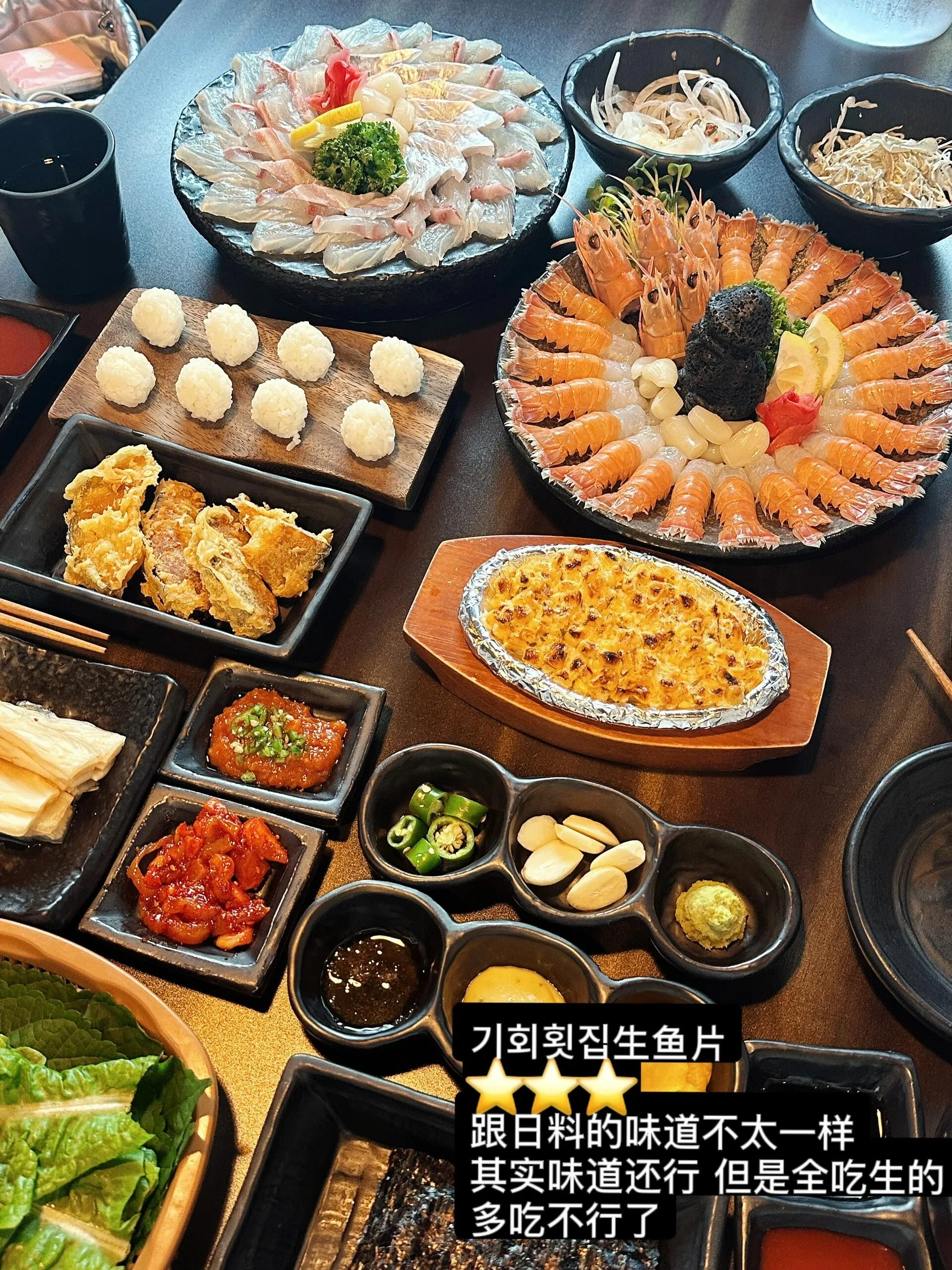 生鱼片和虾的口感与日本料理略有不同。将生鱼片放入拉面中食用别有一番风味。