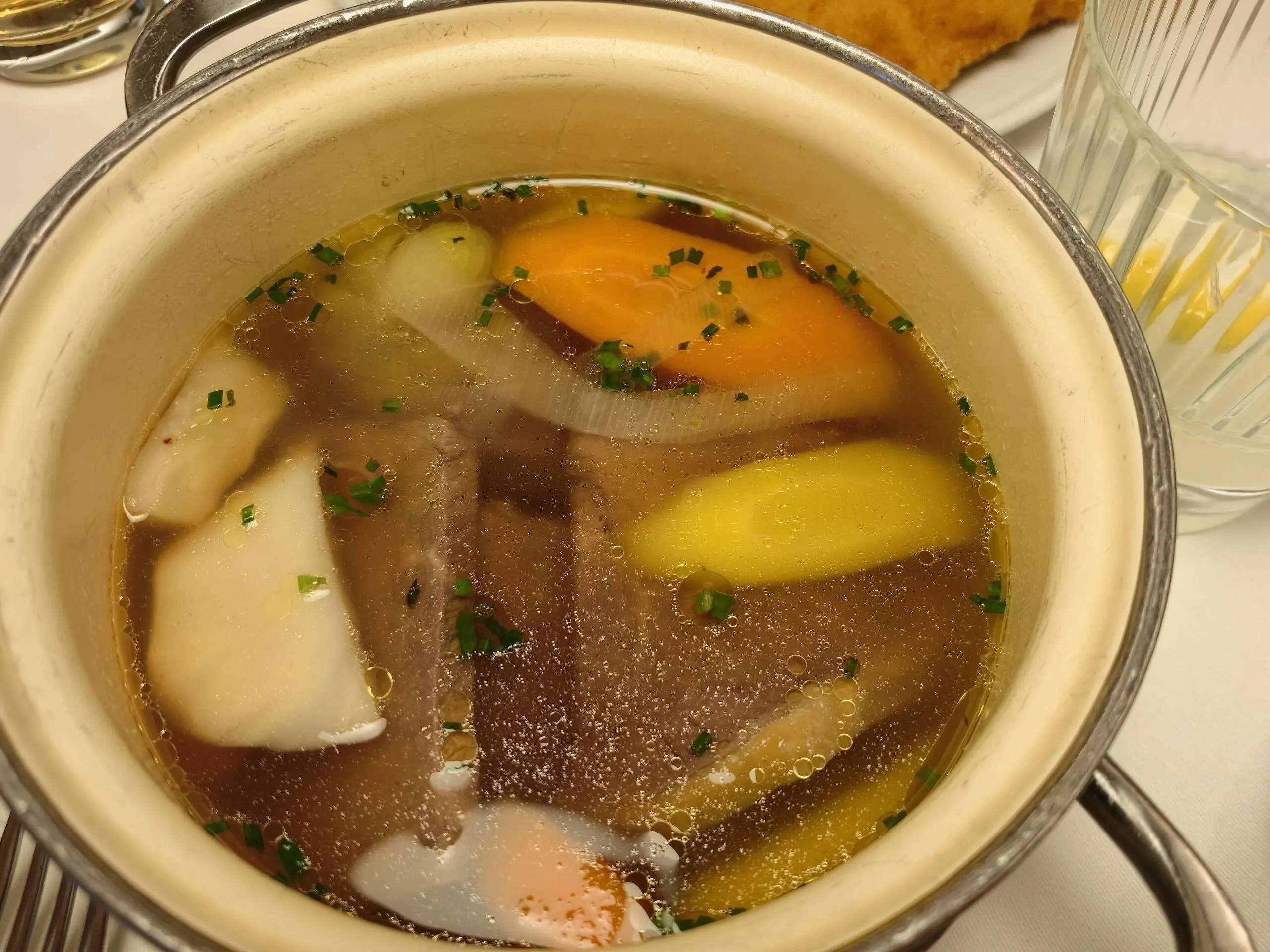 餐厅的炸猪排份量十足,口感尚可,但稍显干燥。牛肉汤则相当不错,牛肉新鲜有嚼劲,汤头不油腻,适合喜欢咸口汤品的食客。