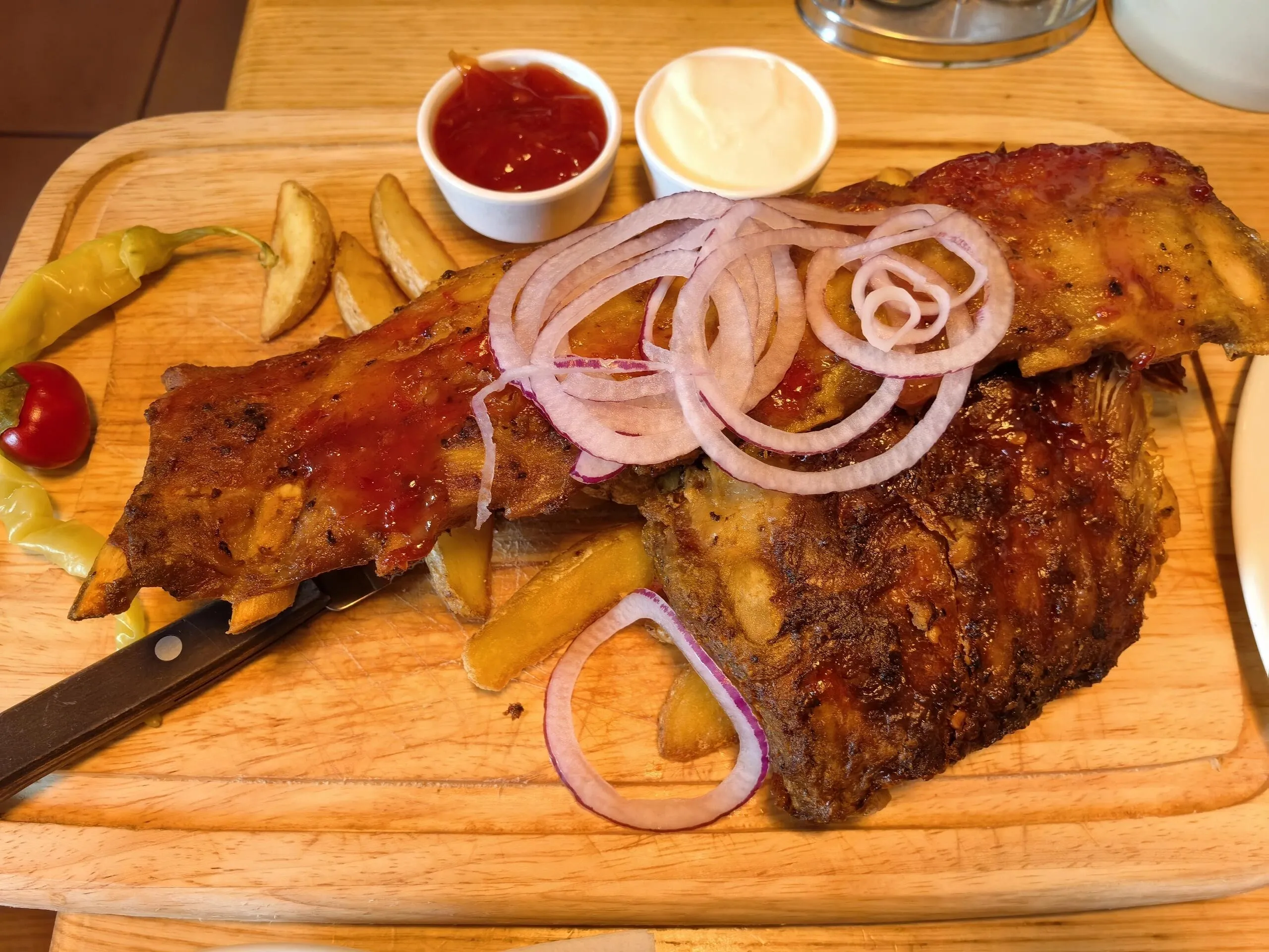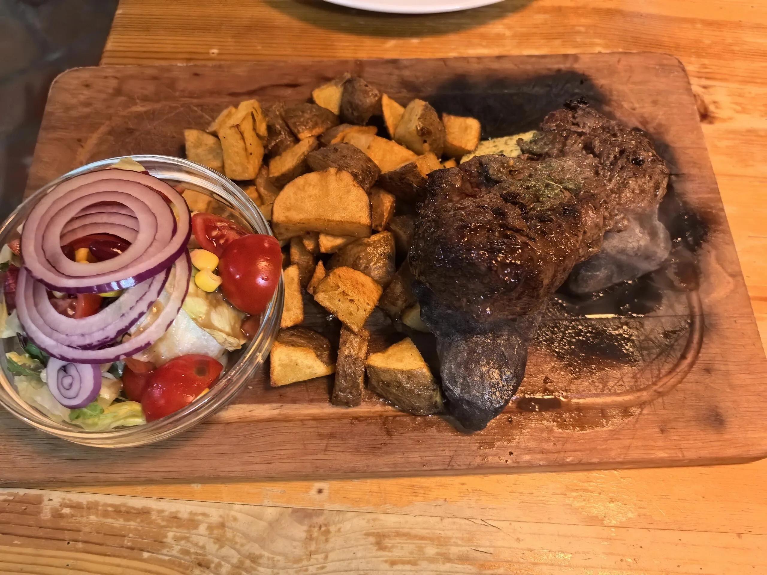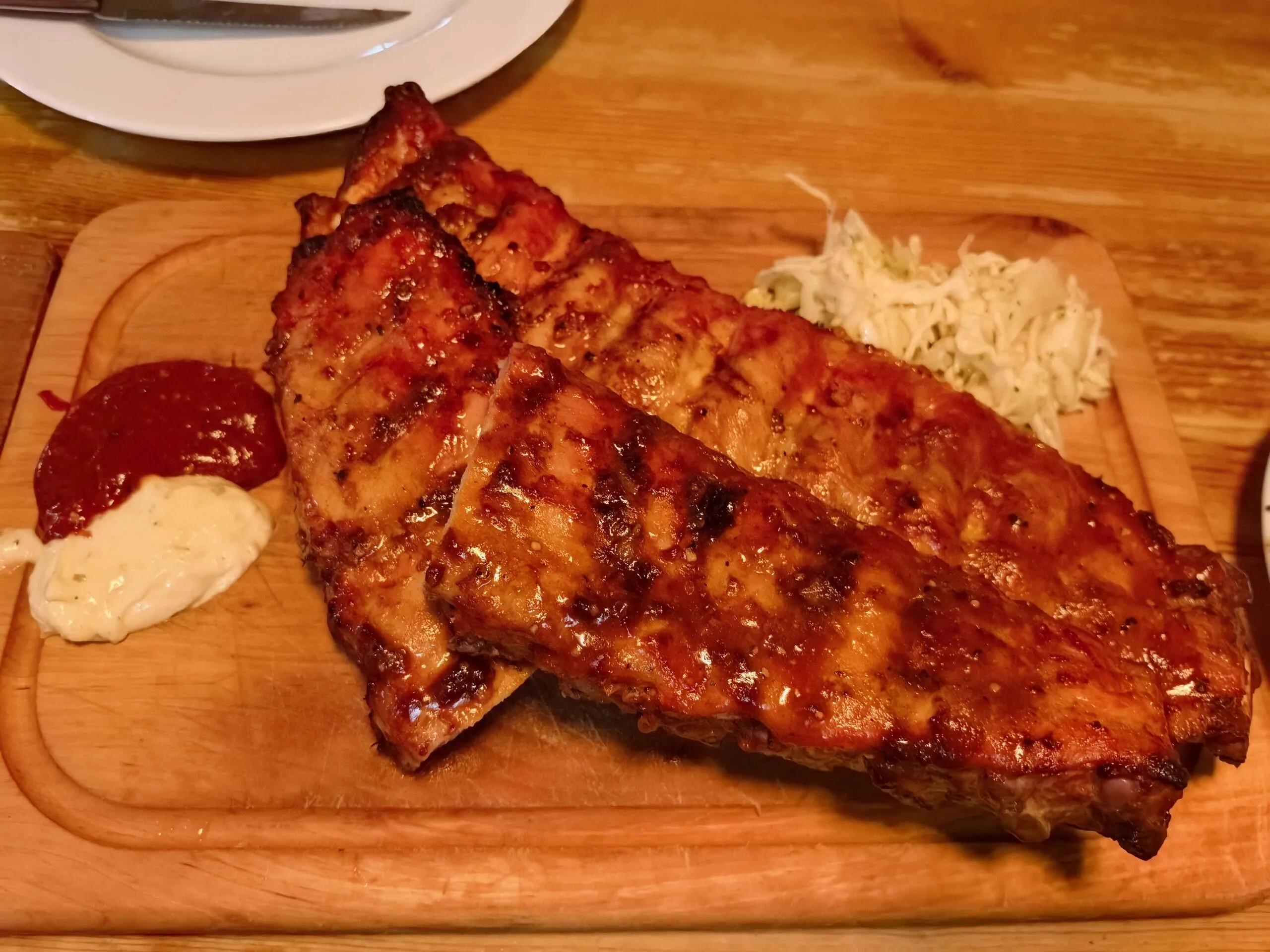 餐厅的经典烤猪肋排口感出色,没有猪肉的腥味,烤制入味且香气四溢。搭配餐厅提供的烧烤酱更添风味。此外,餐厅的牛排(全熟)也值得一试,肉质鲜嫩,几乎没有血丝残留,与配套的烤土豆搭配食用风味更佳。