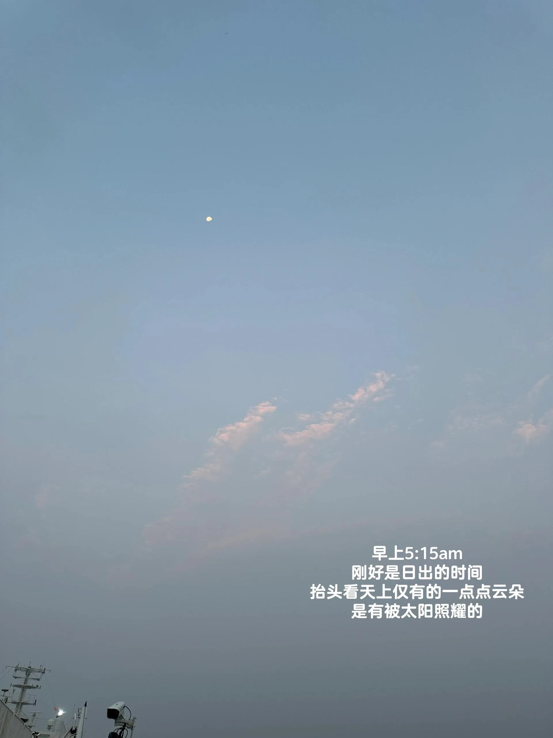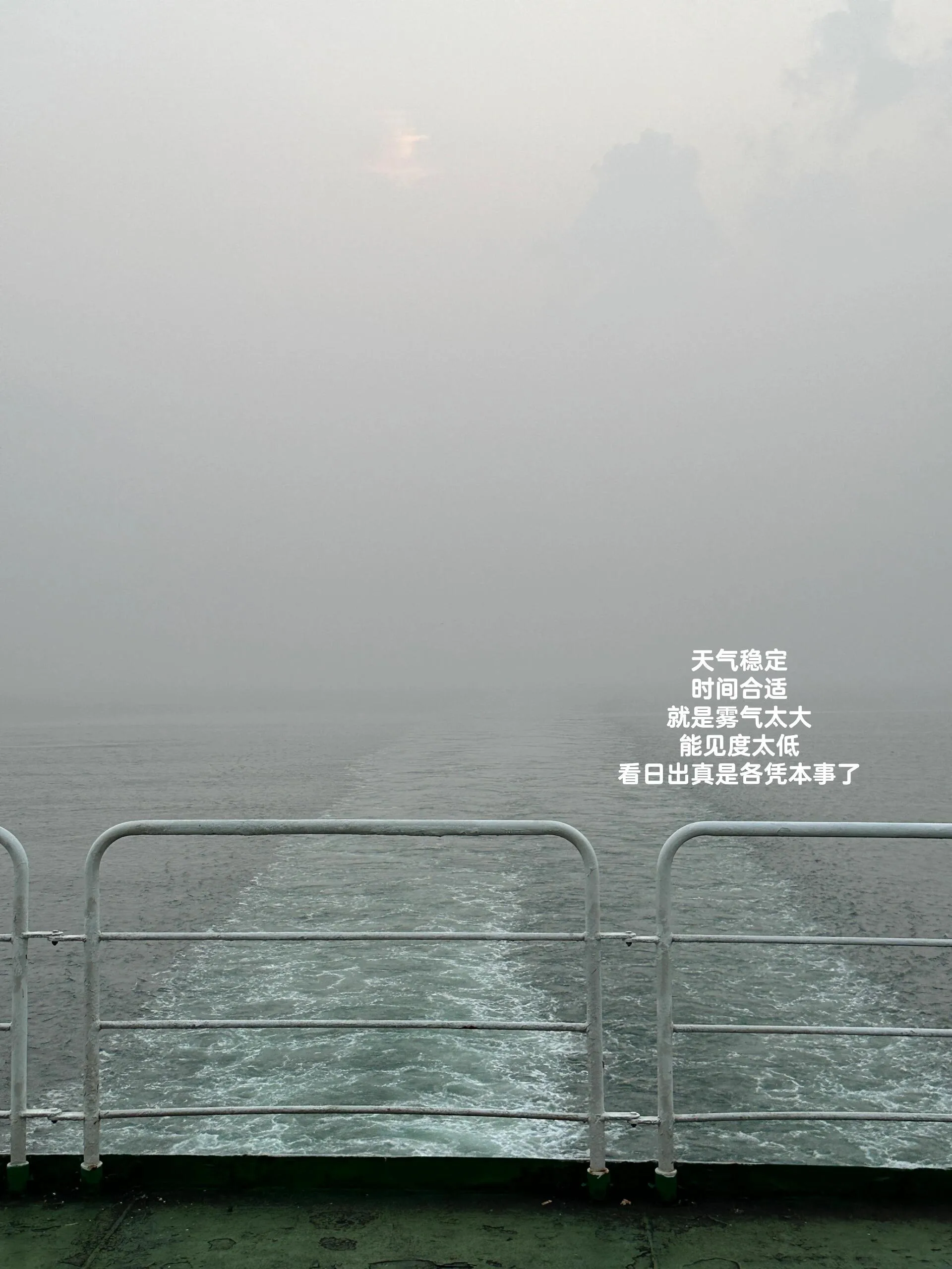 大连到威海的航线似乎提供了更好的机会。虽然只有一班船,但日出时间早于到达时间,而且天气预报显示是个晴天,这让人充满期待。然而,实际情况却不尽如人意。 即使在4:50就起床赶到甲板,也可能因为海面上的大量雾气而无法看到日出。 清晨的太阳不够强烈,无法驱散浓雾,即使能看到被阳光照耀的云朵,也可能看不到太阳本身。