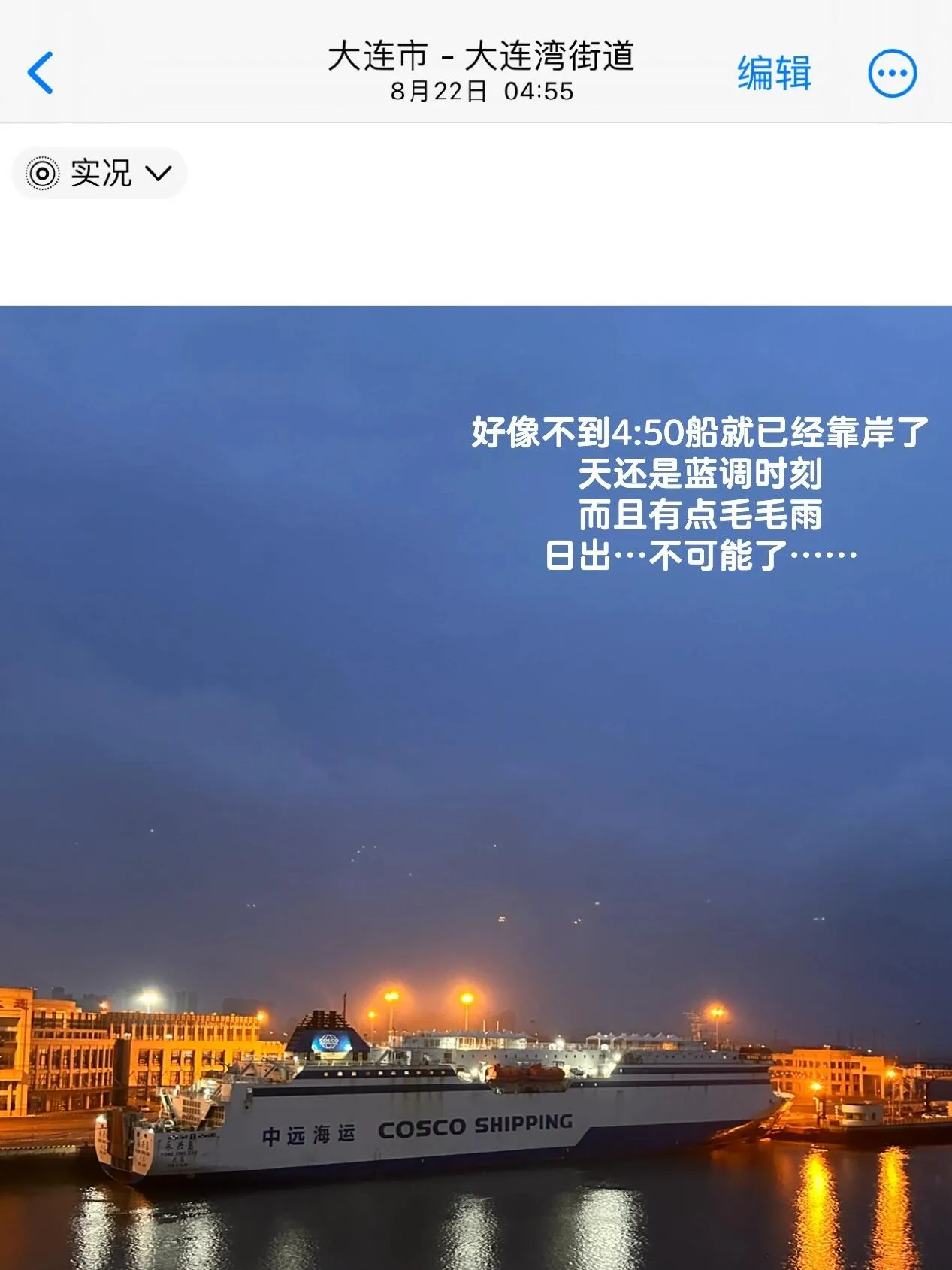 从烟台到大连的航线上,由于航行时间和日出时间的关系,观赏海上日出的可能性越来越小。以8月21日的吉龙岛号航班为例,船只最晚在早上4:50抵达大连,而当天的日出时间是5:12。这意味着在靠岸时,天空仍处于蓝调状态,完全错过了海上日出的时刻。