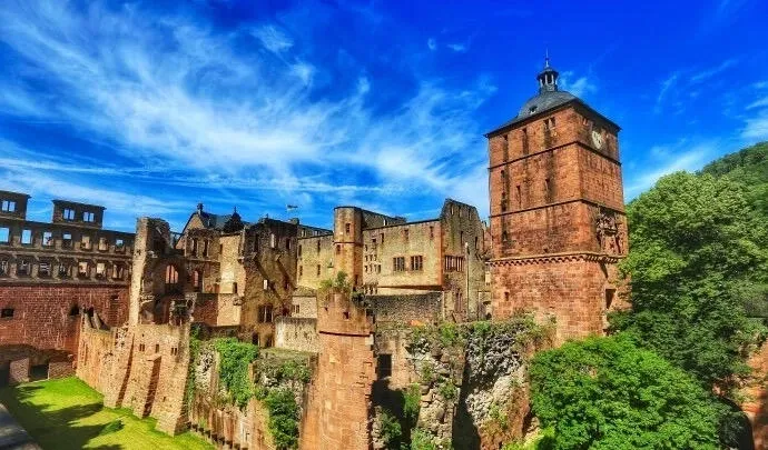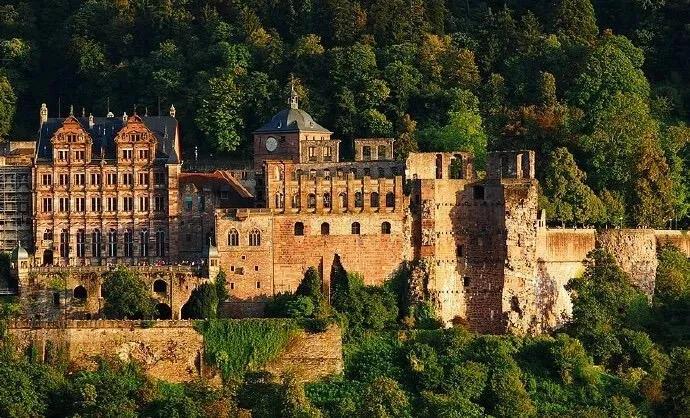 海德堡城堡是这座城市的标志 ,矗立在王座山(Koenigstuhl)山顶,俯瞰着老城和内卡河。这座有八百多年历史的红色砂石城堡,融合了哥特式、巴洛克式和文艺复兴式的建筑风格,是德国文艺复兴时期的代表性建筑。