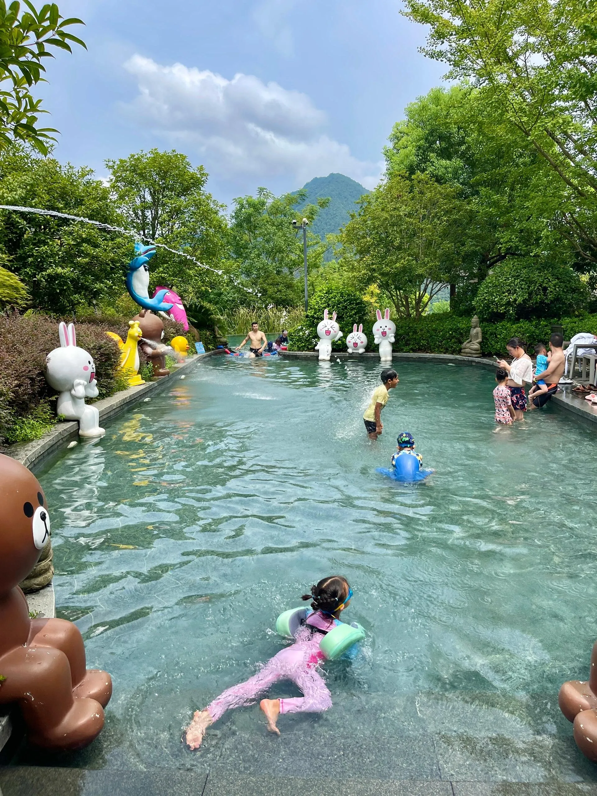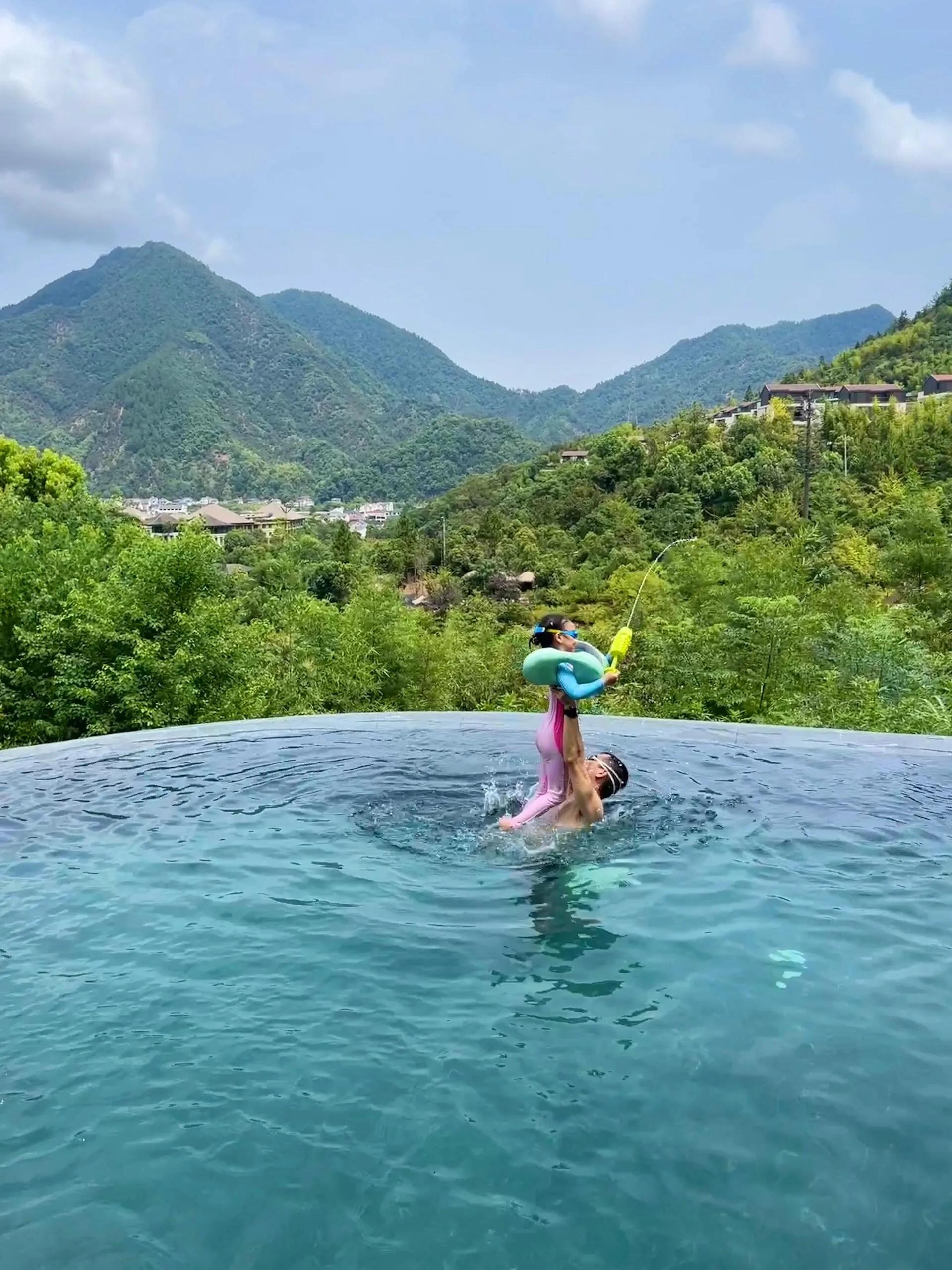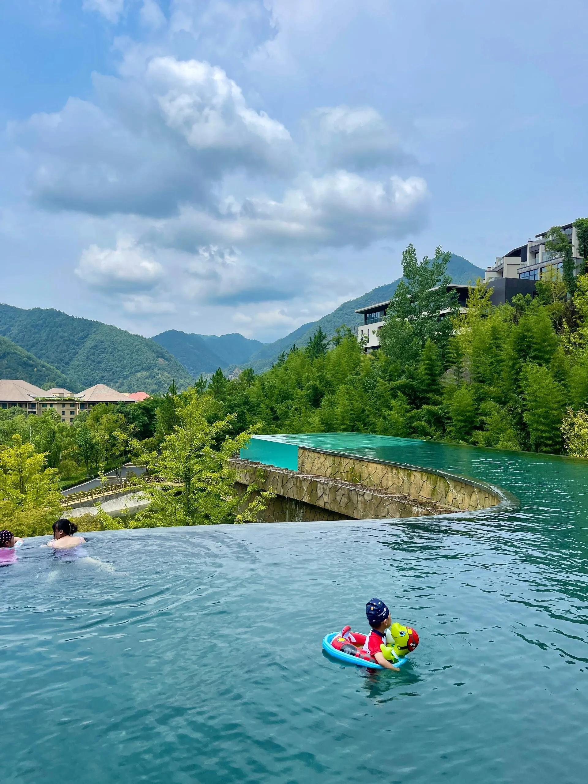 星泉谷是个温泉度假村,依山而建景色绝美,一整个带娃住进山里。 无边温泉泳池超级大,而且有两个玩水点 ,都有专门的儿童戏水区,亲子太友好了。房间都是独栋别墅公寓,每一户都有无敌山景的大露台,还能给娃鸡眼睛,你们懂的。