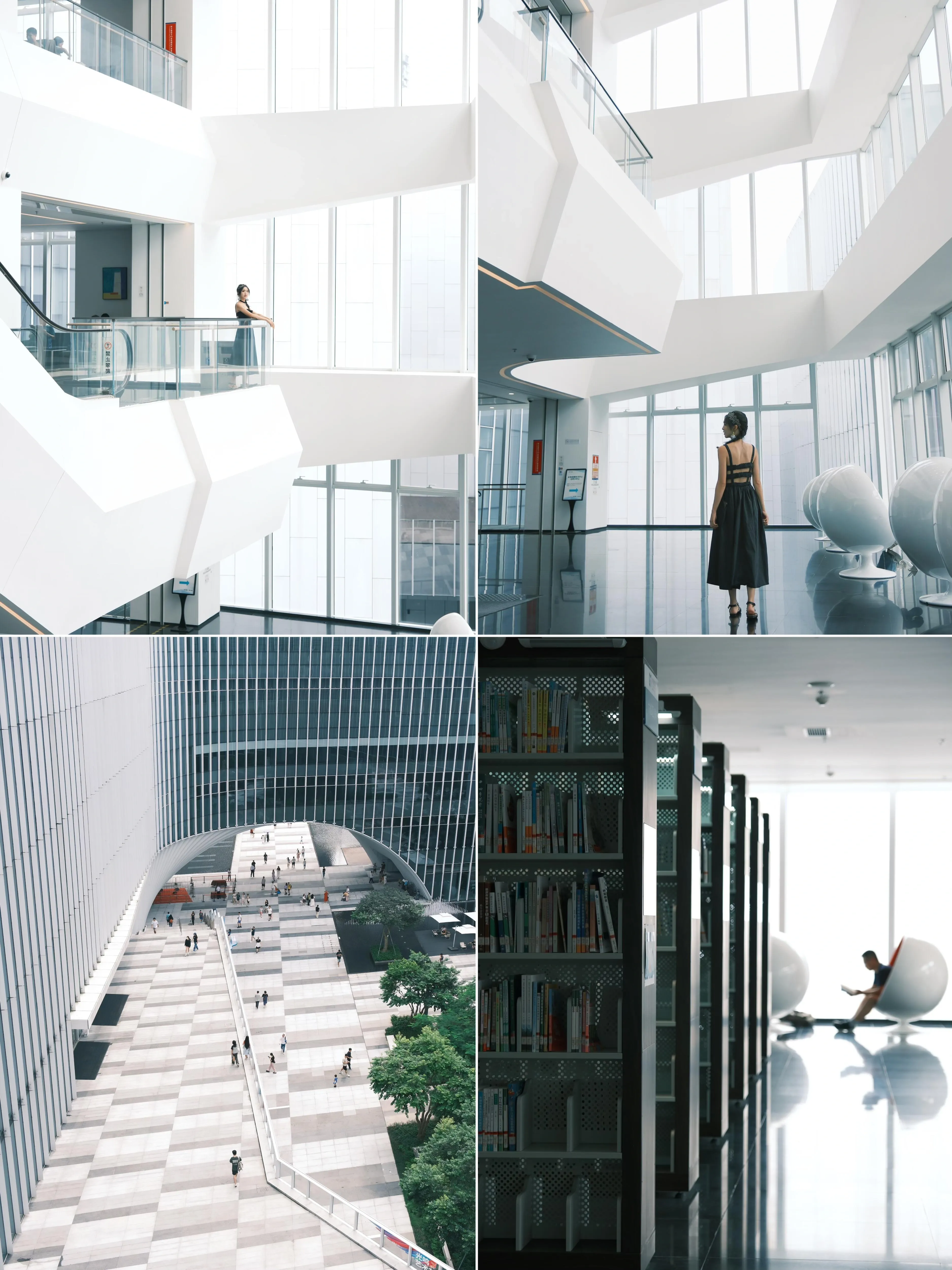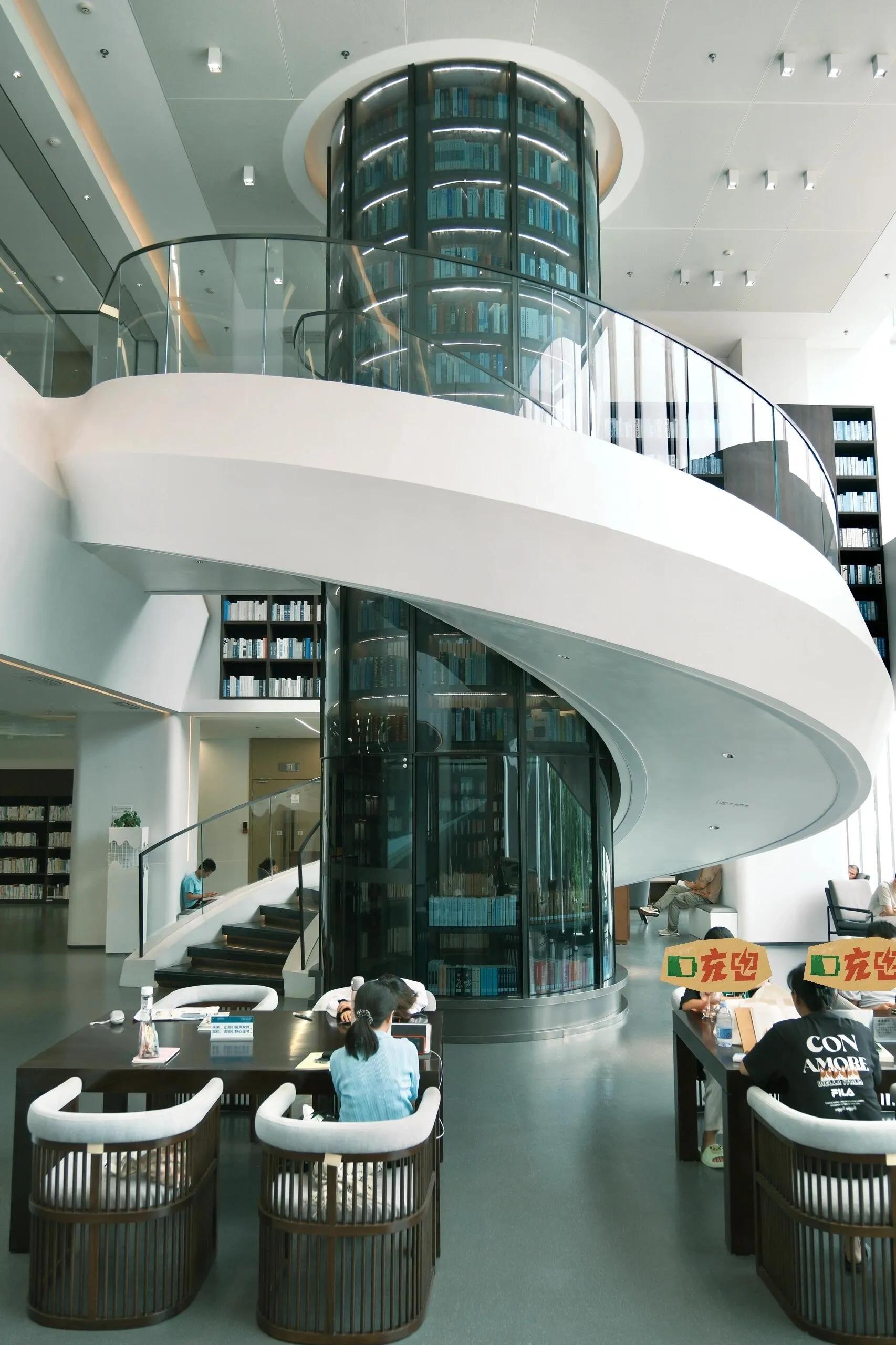 螺旋玻璃书圆塔:位于图书馆三楼连接到四楼,环形包围书屋,盘旋而上,宁静感十足。