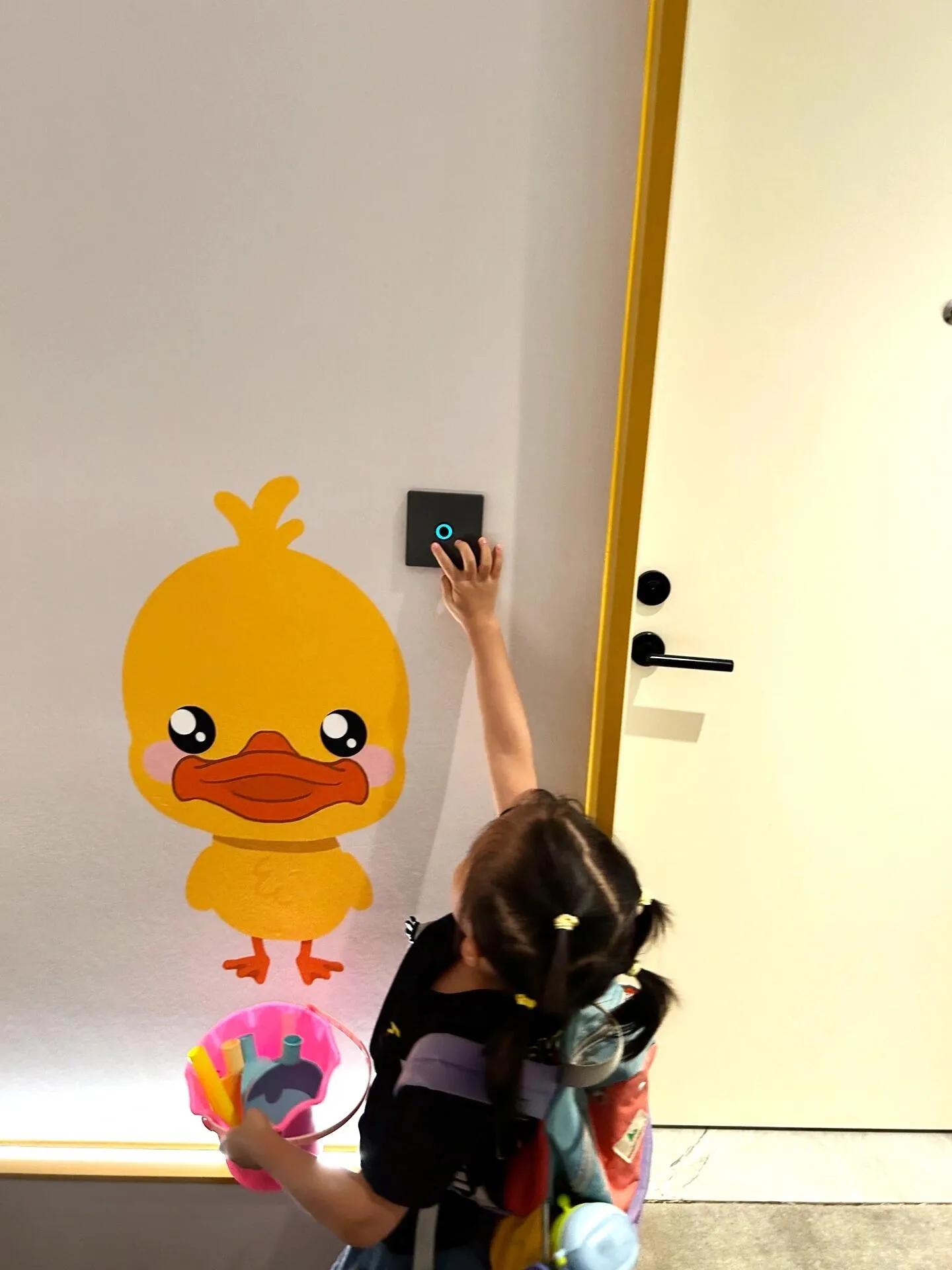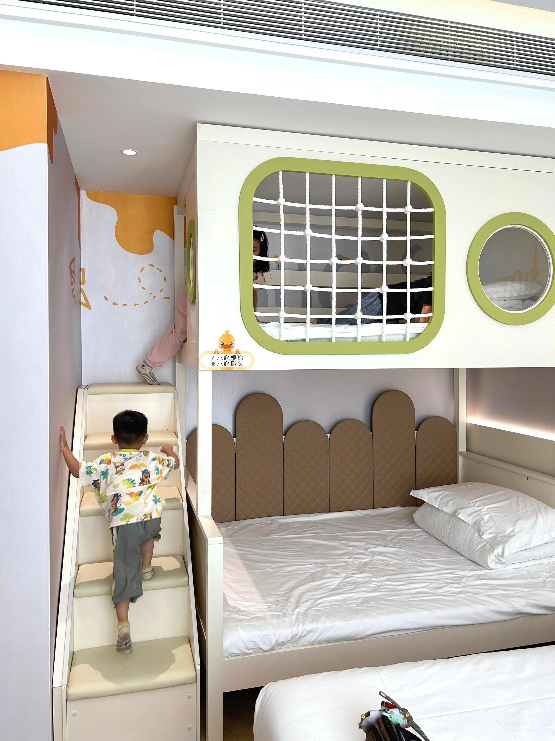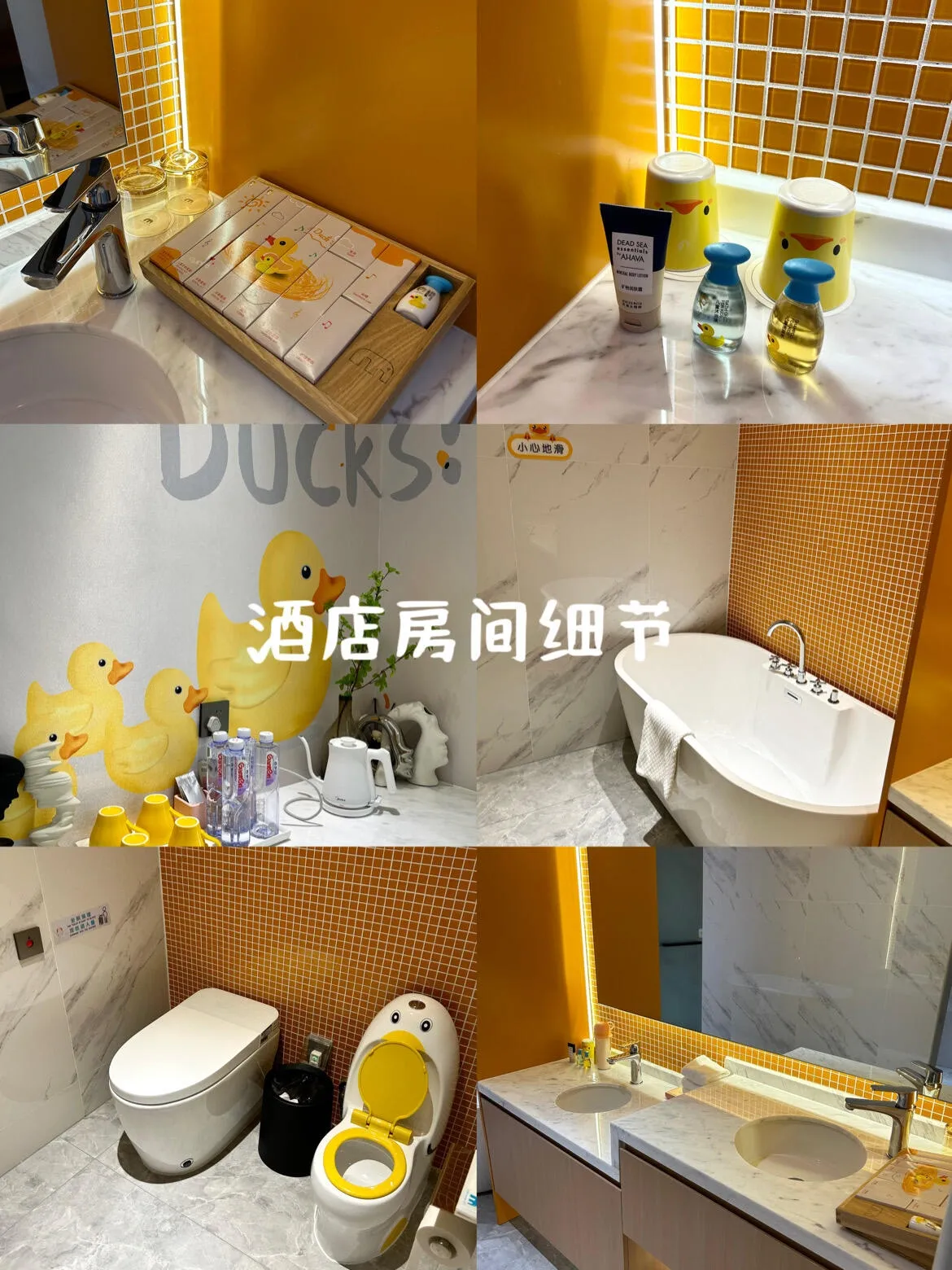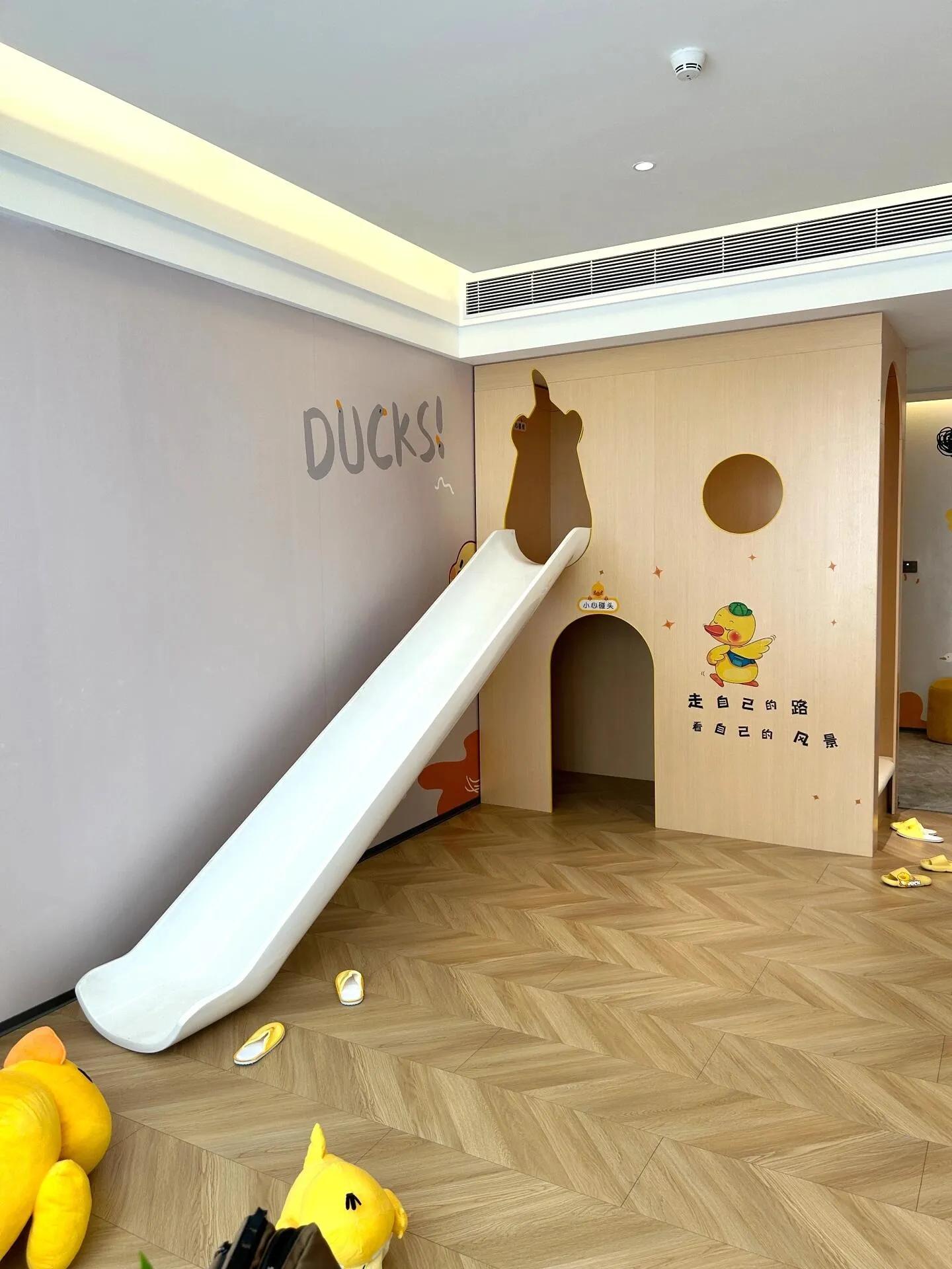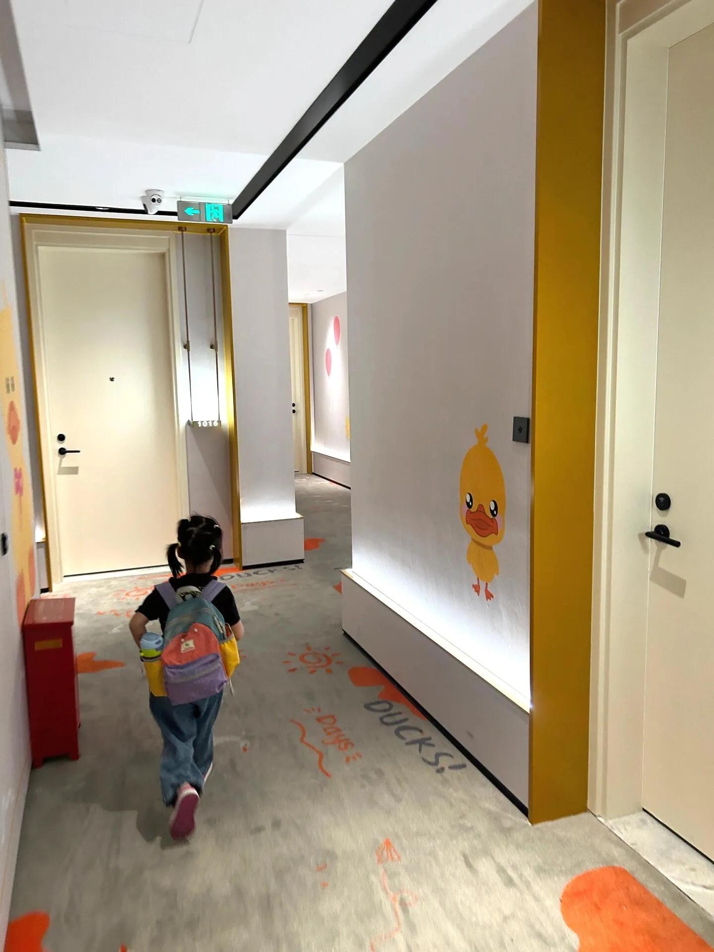 亲子房是小黄鸭主题,三张床,每张90厘米宽。走廊装饰也是小黄鸭主题,给人一种来到乐园的感觉。房间内自带滑滑梯,还有帐篷、小黄鸭玩偶等。酒店细节做得很好,提供儿童拖鞋、浴袍、小马桶、儿童洗漱用具和浴缸等。房间宽敞温馨,适合孩子们在里面奔跑玩耍。此外,房间还配备了全屋智能语音控制系统。