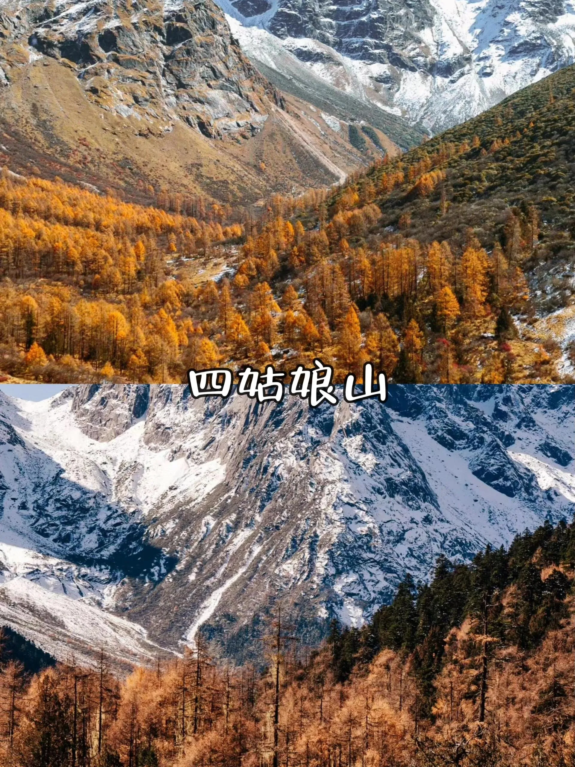 秋天四姑娘山的山林变得五彩缤纷,山脚下河流潺潺,山间云雾缭绕,仿佛进入了一个梦幻的世界。