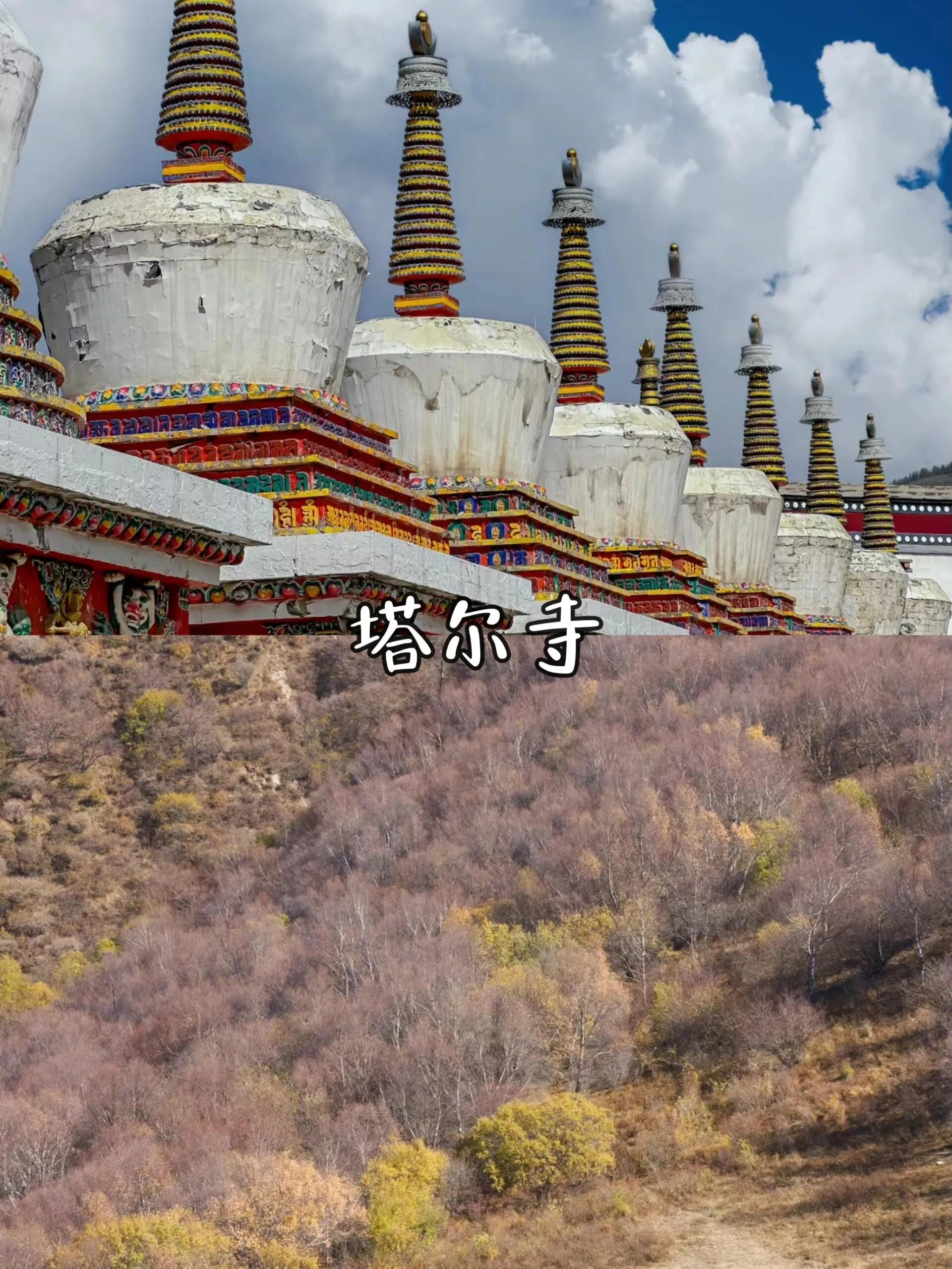 秋季塔尔寺周边的林木被秋风浸染,天空与地面形成鲜明对比,寺院建筑在秋色中更显庄严肃穆。