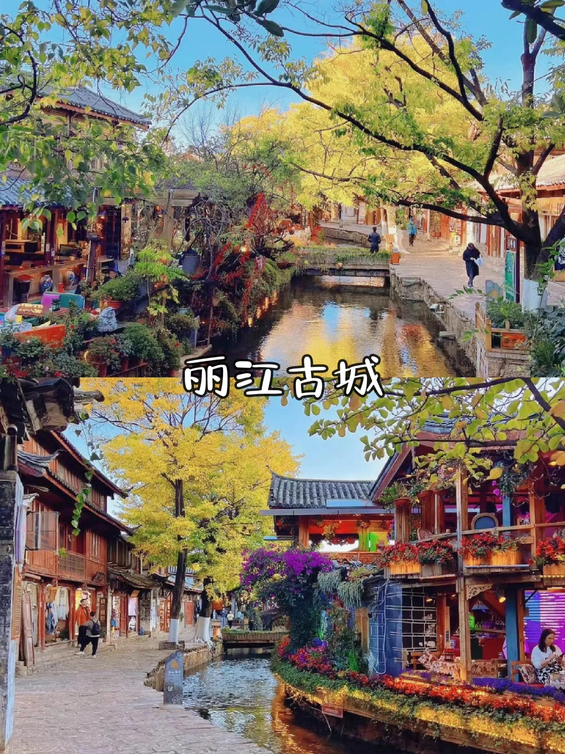 秋季的丽江古城,古城内外的树木渐渐变黄,玉龙雪山在晴朗的天空下更加清晰可见,古城的石板路、小桥流水别有一番风味。