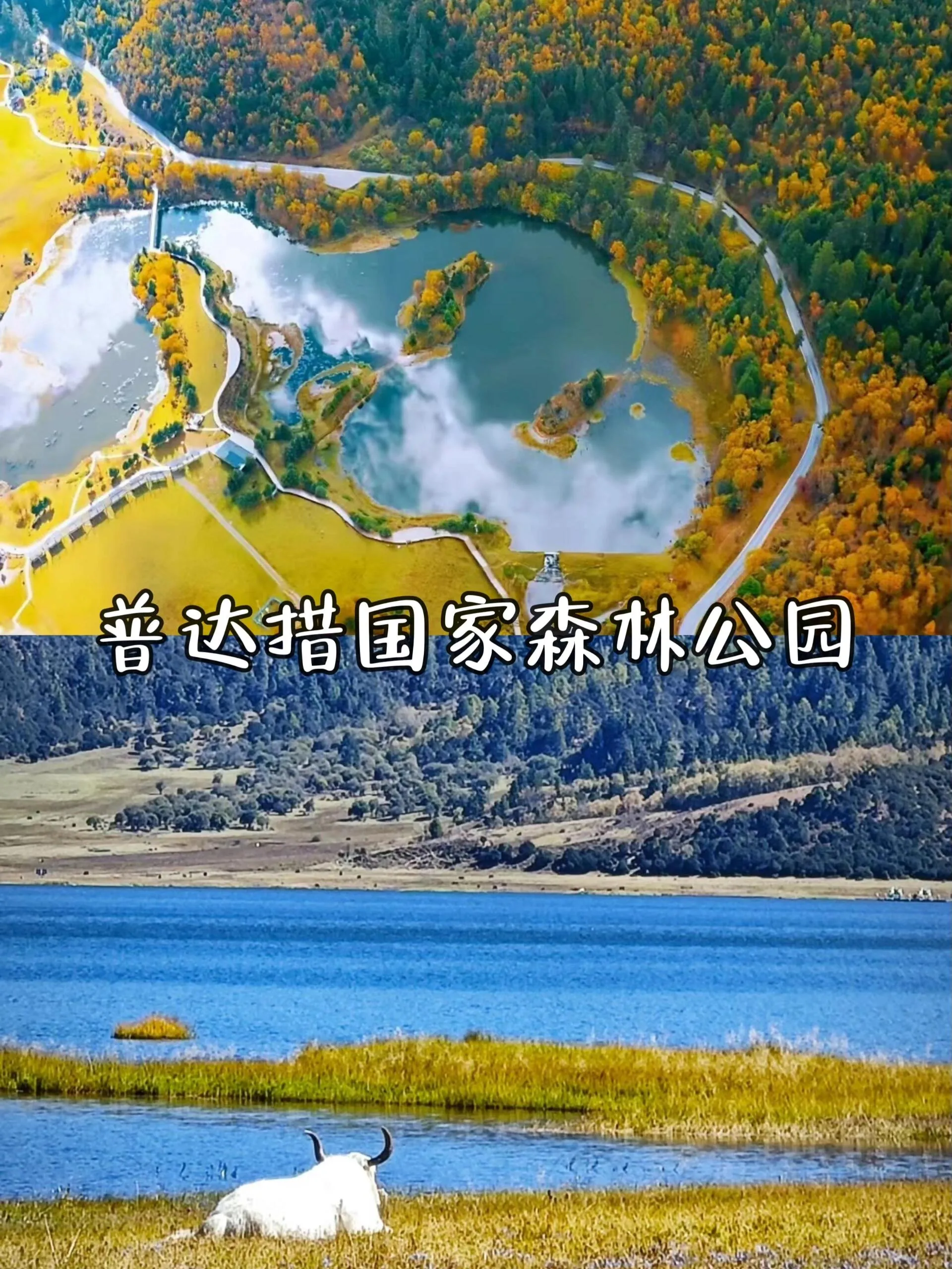 秋季普达措的湖泊与山林色彩斑斓,湖水清澈见底,倒映着周围的秋色,宛如人间仙境。