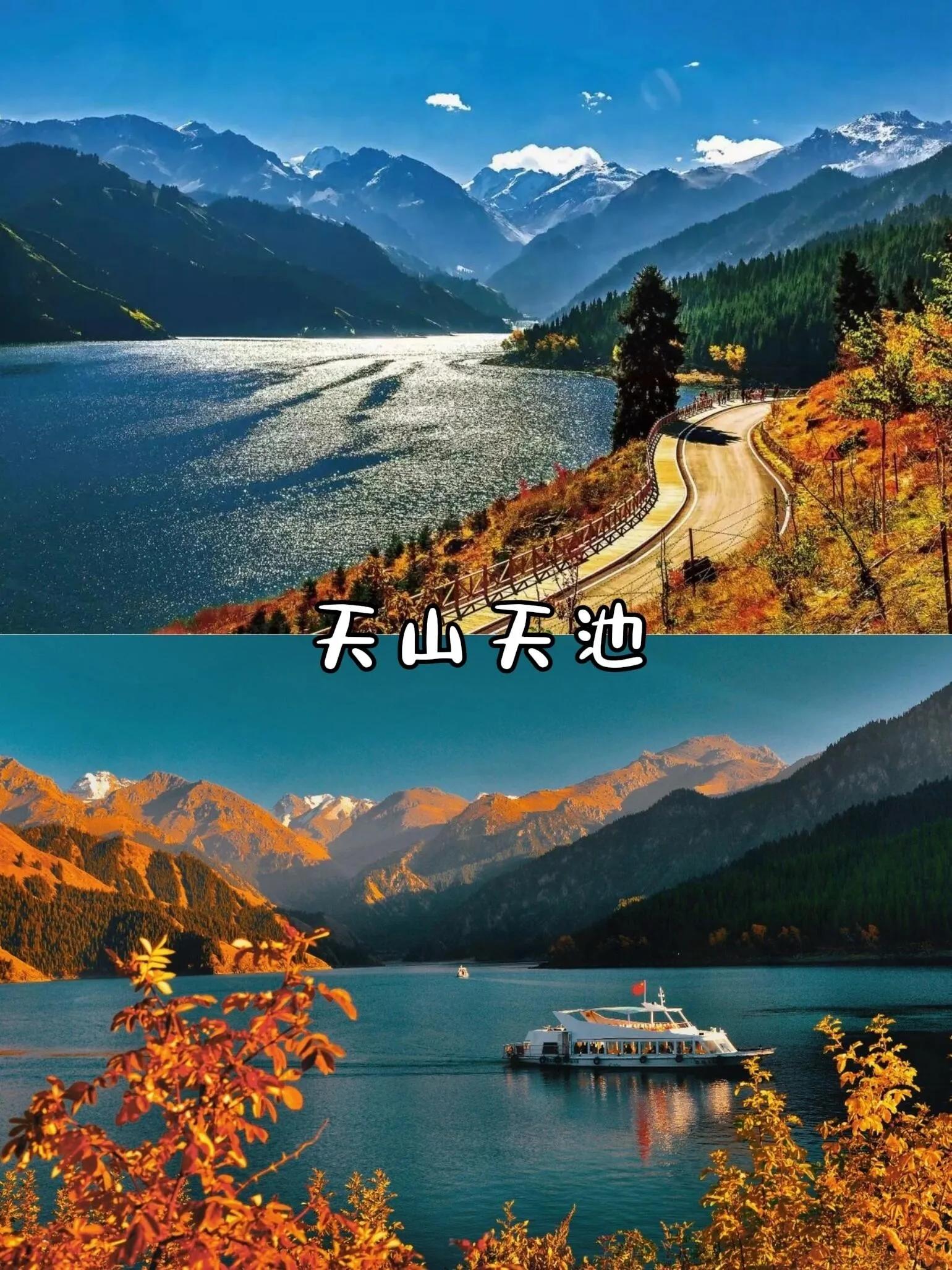 秋季的天山天池周围山林色彩斑斓,从翠绿到金黄再到火红,湖面如镜,倒映着周围的美景,宛如仙境。