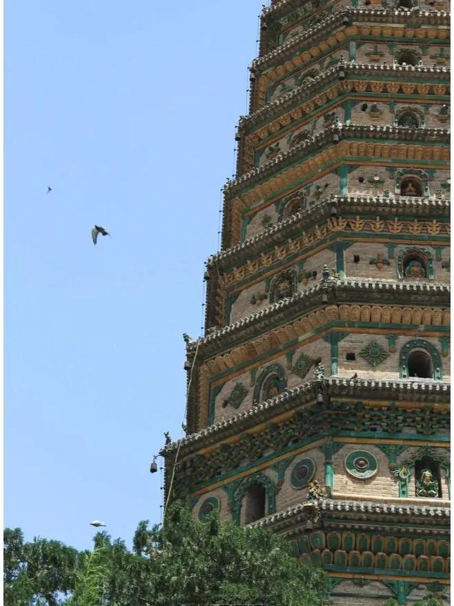 飞虹塔是广胜寺最引人注目的建筑,被誉为“世界最高的多彩琉璃塔”。这座八角形塔楼高47.31米,共13层,始建于明代正德十年(1515年),完工于嘉靖六年(1527年)。塔身由青砖砌成,外表全部镶嵌着多彩琉璃构件,在阳光照耀下呈现出赤、橙、黄、绿、青、蓝、紫等七彩光芒,宛如飞虹,故名“飞虹塔”。塔身装饰精美,尤其是一二三层,檐下有斗拱、倚柱、佛像、菩萨、金刚、花卉、盘龙、鸟兽等各种构件和图案,捏制精巧,彩绘鲜丽。值得一提的是,即使在清康熙年间临汾盆地发生八级地震,此塔依然安然无恙,足见其建造之精湛。