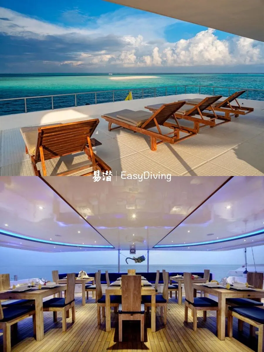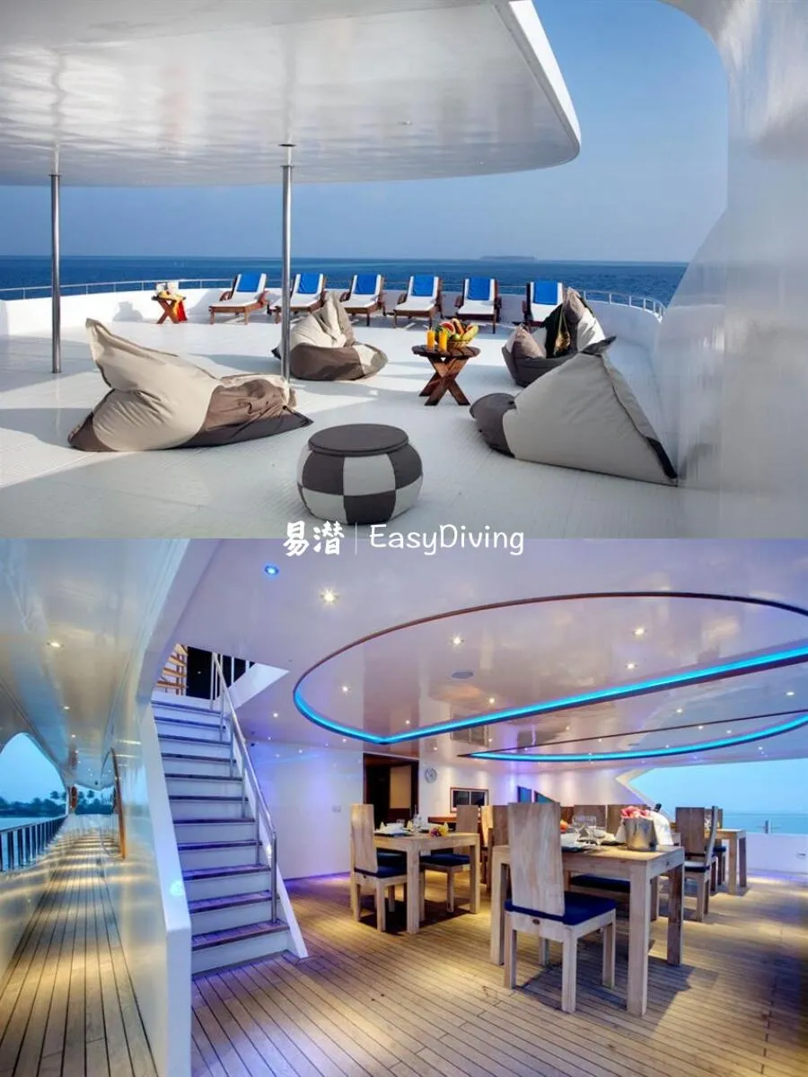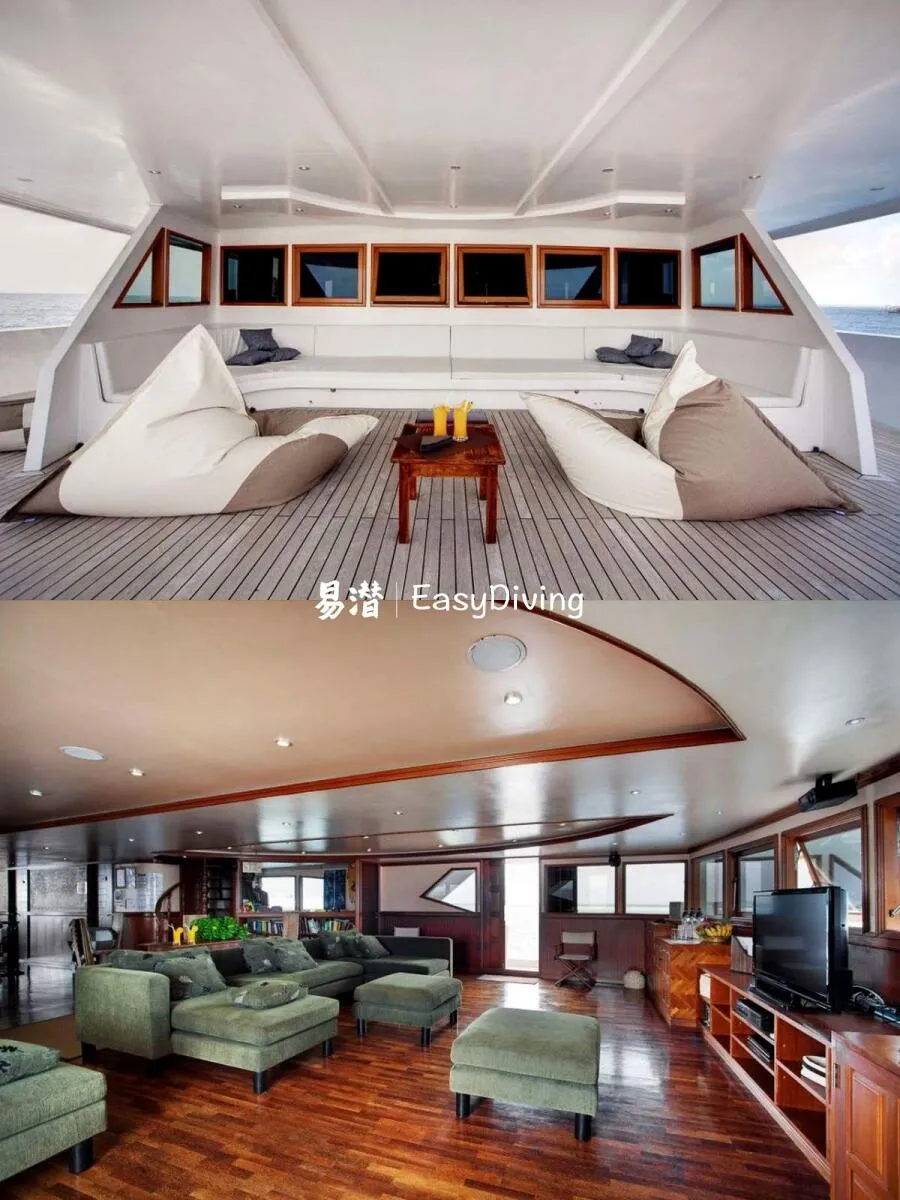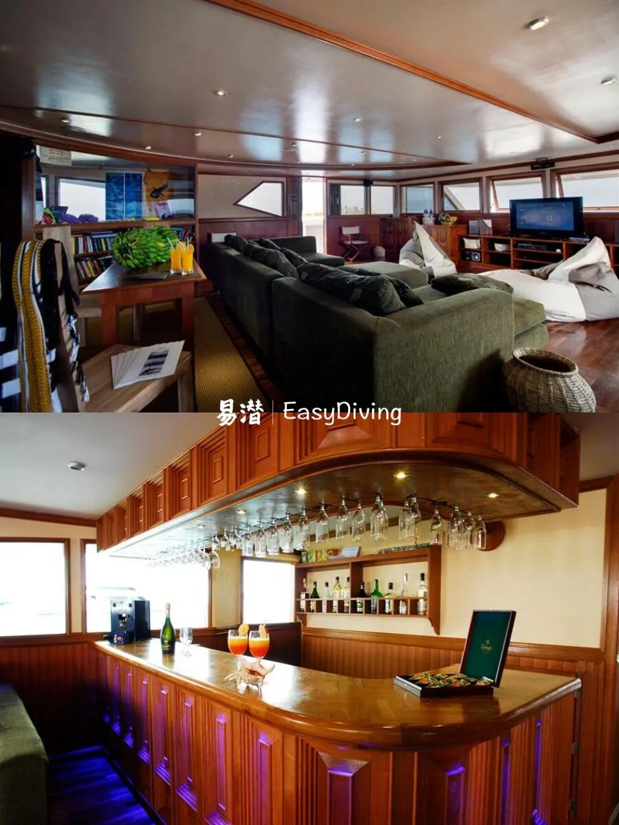 船上设有宽敞而温馨的空调沙龙室,配有设施齐全的吧台,可为旅客提供各式各样的饮品和酒水。此外还有两个舒适的大沙发,旅客可以在潜水之余听音乐、看电影或阅读。偶尔,船上还会组织特殊的夜间娱乐活动,环绕立体声音响系统会将沙龙室变成一个巨大的舞池。