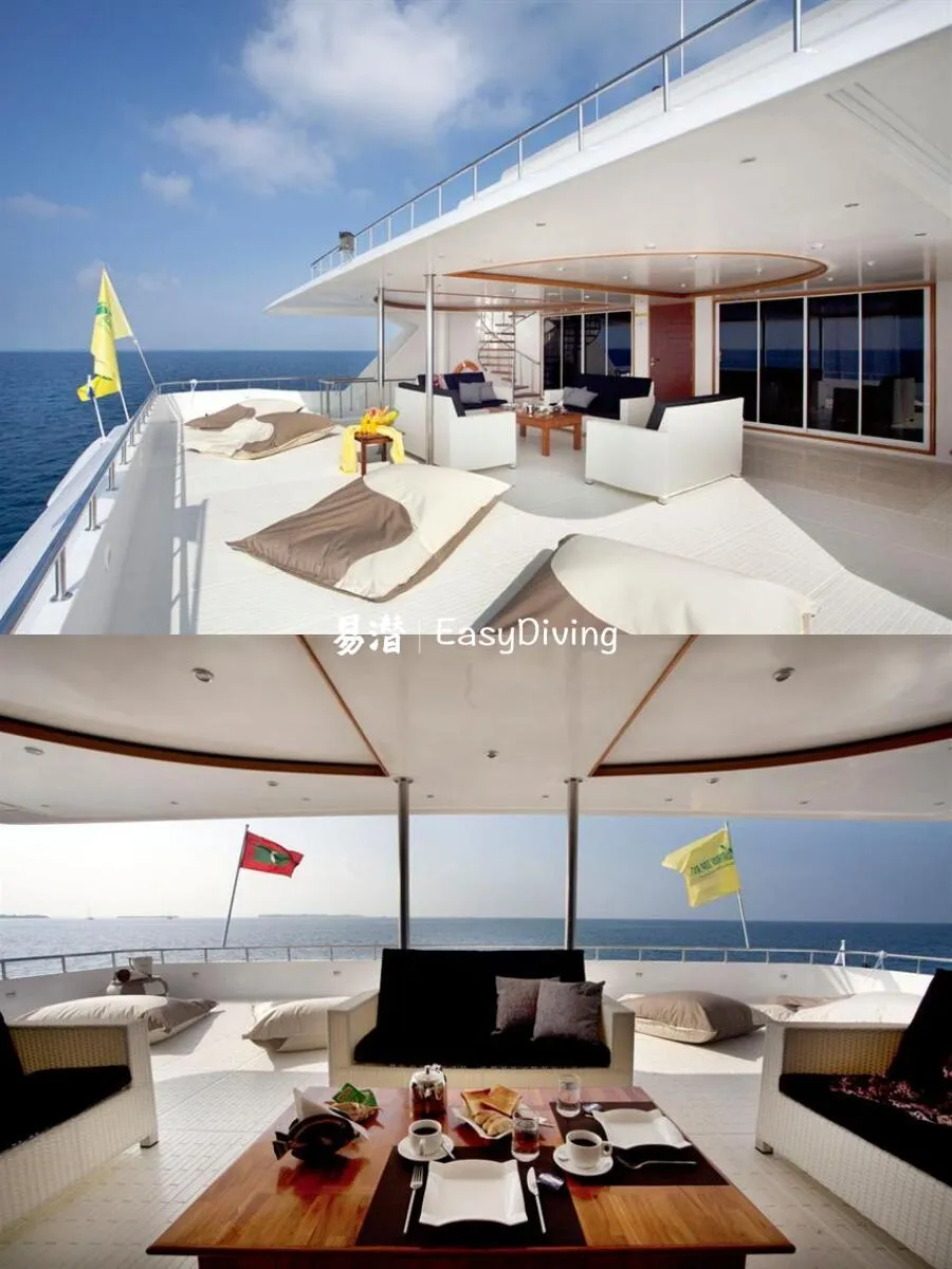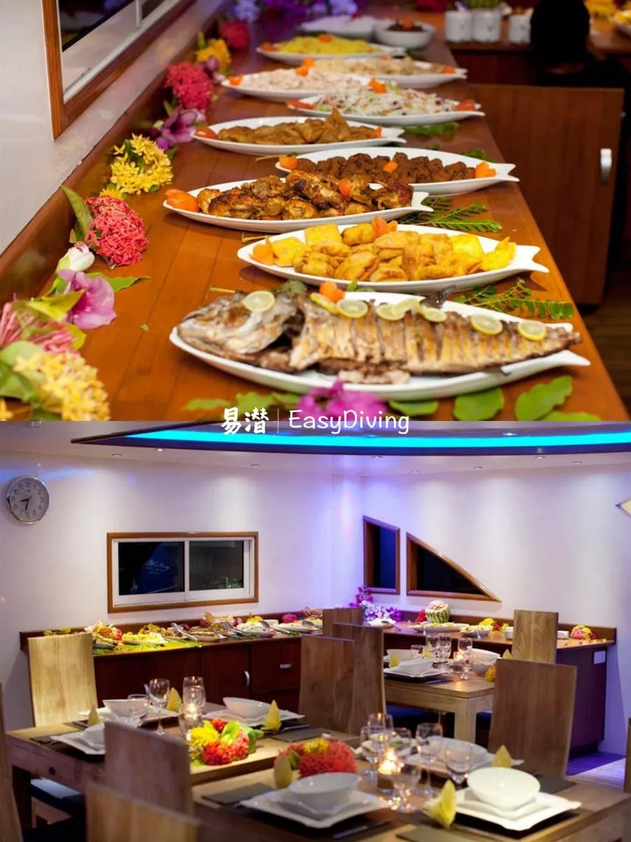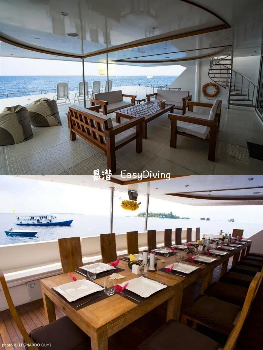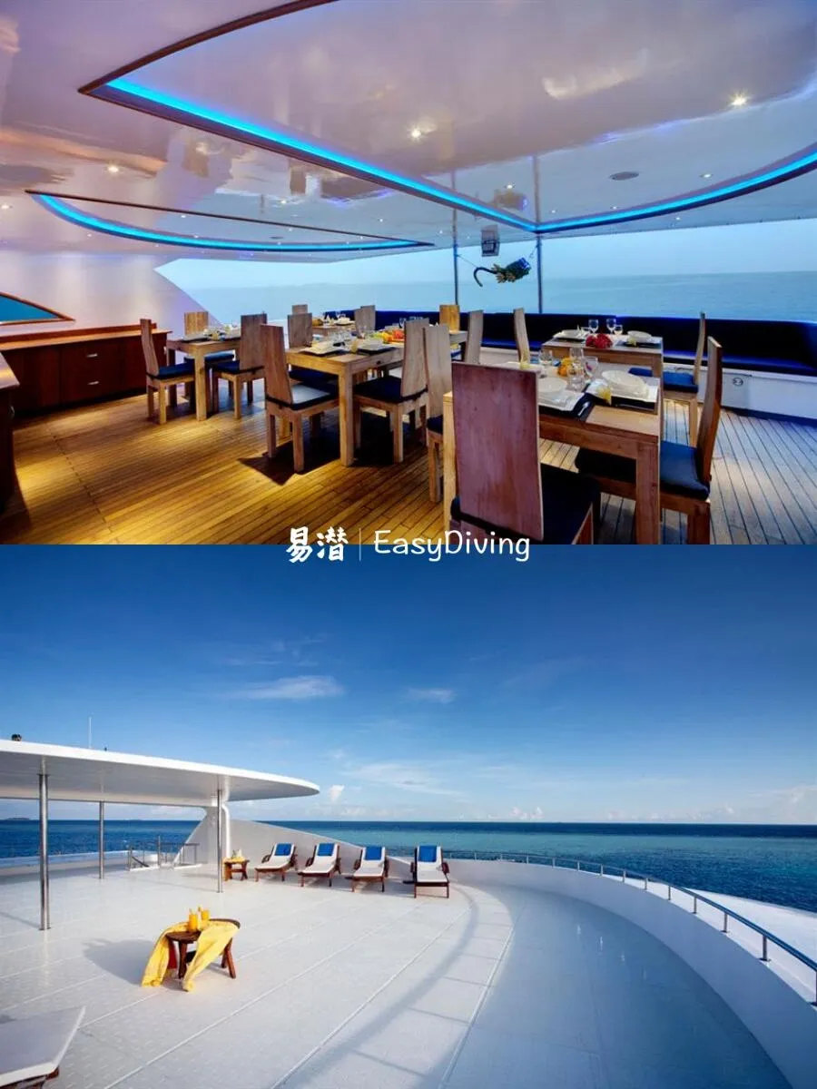 船上设有宽敞而温馨的空调沙龙室,配有设施齐全的吧台,可为旅客提供各式各样的饮品和酒水。此外还有两个舒适的大沙发,旅客可以在潜水之余听音乐、看电影或阅读。偶尔,船上还会组织特殊的夜间娱乐活动,环绕立体声音响系统会将沙龙室变成一个巨大的舞池。