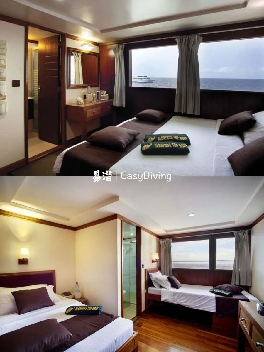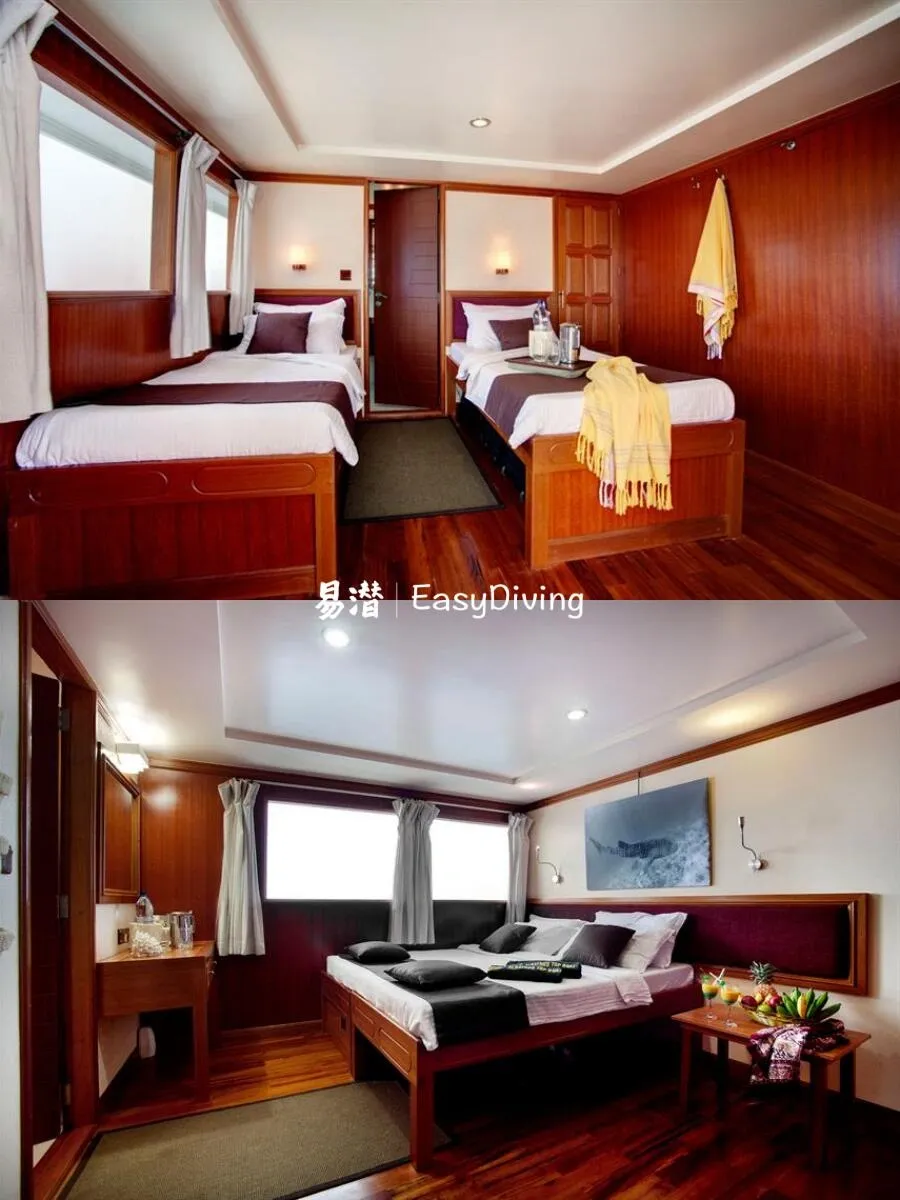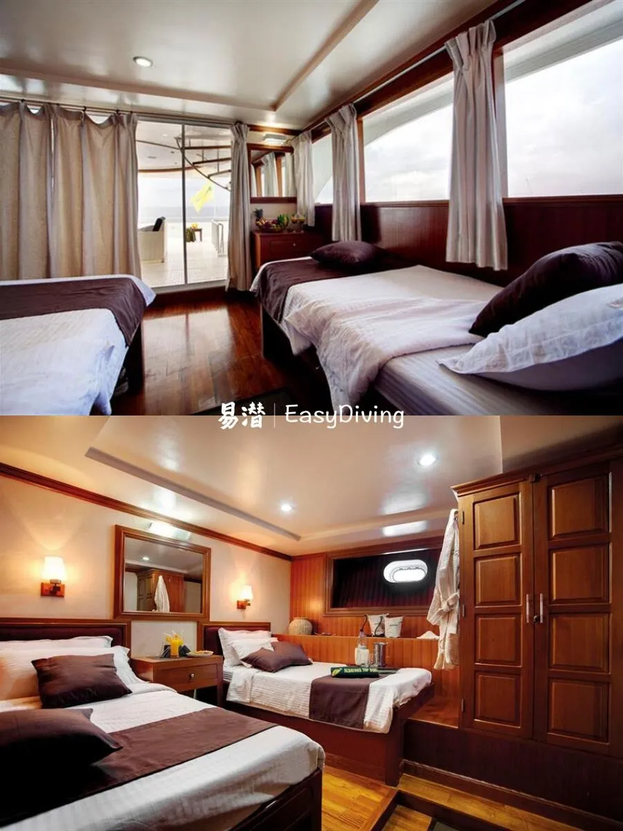 船上共有11间舒适的旅客客舱,每期船宿可承载21位旅客。所有客舱都配有空调、私人卫浴室、储物空间、阅读灯、WiFi覆盖和充电插座等设施。