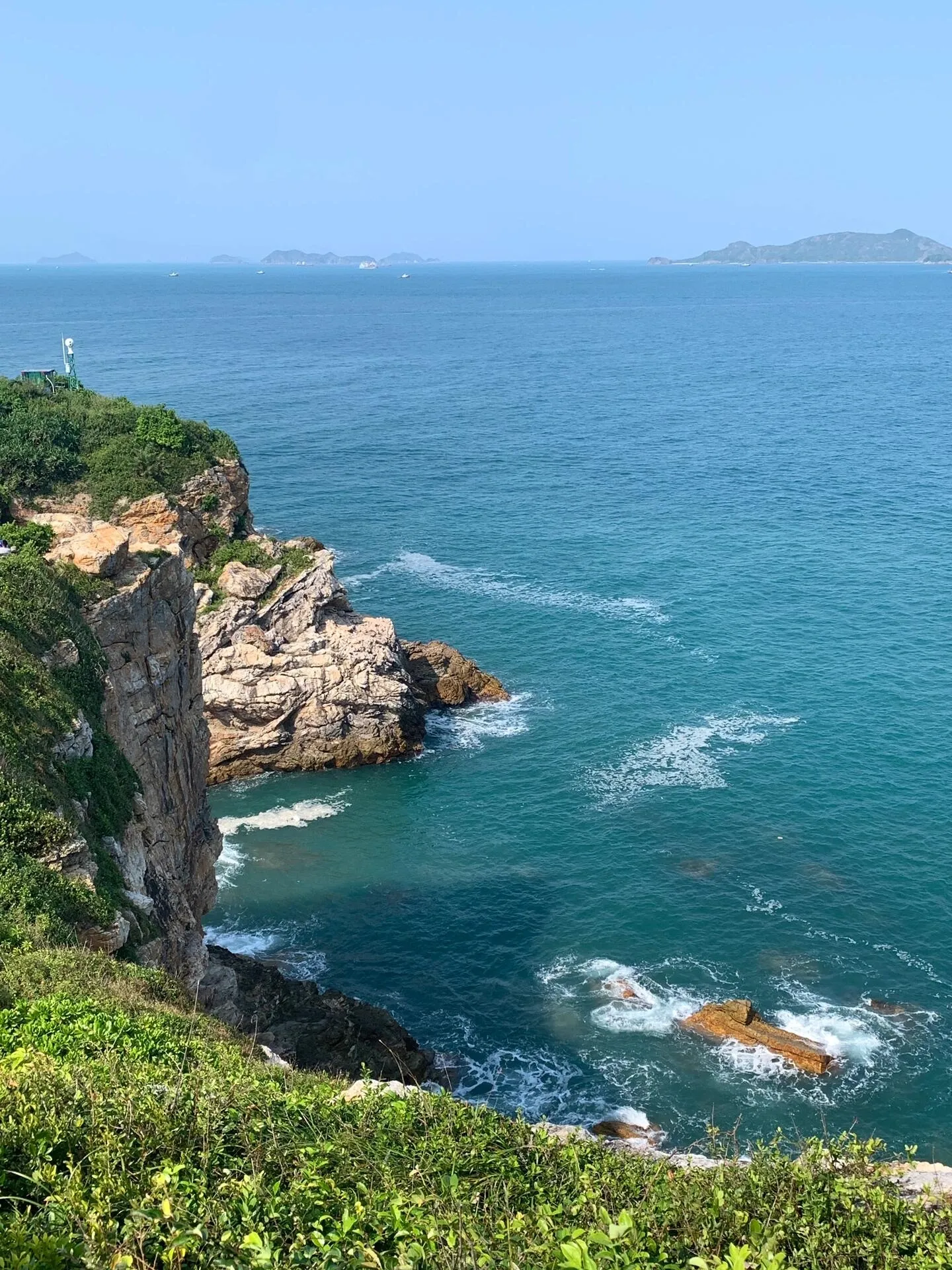 从杨梅坑乘船到鹿嘴山庄,单程30元,十几分钟的海上之旅很是惬意。下船后需要爬一小段路才能到达美人鱼的拍摄地,但这里绝对是此行最美的地方。翡翠蓝的海水,海浪拍打着耸立的小山,断崖与蓝海交织,仿佛置身于电影场景中。