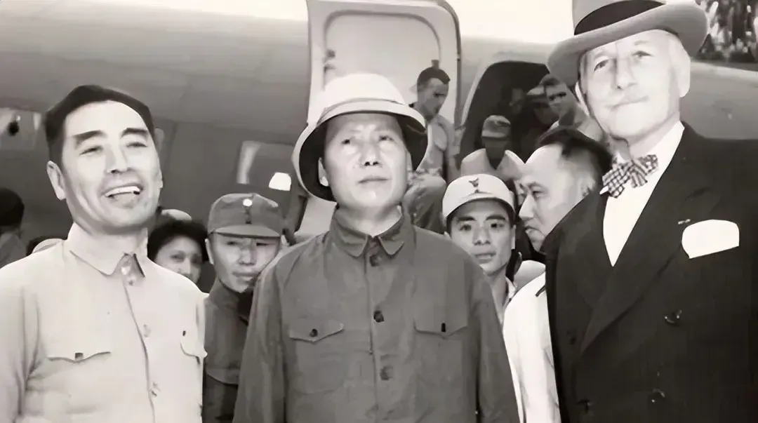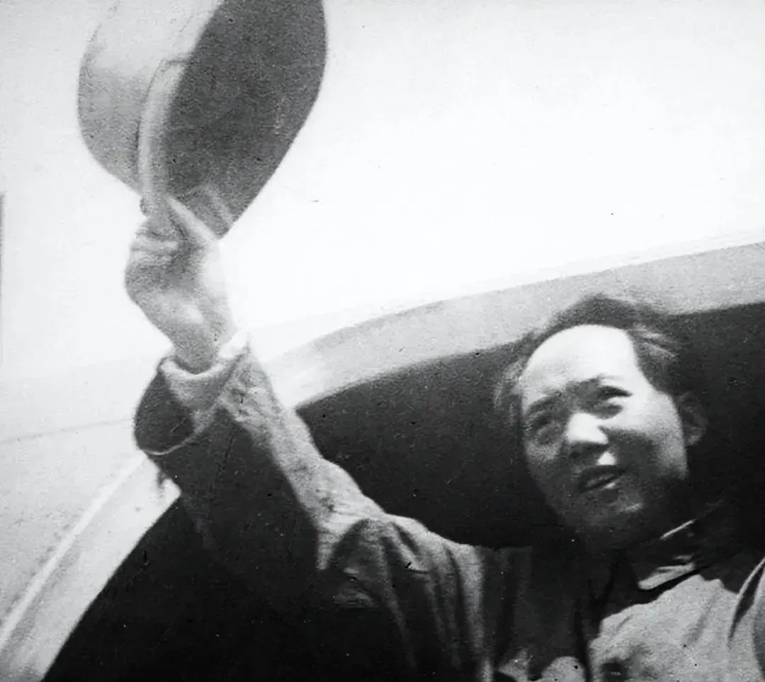 飞机抵达重庆后,毛主席走下舷梯,看到来迎接的重庆民众与各界人士,再次换下帽子,挥动致意,他自信而从容、平易近人的举动让在场外国记者赞叹不已。