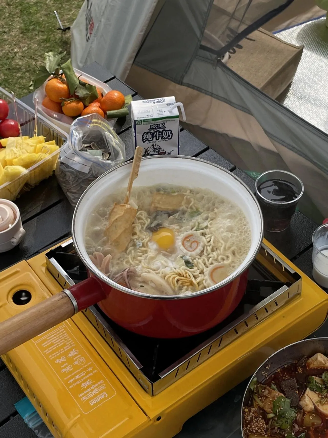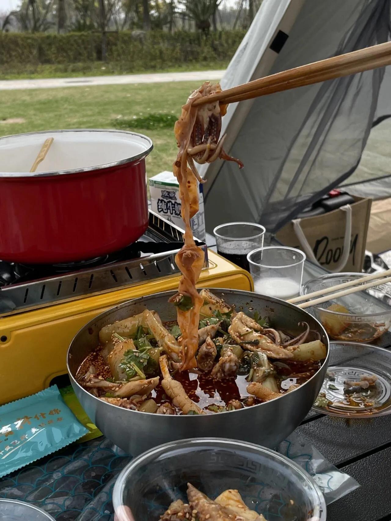 钵钵鸡:超级实用!食材提前在家里煮熟打包,网上买现成的酱汁包,到了营地先泡起来再去搭帐篷。等装备搭好差不多也可以吃了,方便又美味!注意鸡翅鸡爪这些肉类记得煮之前先腌制一下会更入味。