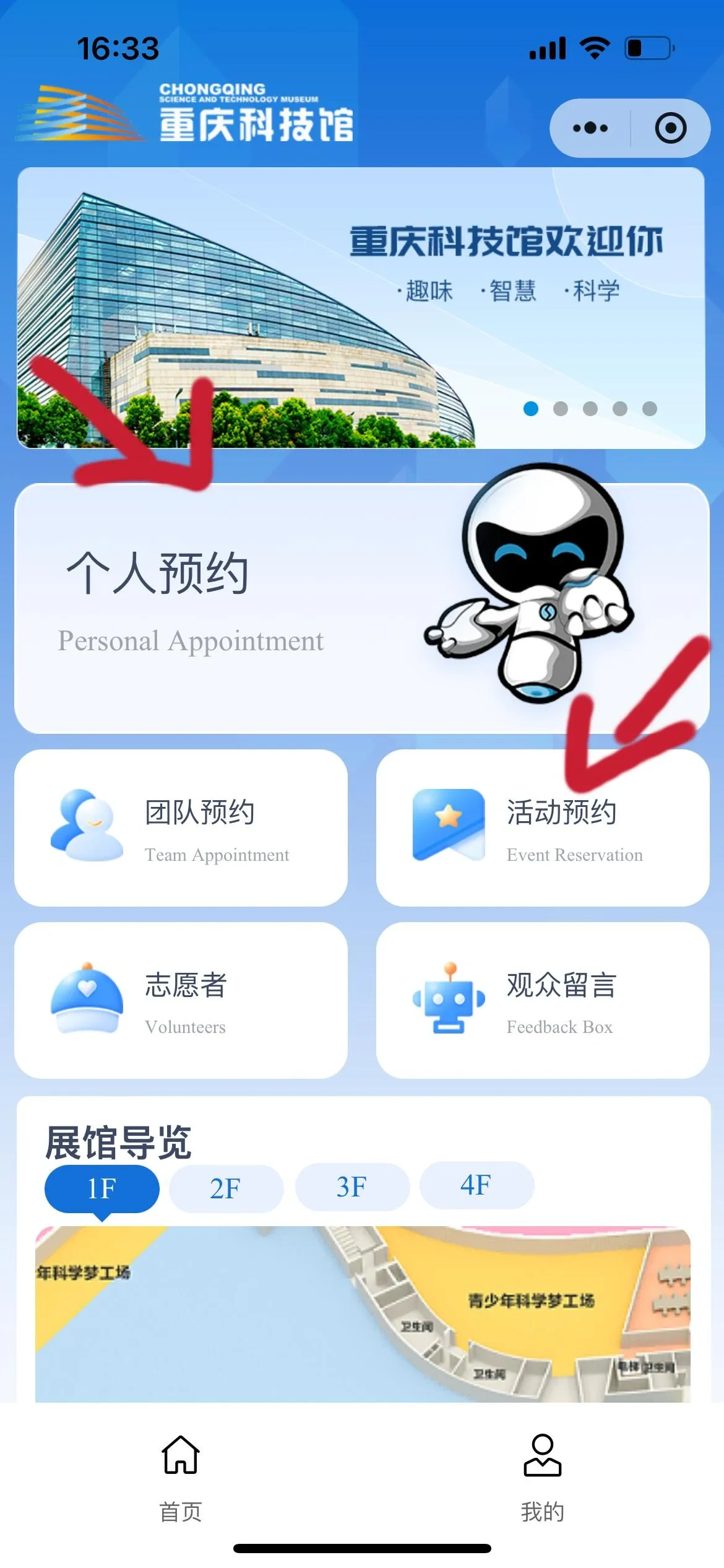 门票:免费预约,提前一天在公众号“重庆科技馆”预约,“科学城堡”在同个公众号【活动预约】【展项预约】预约(当天0点开始)
