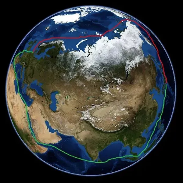 红线为北极东北航道,绿线为传统海上航线