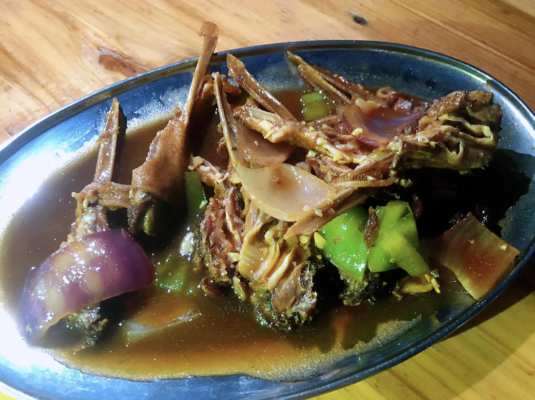 除了蛮牛,这里的其他菜品也值得一试。炒湿粉虽不是招牌菜,却意外地美味。特色炒田鸡据说非常好吃,可惜当天售罄未能品尝。炸鸭翅味道不错,但可能不适合牙口不好的人。炒鸭下巴则是另一道惊喜之作,比普通鸭下巴更入味,让人回味无穷。此外,野生小河虾脆脆的很下酒,炒钉子螺是海南人的最爱,当然还有海南特产椰子水来解暑。
