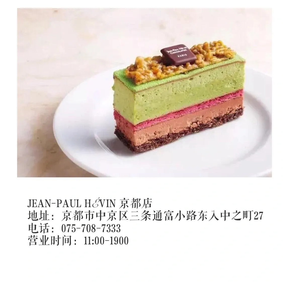 JEAN-PAUL HÉVIN在京都开设了日本第一家路面店。 使用京都老字号一保堂茶铺的高级抹茶,由一流甜品师研发的抹茶味蛋糕、马卡龙、玛德琳蛋糕每天限量供应。店内最受欢迎的是京都限定白味噌抹茶巧克力慕斯,入口瞬间便能感受到它的美味。
