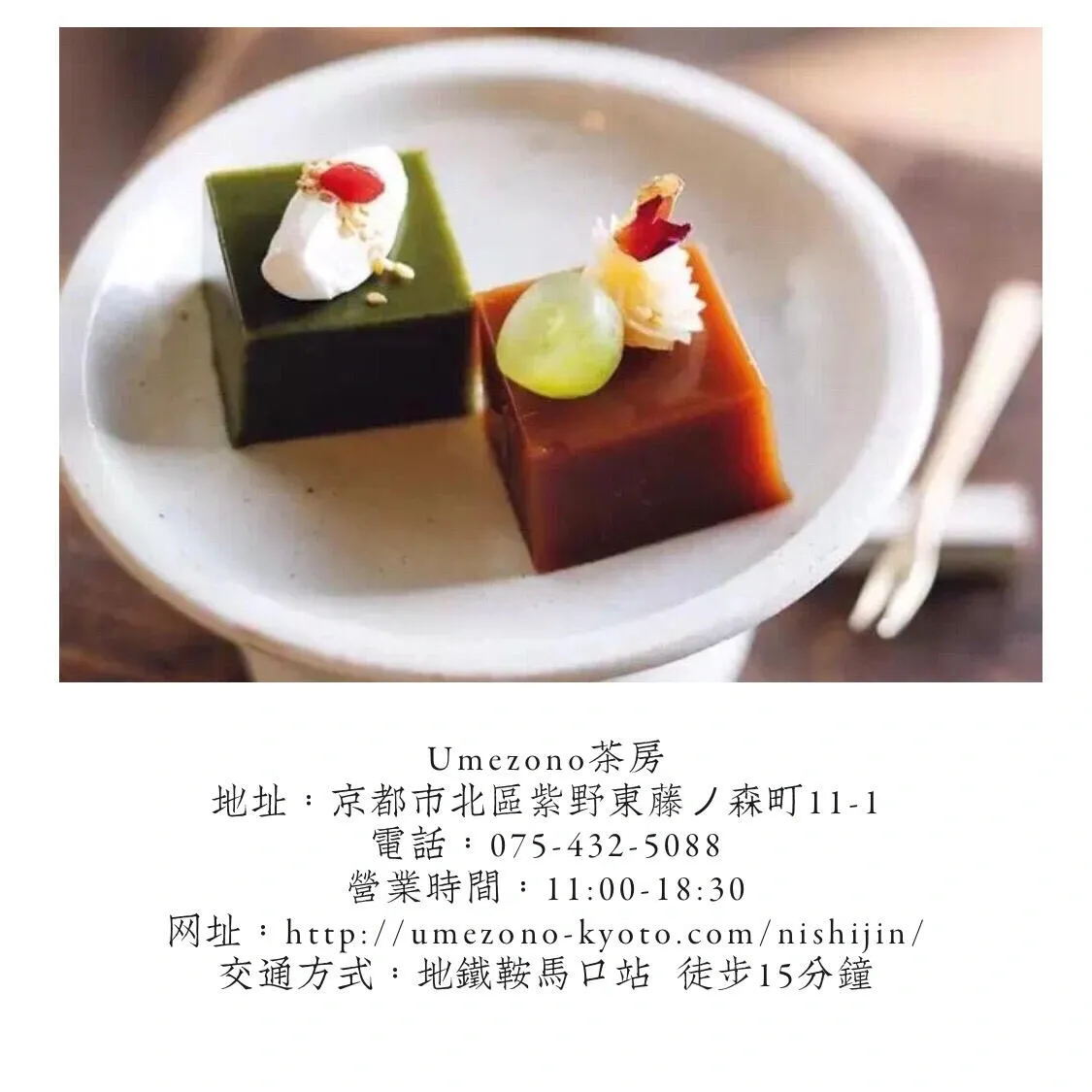 传统甜品屋“梅园”将町家改装成上下两层全日式传统空间。一楼可以买甜点,二楼则是咖啡馆。店内最受欢迎的是传统羊羹,将寒天与蕨粉融合,配上天然红豆,甘甜不腻。春夏季限定的抹茶羊羹更是不容错过,但需要早去,晚了就买不到了。