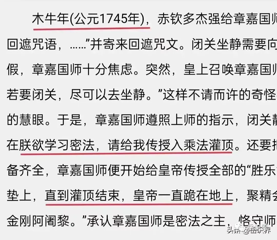 据故宫博物院宫廷部副研究馆员王子林考证,乾隆五十一年(1786年)三世章嘉圆寂后,其弟子洛桑却吉尼玛撰写的《章嘉国师若必多吉传》描绘了乾隆年轻时跪受灌顶的场景:章嘉国师朝见皇上时,皇上说:“朕欲学习密法,请传授入乘法灌顶。