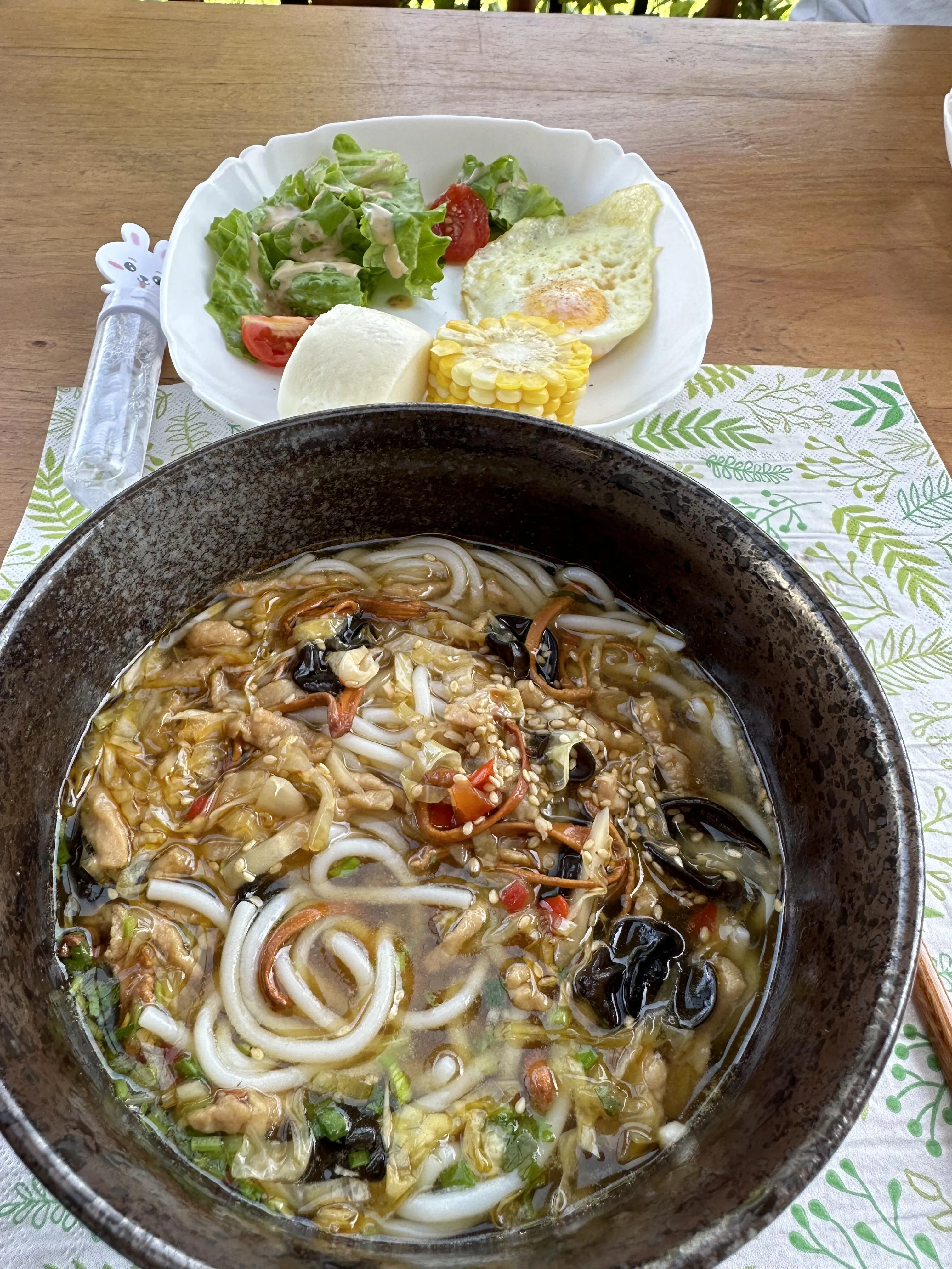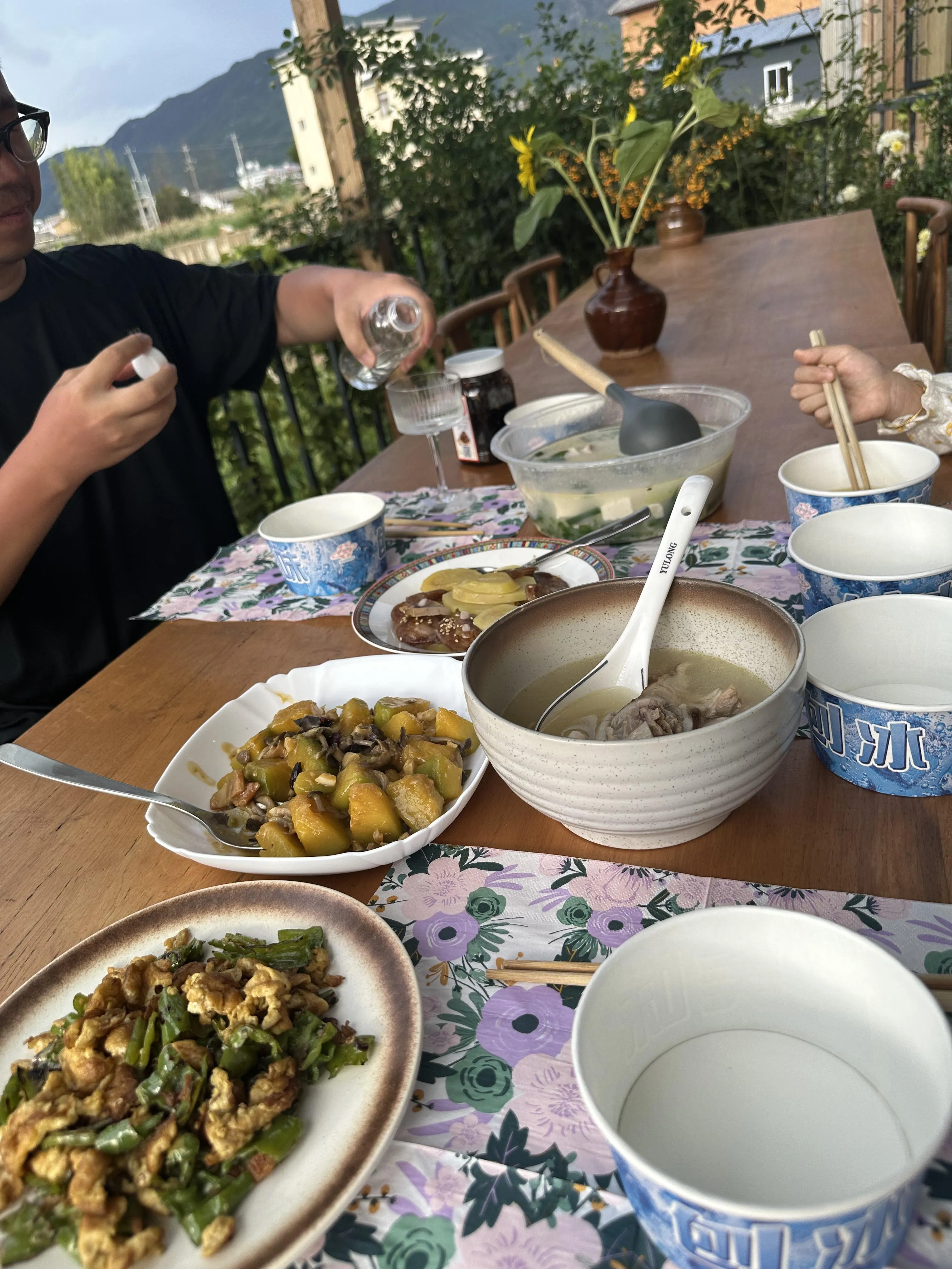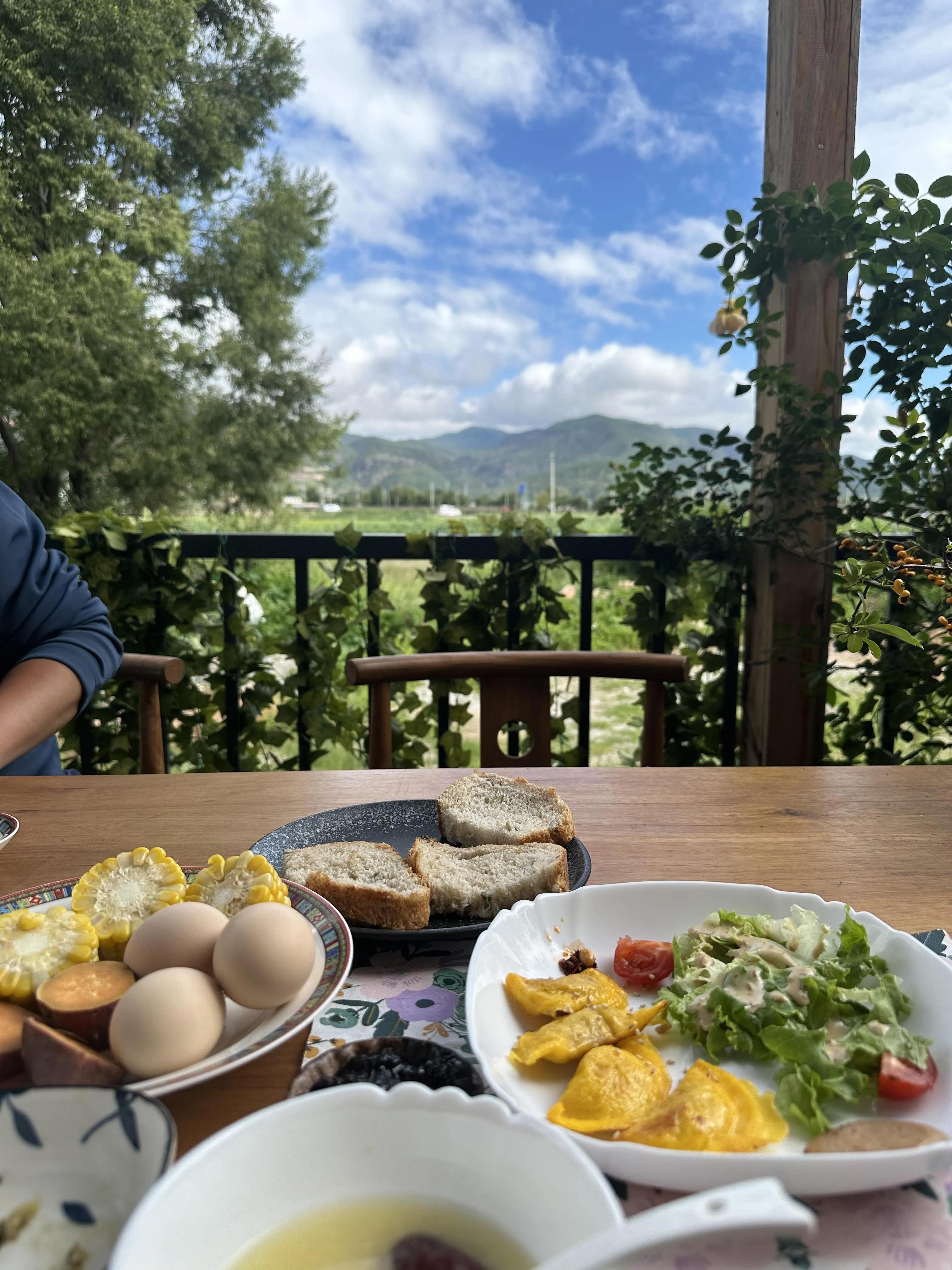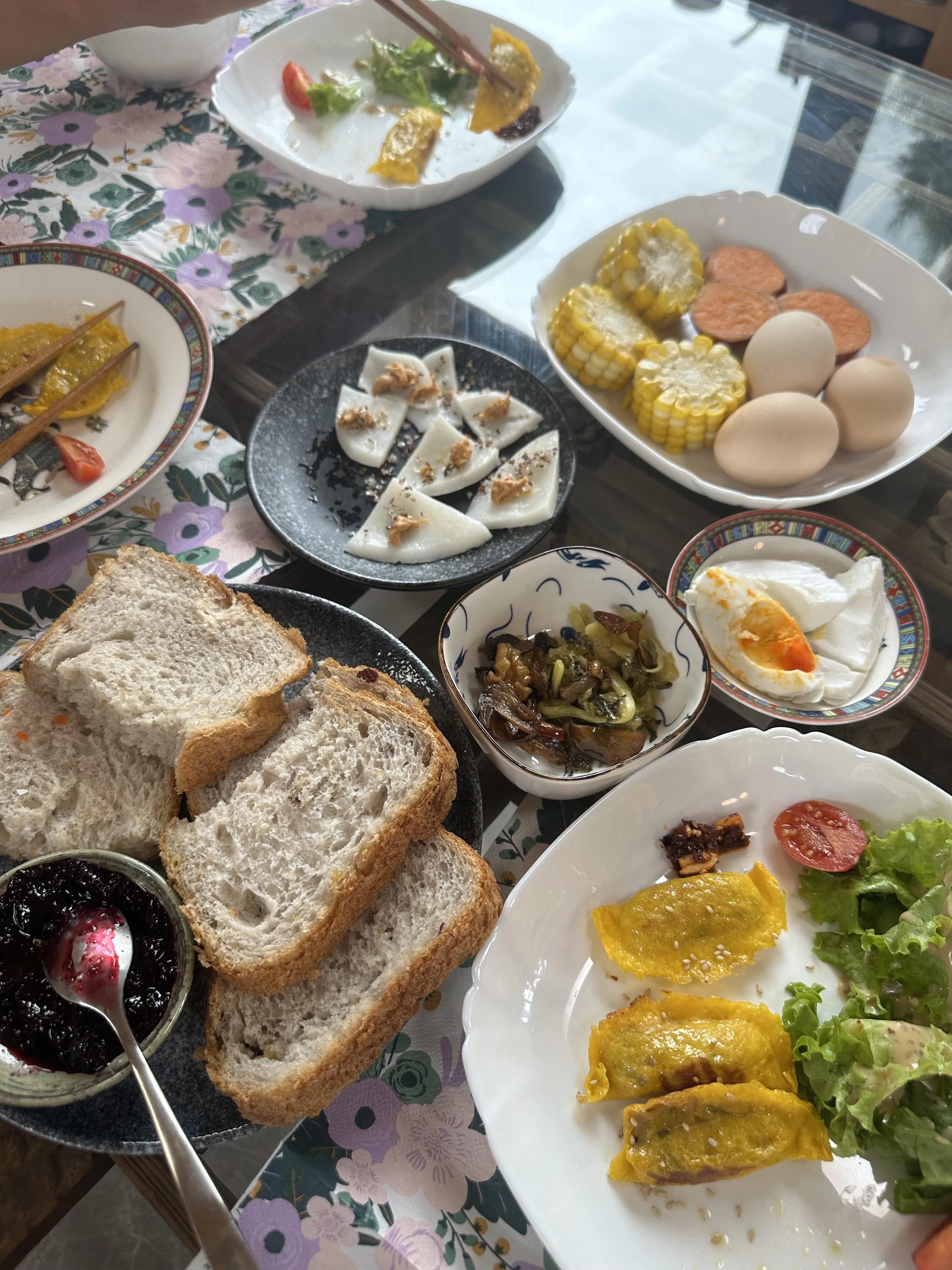 雪飞姐家的 早餐真的让人惊艳。 豆浆都是用有机黑豆和黄豆一起打的,还有牛奶或者咖啡可供选择。自己包的牛肝菌饺子,自制酸奶饼上面各种坚果干果,自己熬的蓝莓酱,米线的味道也是超级棒。还有一口一个好吃无敌的鸡蛋饺子,就连咸菜也好吃,每天都吃光盘,不够还可以加。