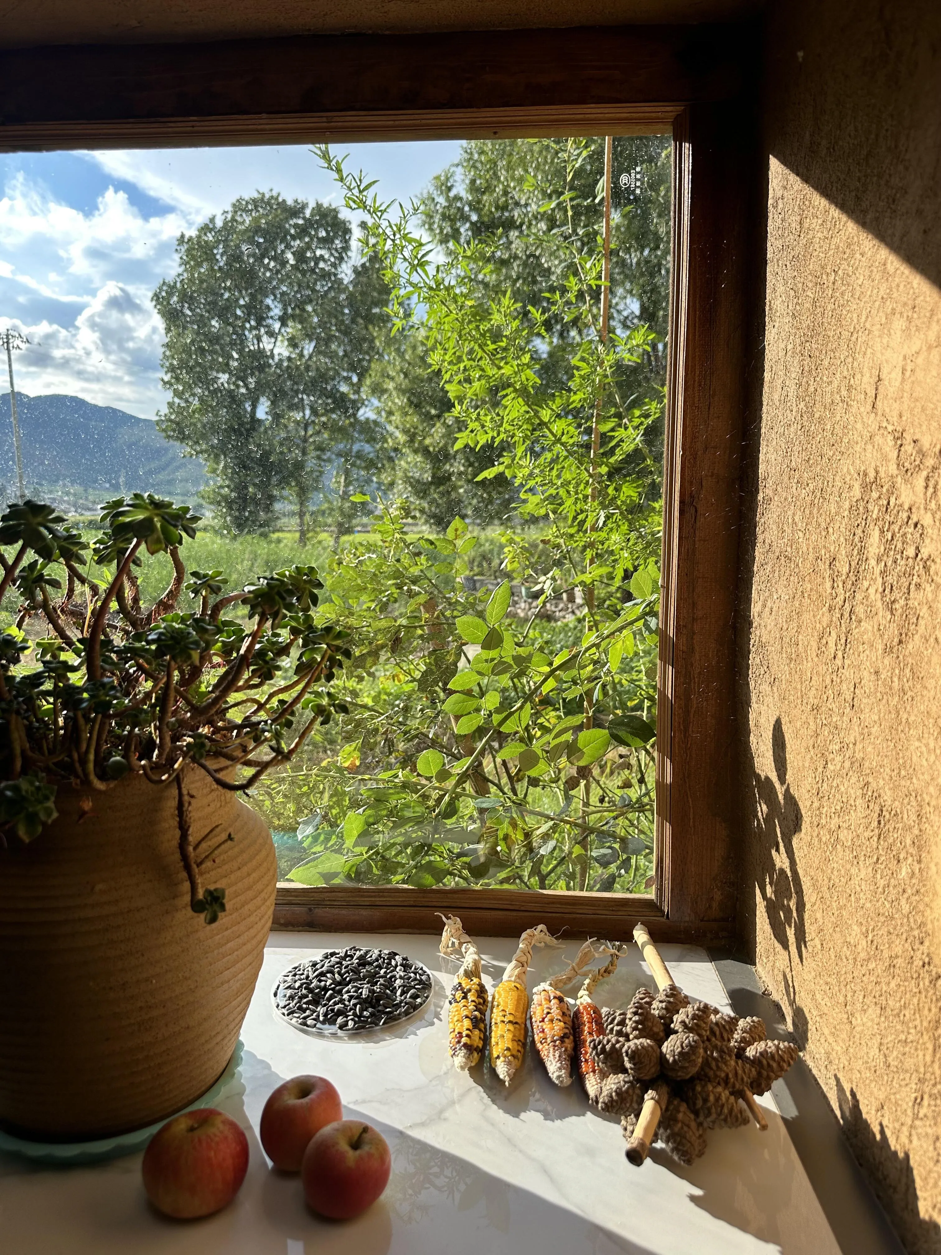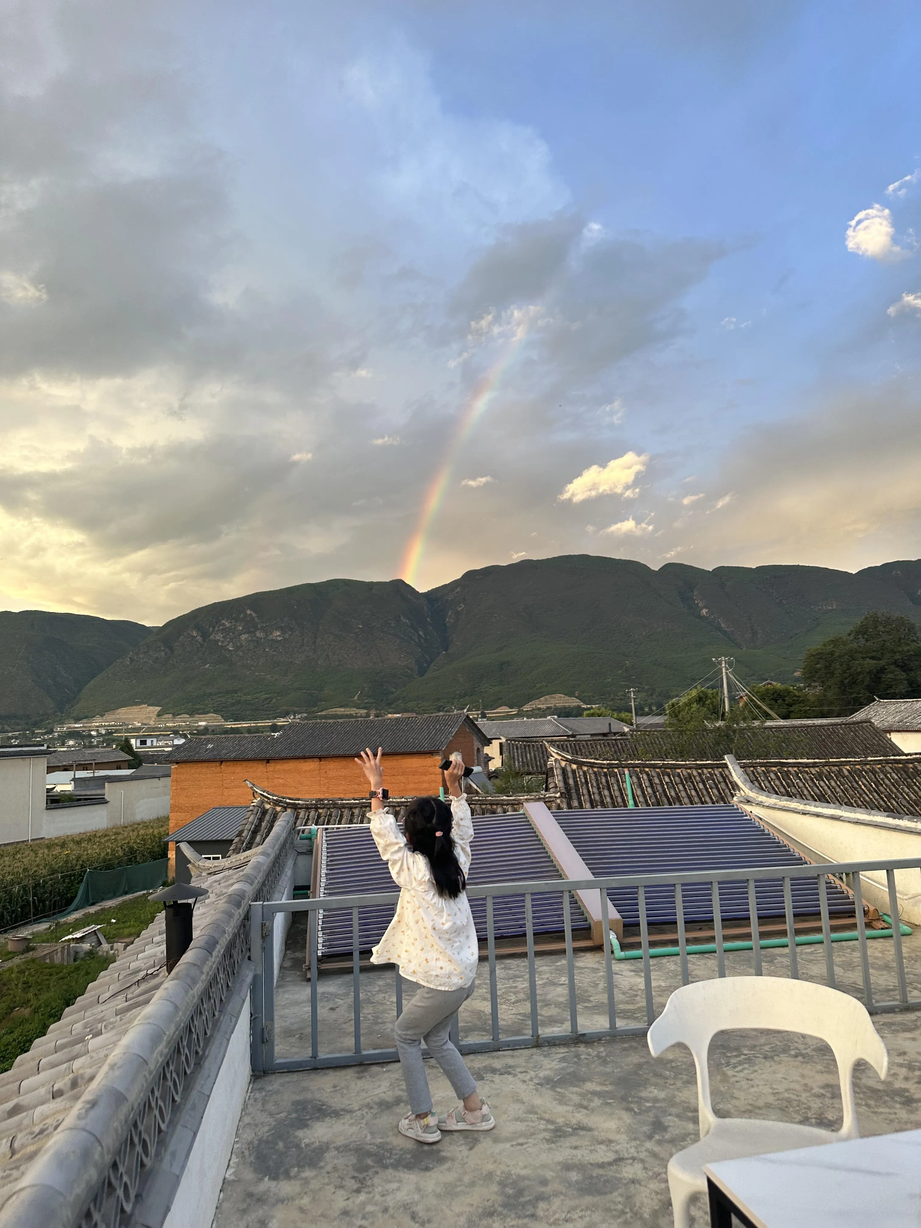 雪飞姐对生活有自己的态度, 食材都选择有机的 ,床品和毛巾也很舒服,给人一种很干净的家的感觉,房间里的香薰散发淡淡的香气。整个院子有五间客房,有两间亲子的一家三口的也可以。二楼还有一间书房,可以看电视写作业。天台可以晒衣服,晚上可以看星星。我们有一天幸运的看到了彩虹。