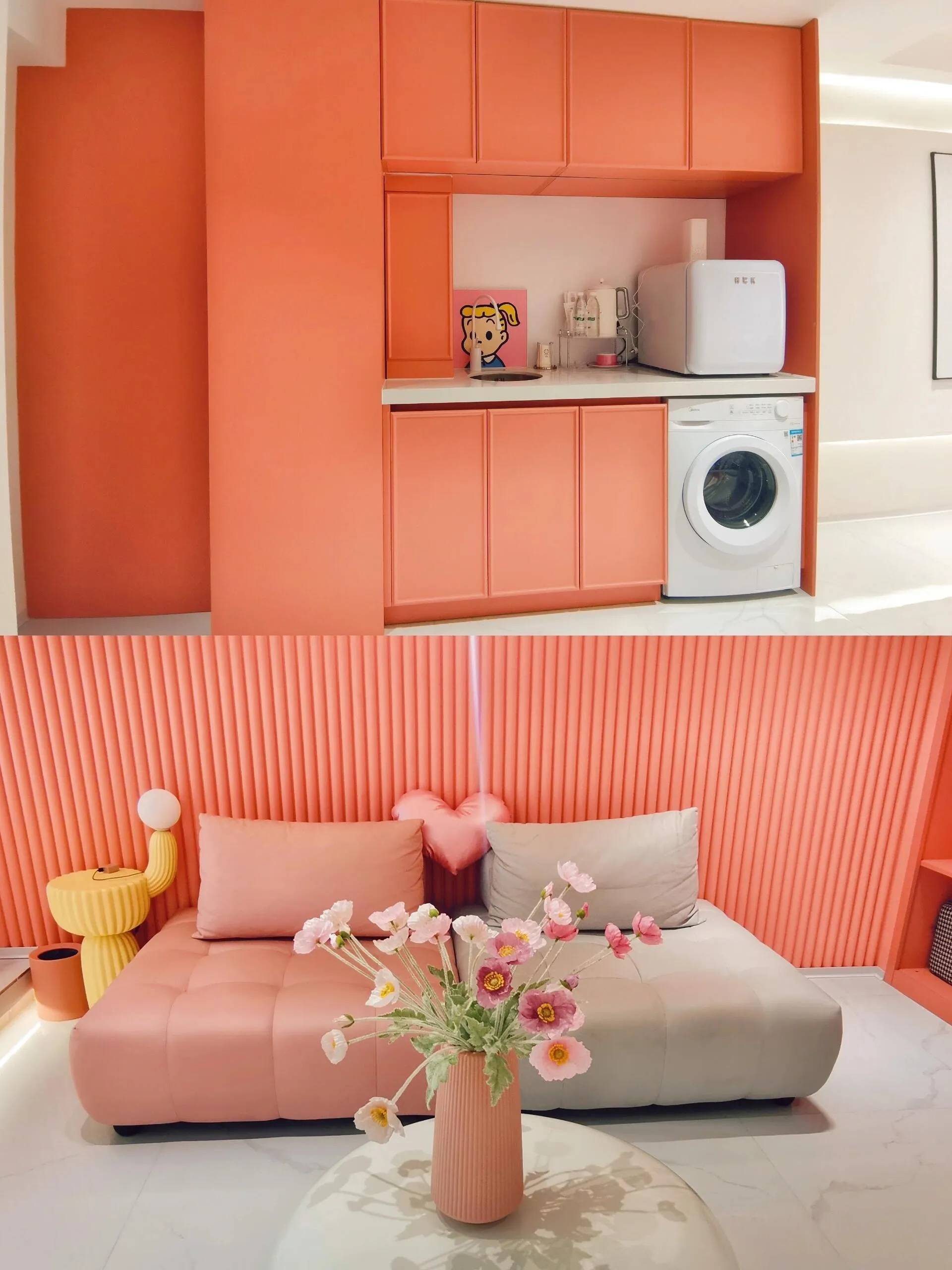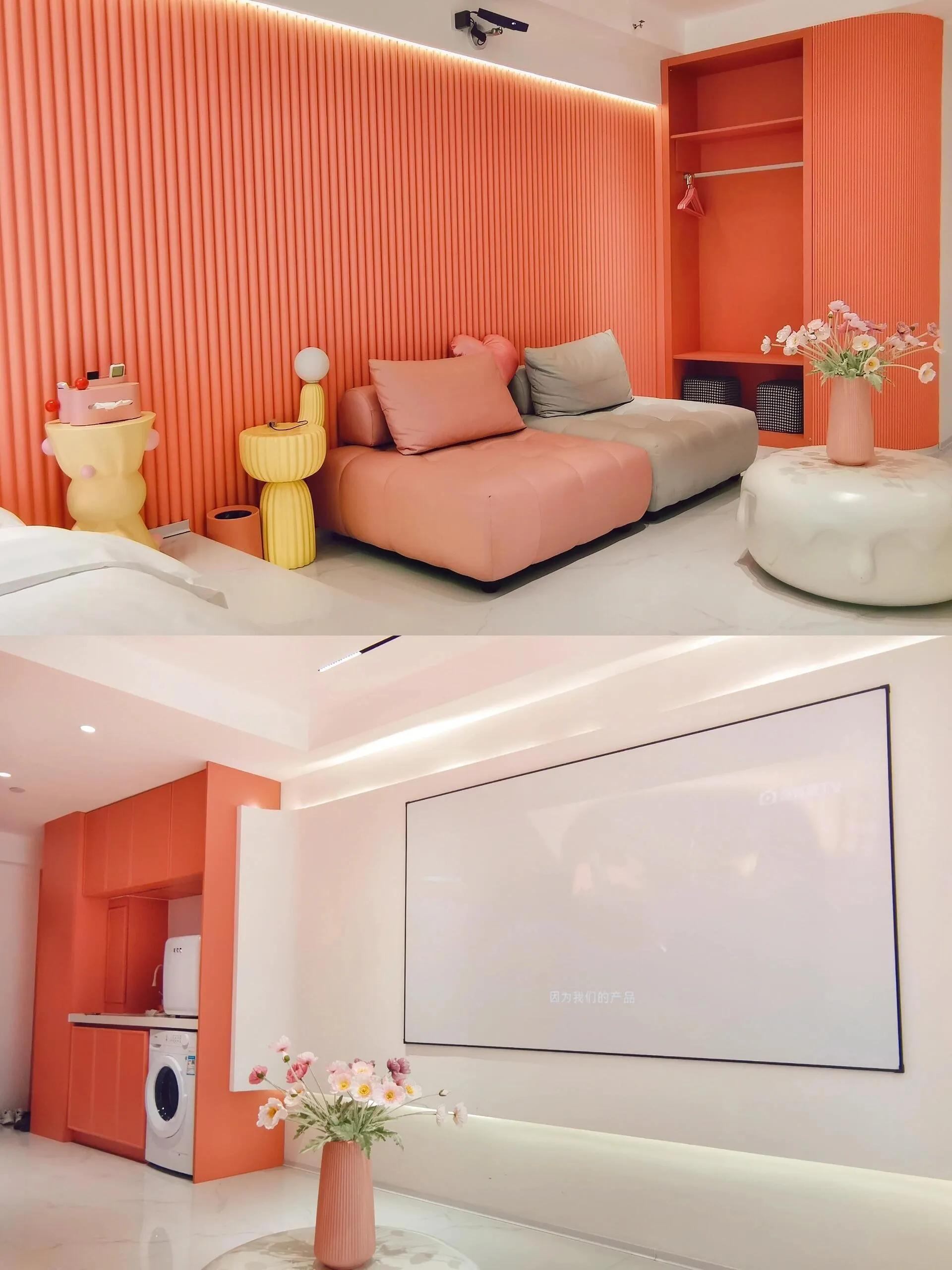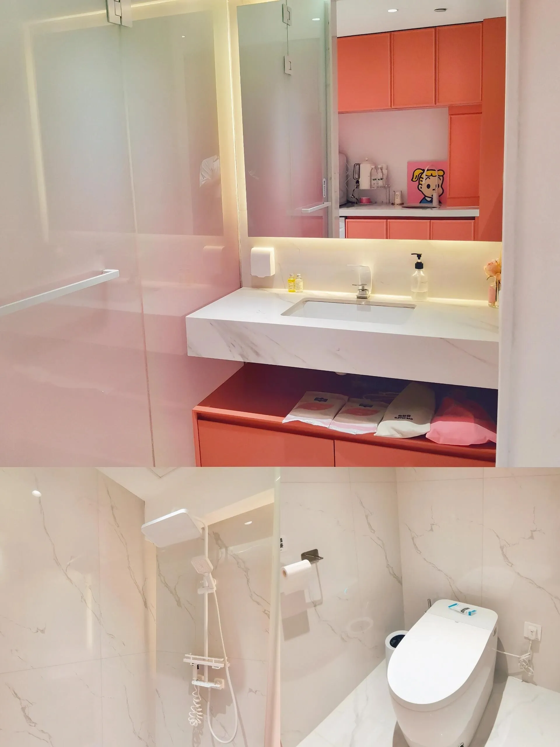 房间面积约50平方米 ,为一室一卫的公寓房型。一进门就给人宽敞的感觉,配有一张可睡2人的榻榻米,非常适合情侣或闺蜜入住。 整体装修风格以粉色为主 ,非常可爱,从入门的橱柜到卫生间的玻璃都采用了粉色系,营造出一种温馨浪漫的氛围。