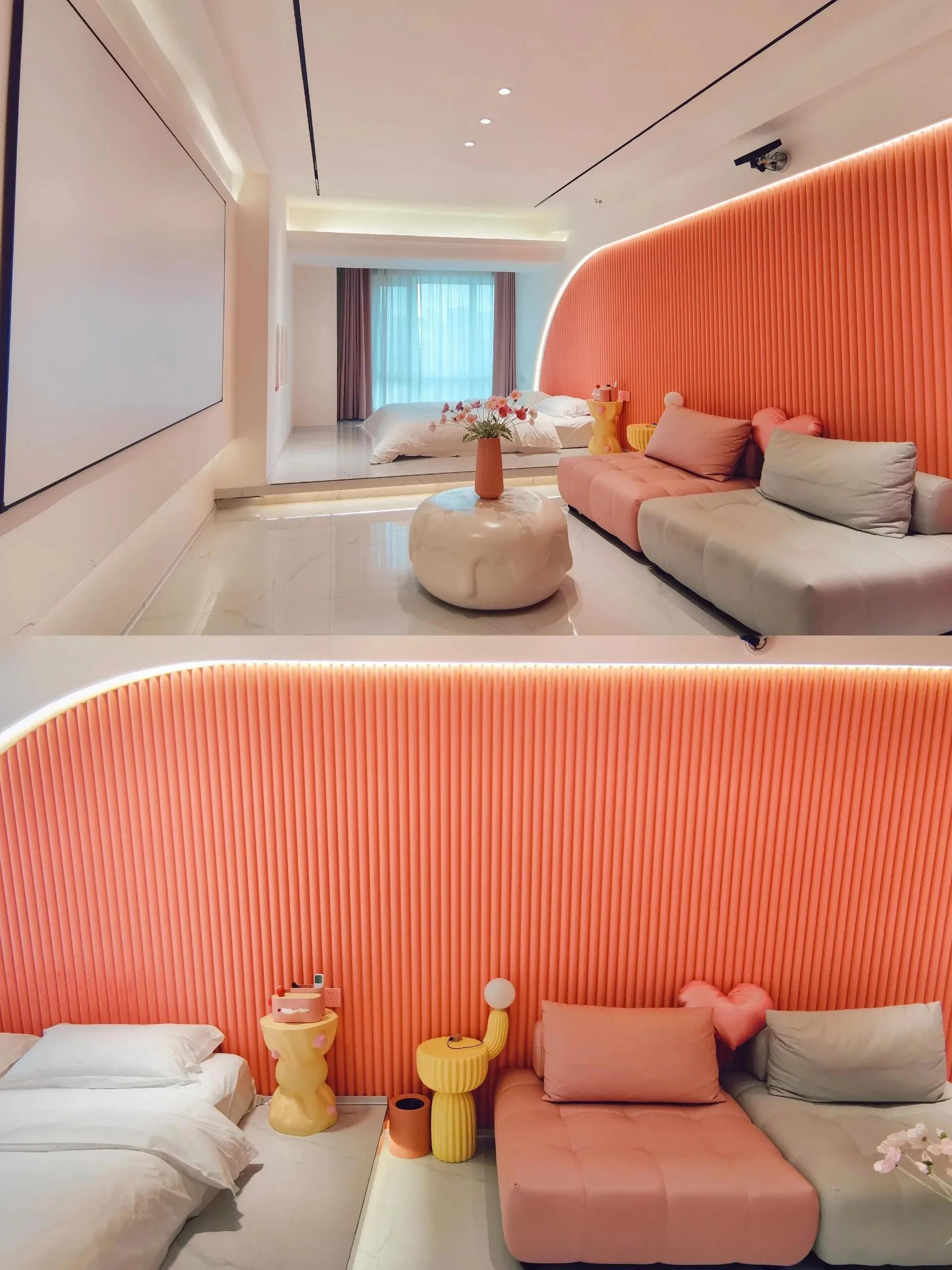 设施方面, 民宿配备了全屋智能系统 ,包括智能马桶、电动窗帘,还可以通过小爱同学控制窗帘和空调。此外,还提供大屏投影和百寸幕布,卫生间采用干湿分离设计,小冰箱和洗衣机一应俱全,可以说设施相当完善。